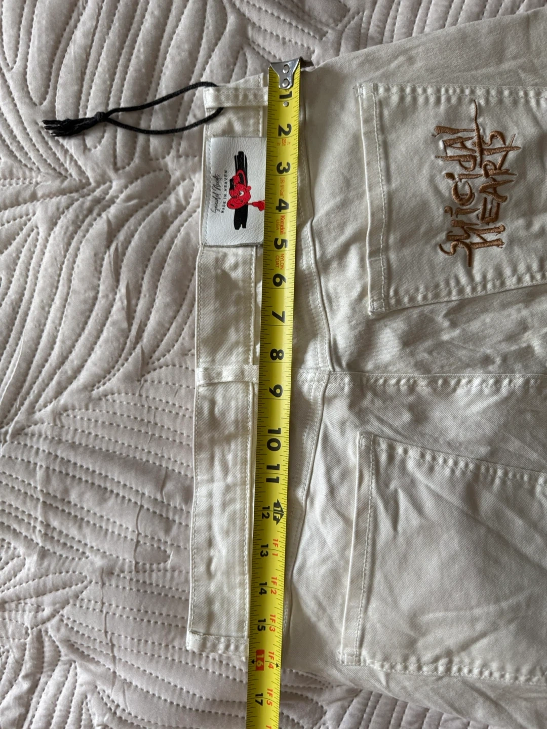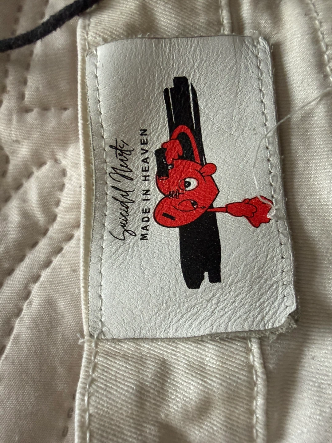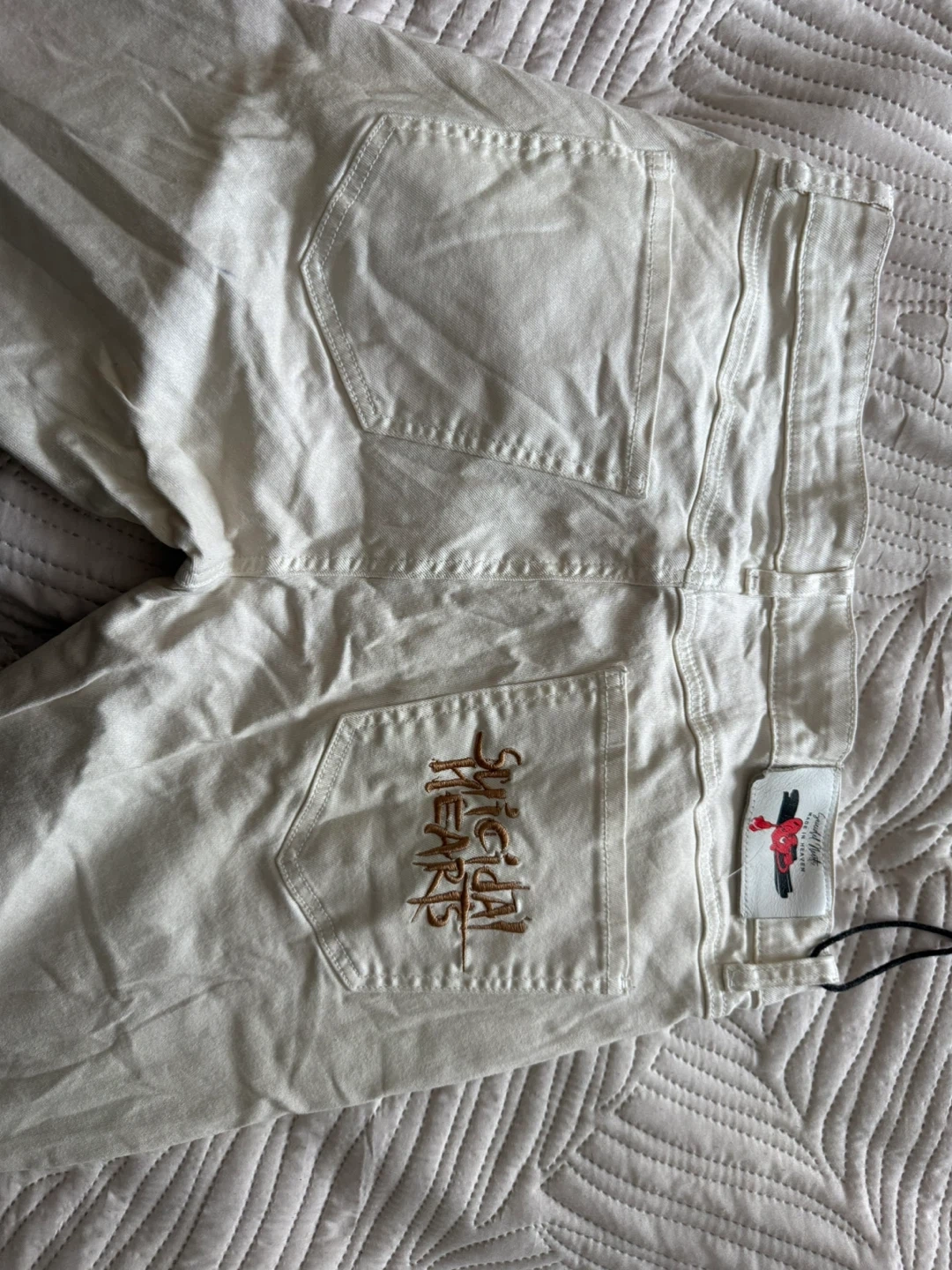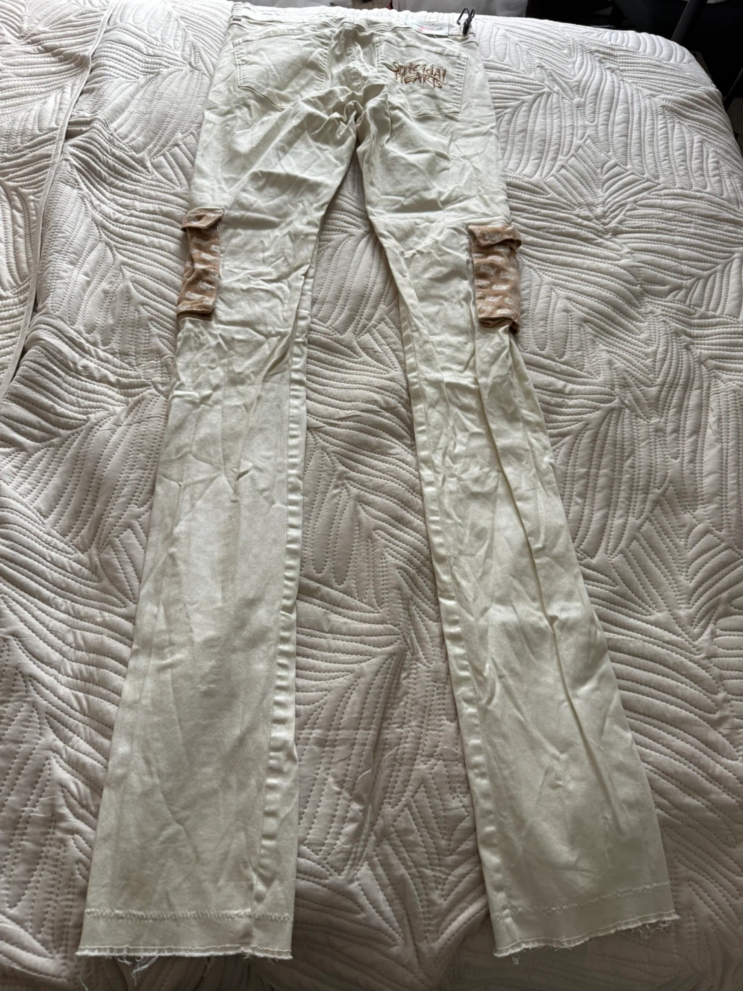 Suicidal Hearts stacked cargo jeans in cream / off white color.