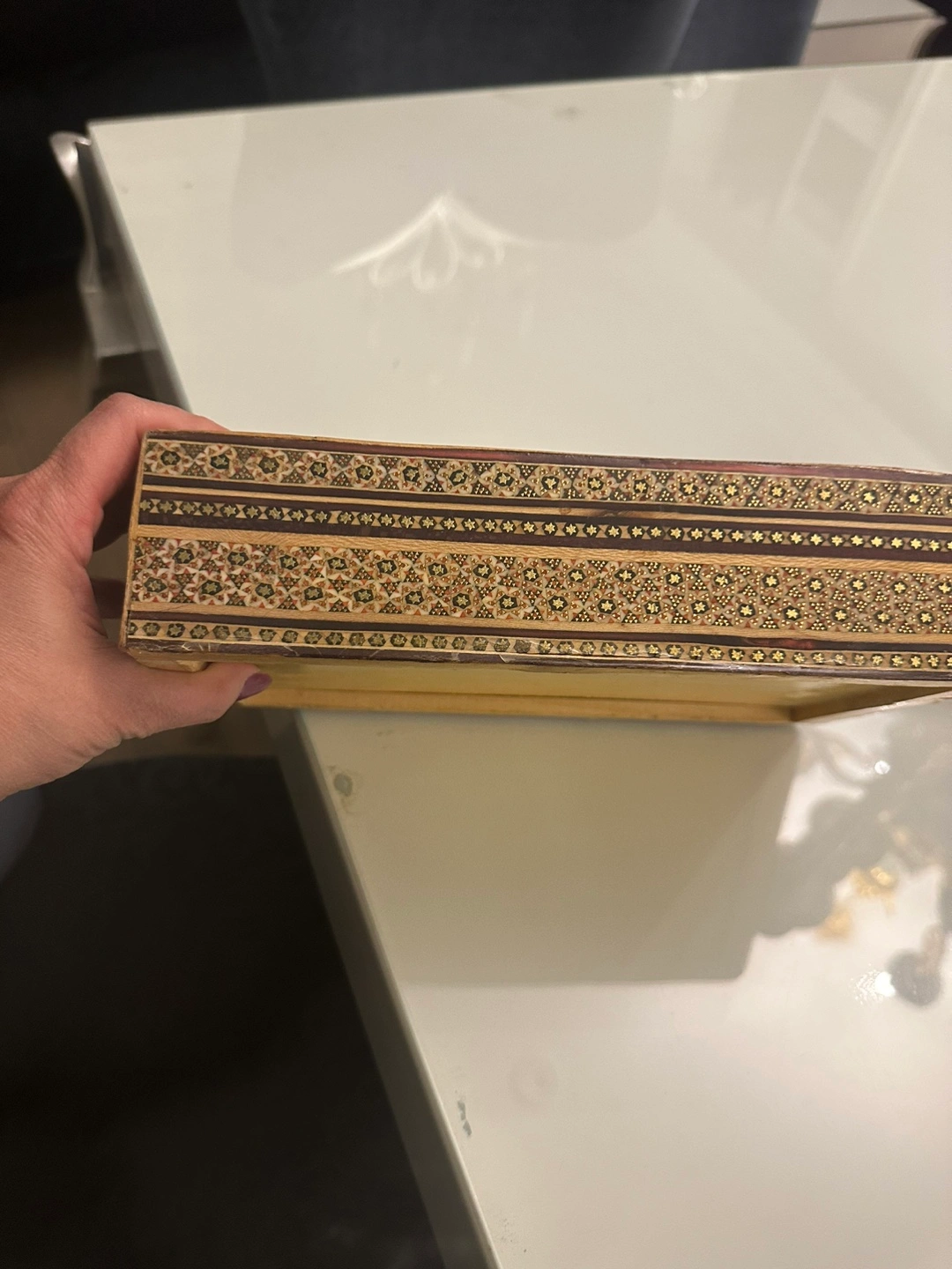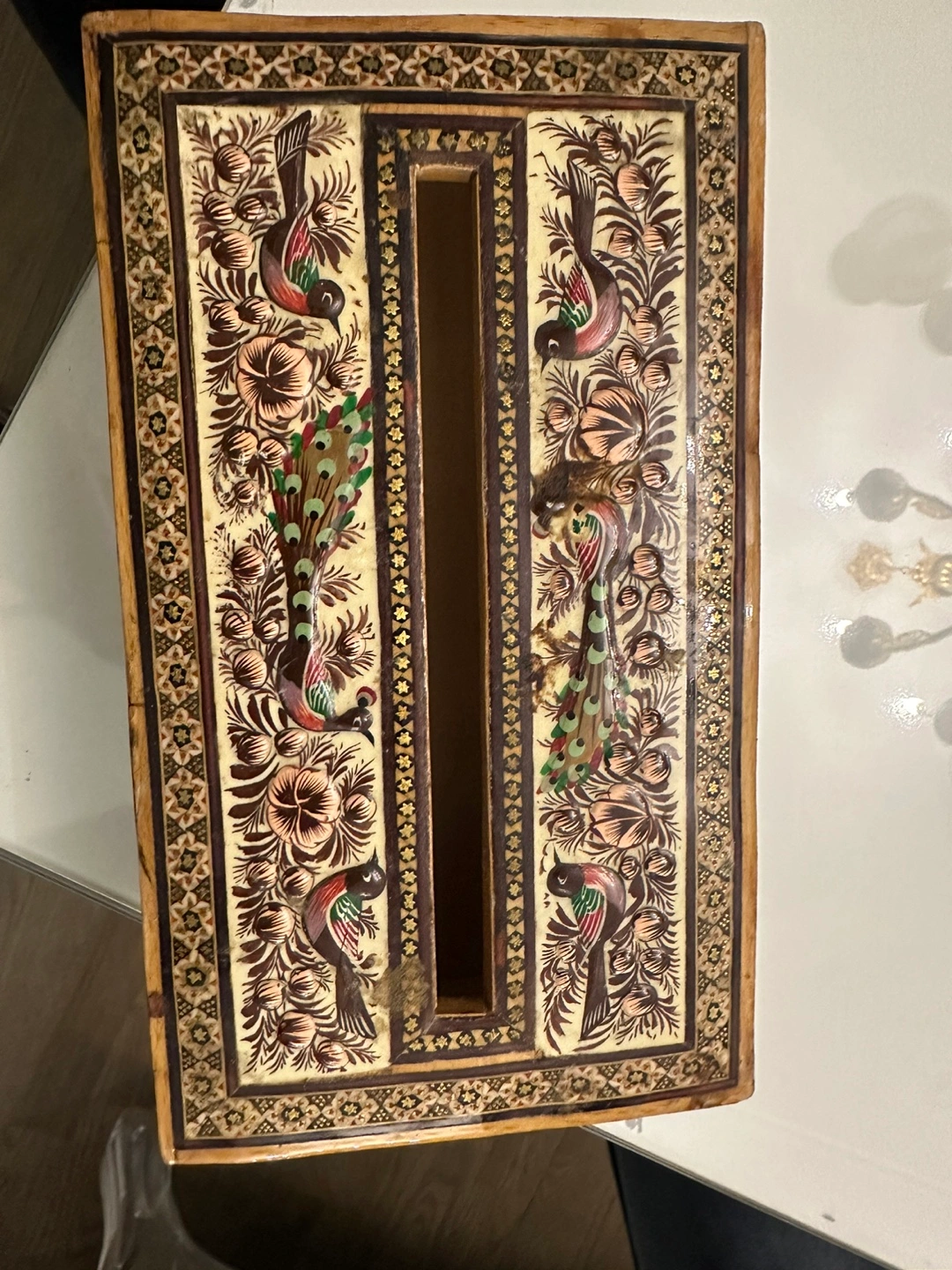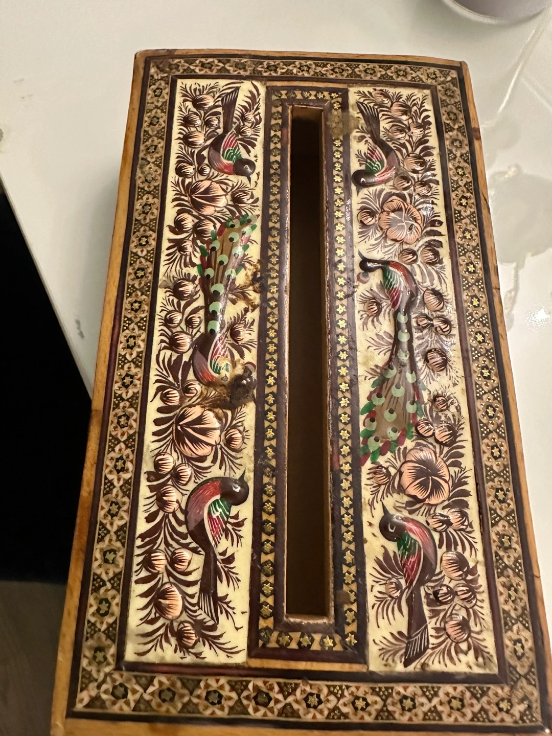 Wooden tissue box with intricate details. Features decorative birds and floral patterns. Borders with geometric patterns. This tissue box makes a soothing addition to any room.