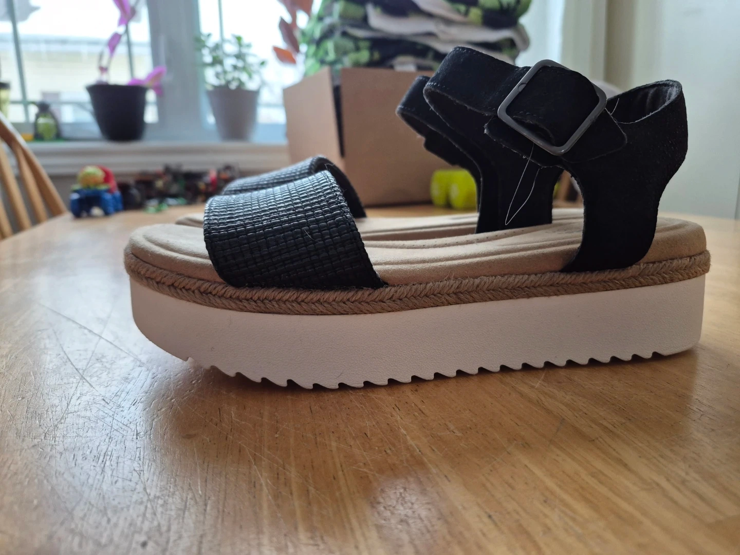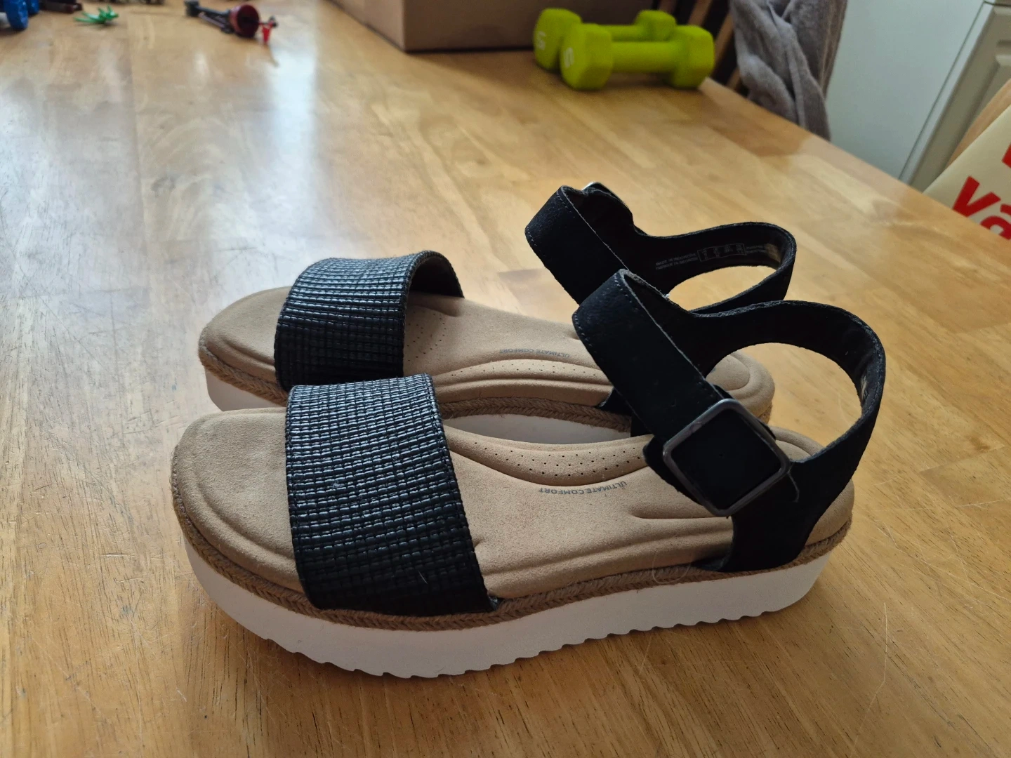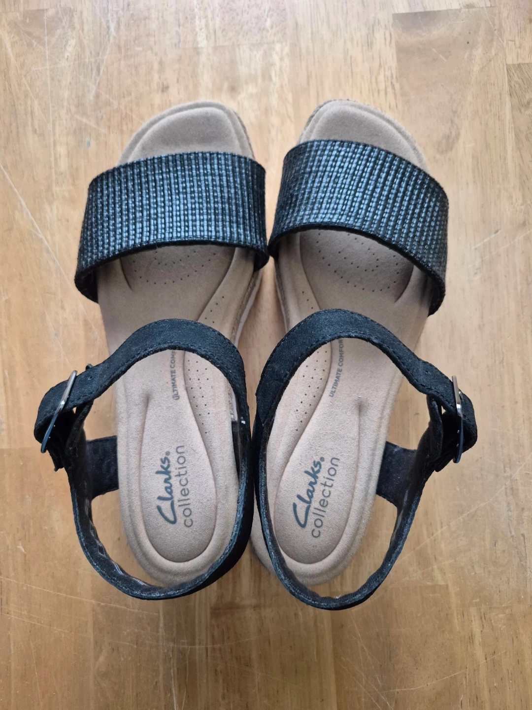 These Clarks Collection sandals feature black woven straps and a platform sole. They have an adjustable ankle strap for a secure fit. Comfortable for everyday wear! Brand new! Have never been worn!