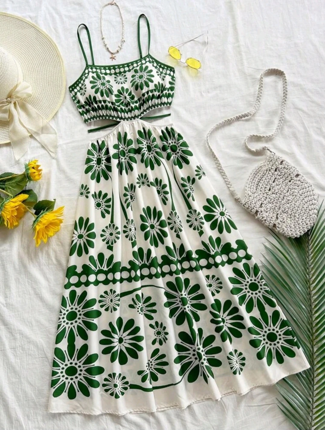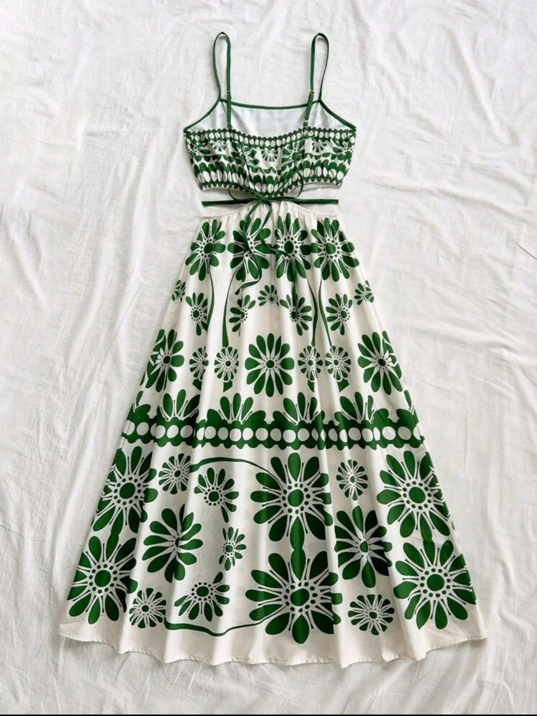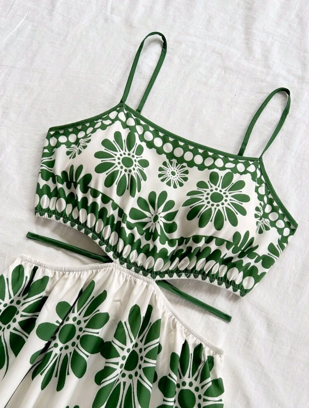 Cute dress with a green and white floral pattern! The top part is a cropped style with spaghetti straps, and the skirt part is a matching maxi length. Perfect for summer days!