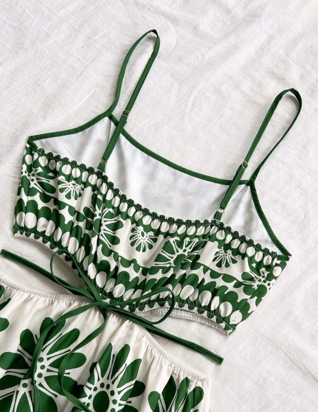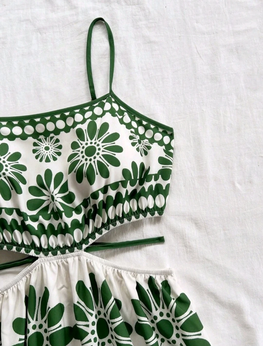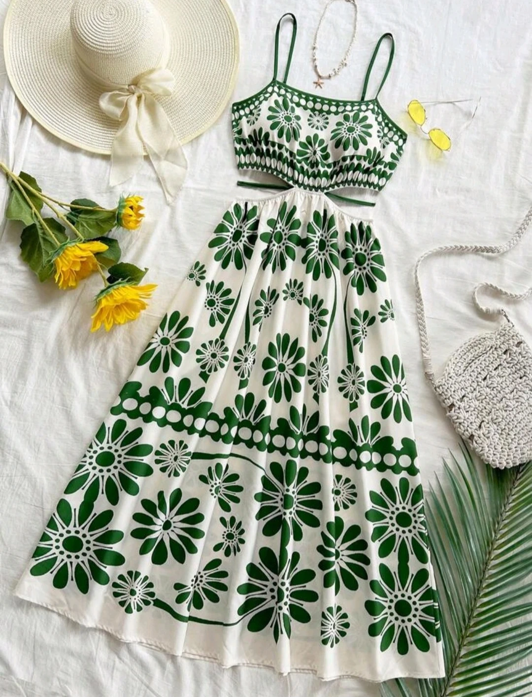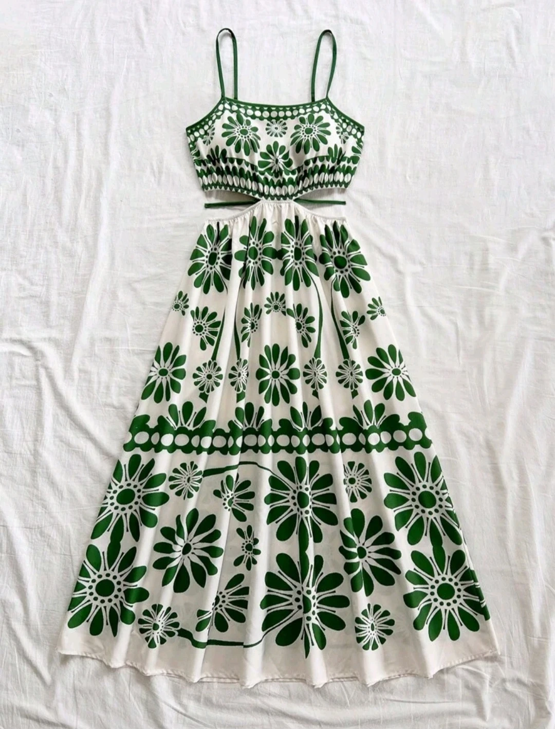 Cute dress with a green and white floral pattern! The top part is a cropped style with spaghetti straps, and the skirt part is a matching maxi length. Perfect for summer days!