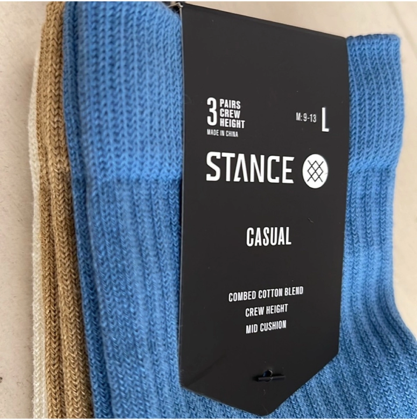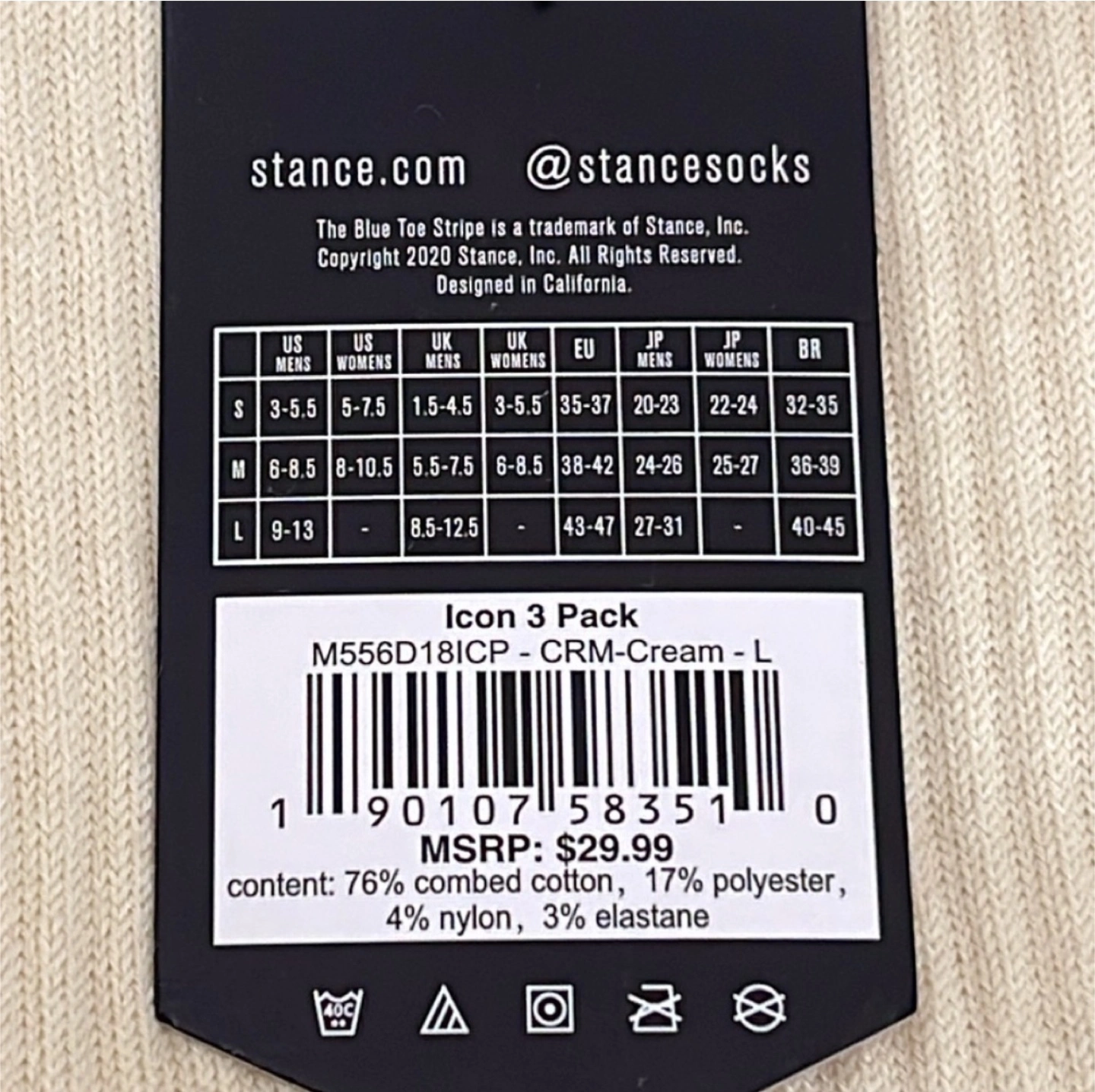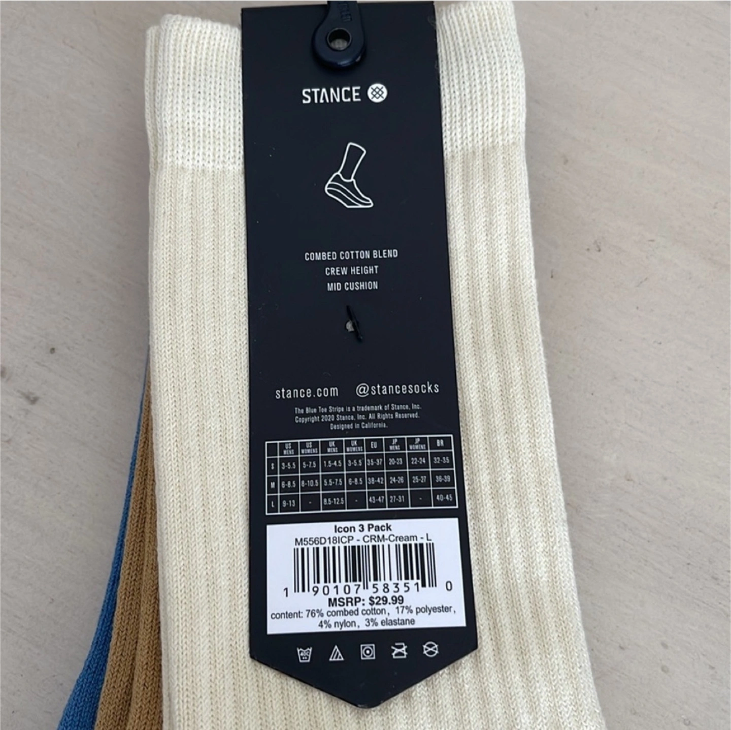 Here's a new pack of Stance Icon socks! They are size Large (M:9-13). This is a 3-pack of crew height socks with mid cushion. The socks are made of 76% combed cotton, 17% polyester, 4% nylon, and 3% elastane. MSRP: $29.99