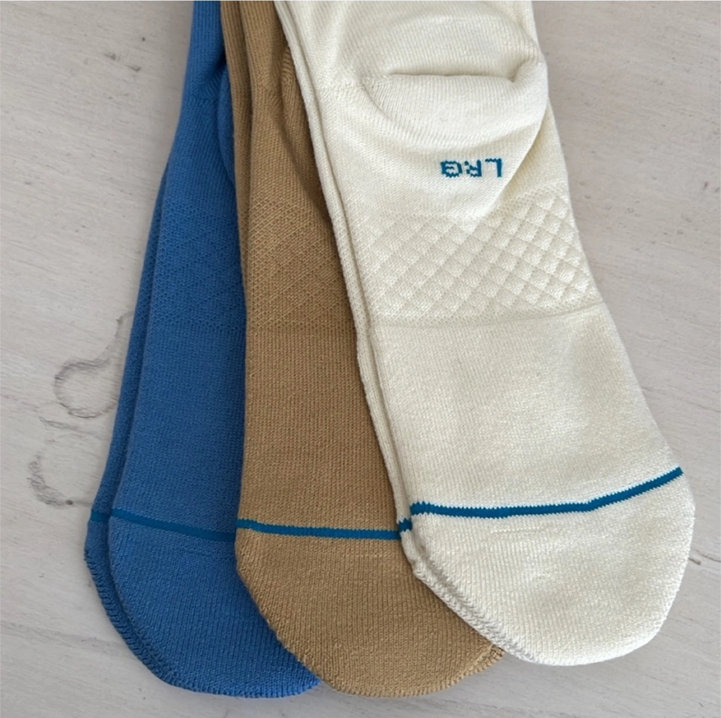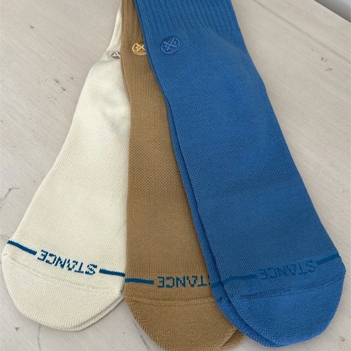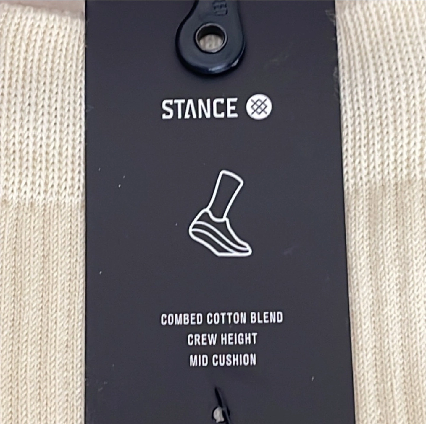 Here's a new pack of Stance Icon socks! They are size Large (M:9-13). This is a 3-pack of crew height socks with mid cushion. The socks are made of 76% combed cotton, 17% polyester, 4% nylon, and 3% elastane. MSRP: $29.99