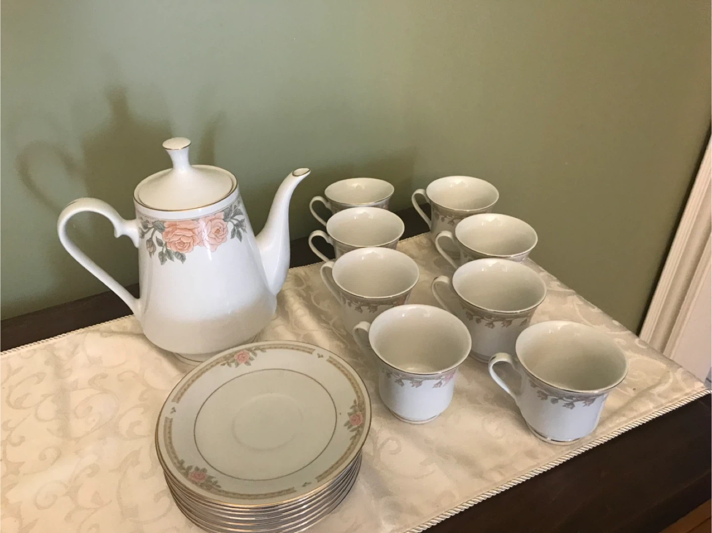 This vintage tea set includes a teapot and seven cups, made by Lynn's. The set features delicate floral accents. It's perfect for serving guests or enjoying a quiet afternoon tea.