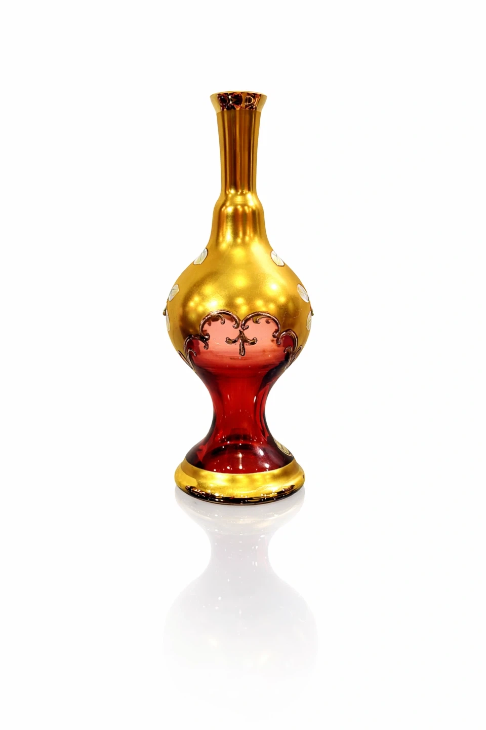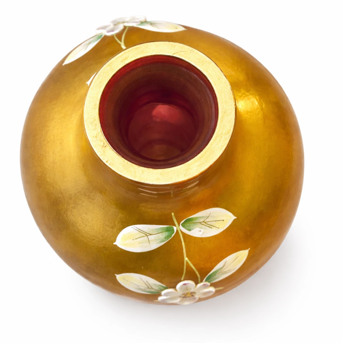 The surface is finished in a luminous gold wash, overlaid on deep ruby glass, a classic Bohemian decorative technique associated with mid-20th-century export glass. The vase is further embellished with raised and painted floral motifs—white blossoms with soft pink shading and green leaves—applied by hand, with fine line detailing visible under magnification.