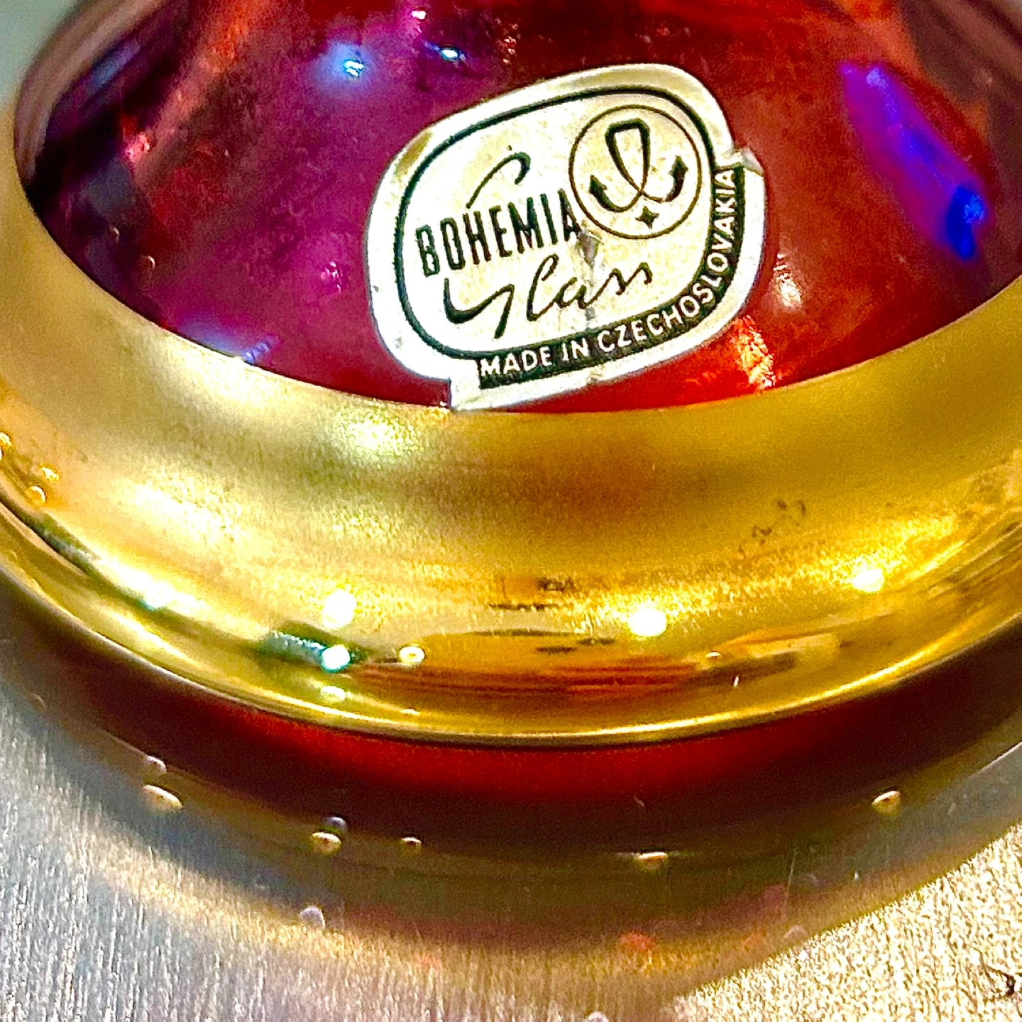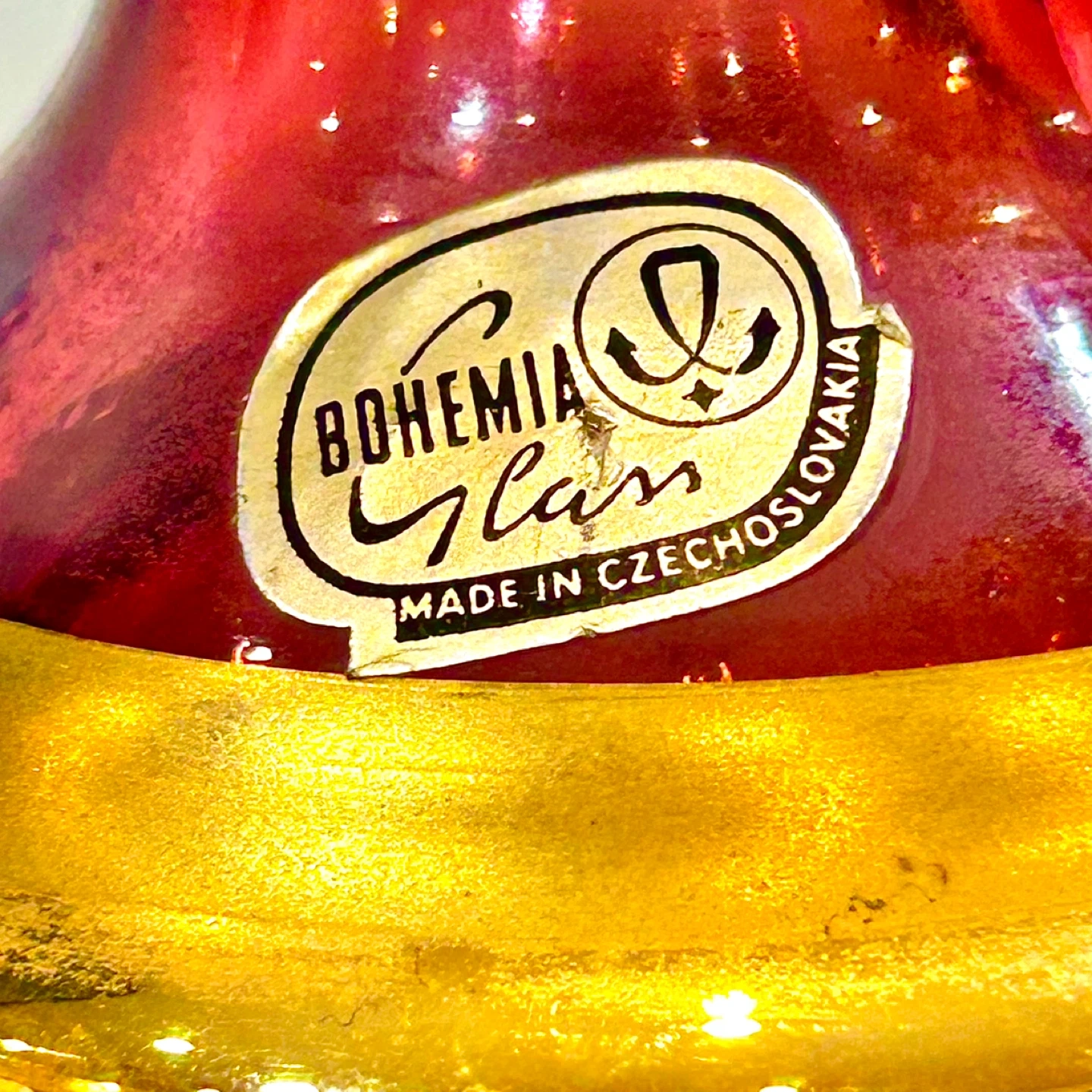 This is authentic Bohemian decorative glass made in Czechoslovakia. It is not Murano, not modern Chinese production, and not a contemporary reproduction. Attribution is based on original labeling, materials, and established Bohemian glassmaking techniques.
