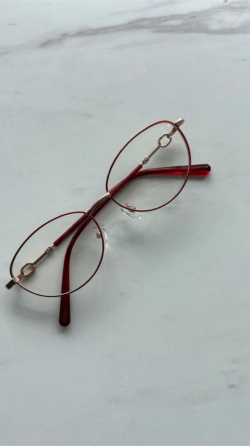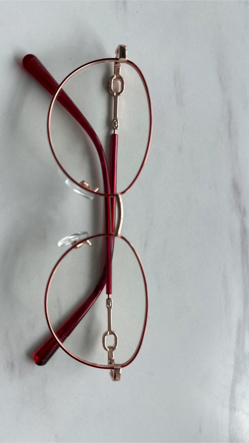 These are red and rose gold eyeglasses frames. They're a stylish oval shape with a subtle horsebit detail on the temples. The frames are lightweight and have adjustable nose pads for comfort.