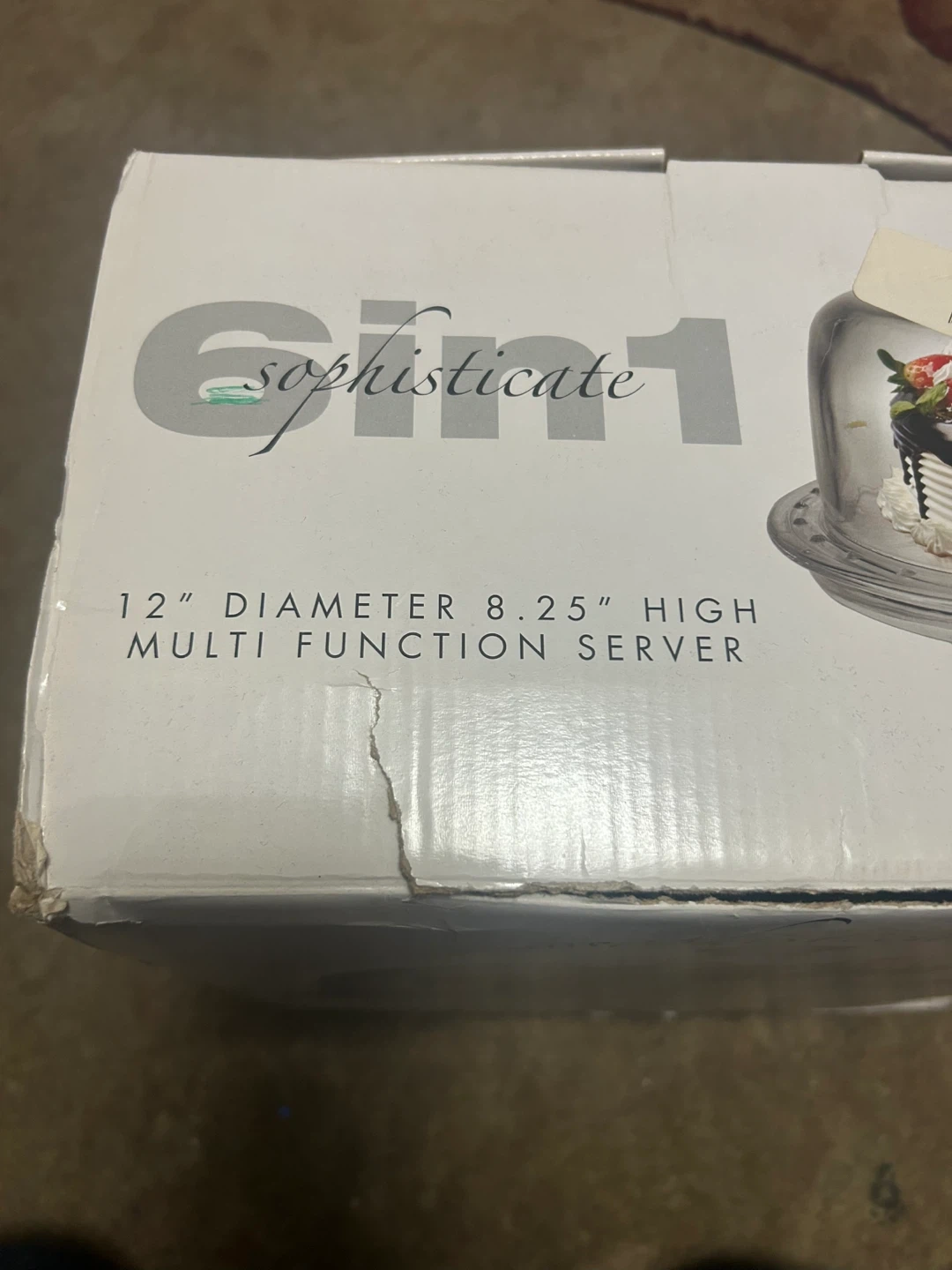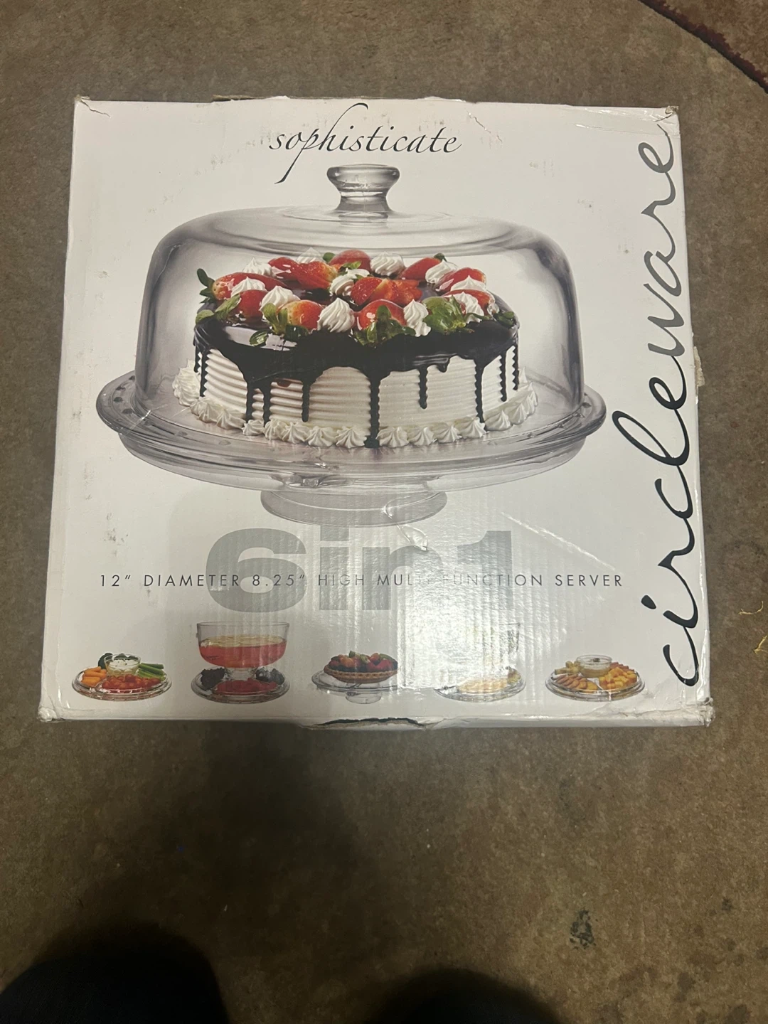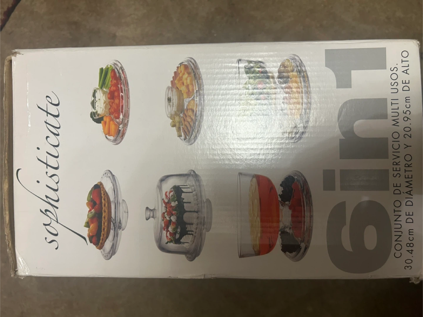 This is a 6-in-1 multi-function server. It's 12" in diameter and 8.25" high. Clear acrylic construction.