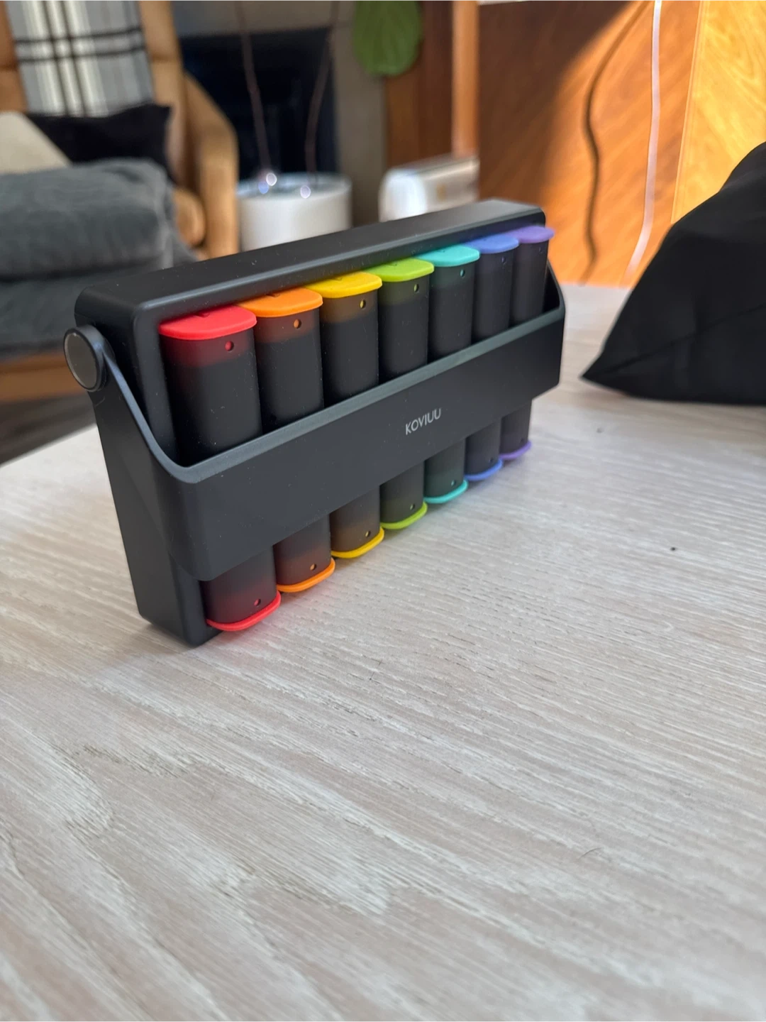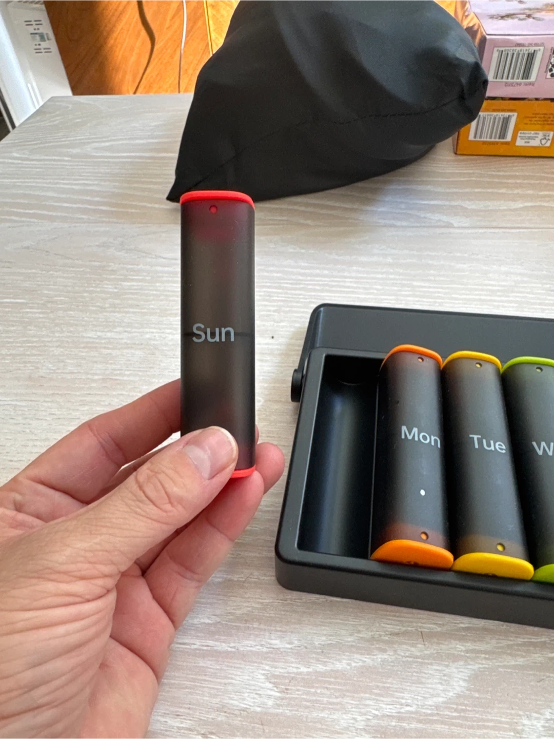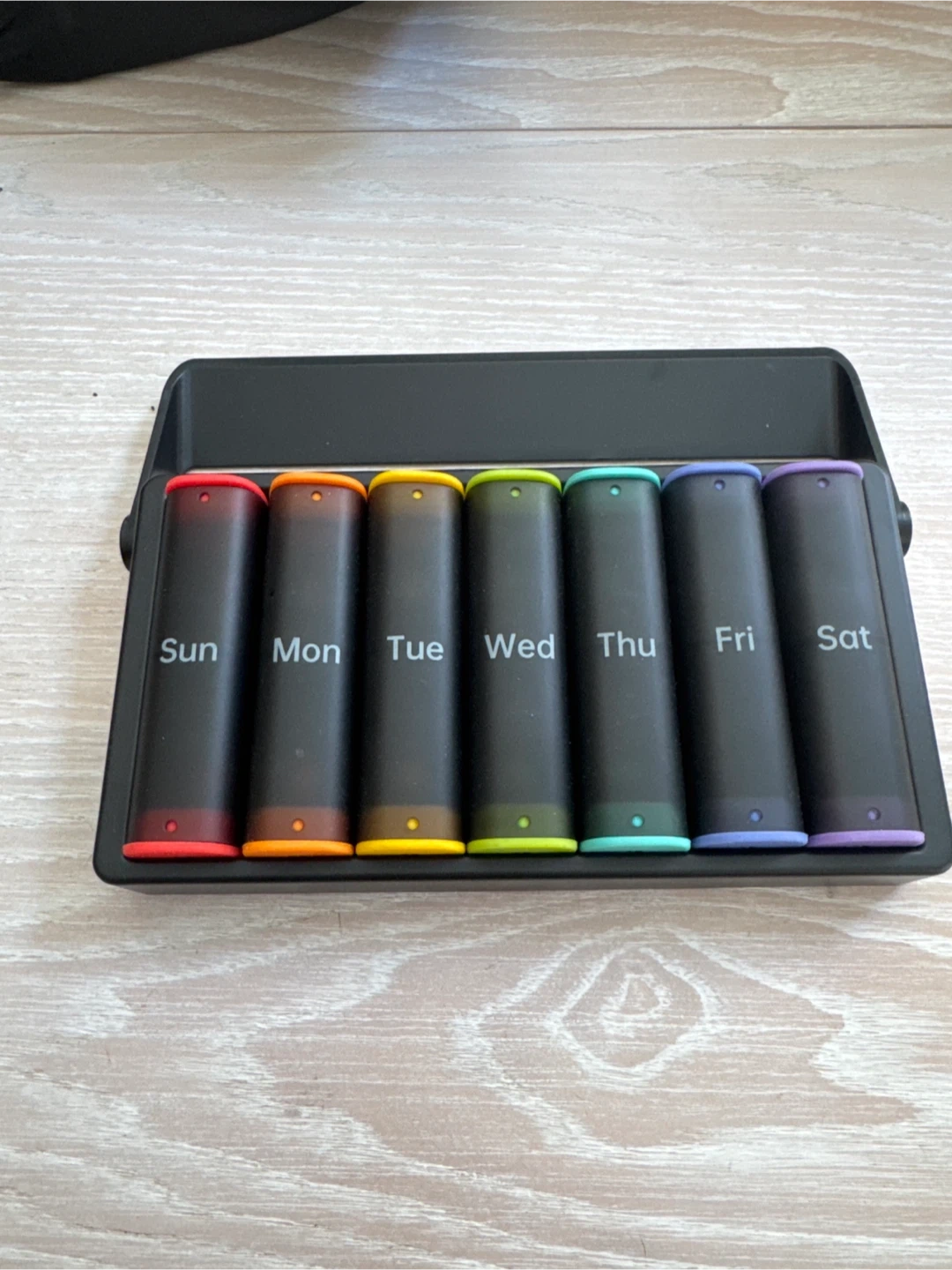 I'm selling a Koviu pill organizer! It has a sleek design and helps you keep track of your pills for the week. Each day is labeled, making it super easy to stay organized. It's in great condition!