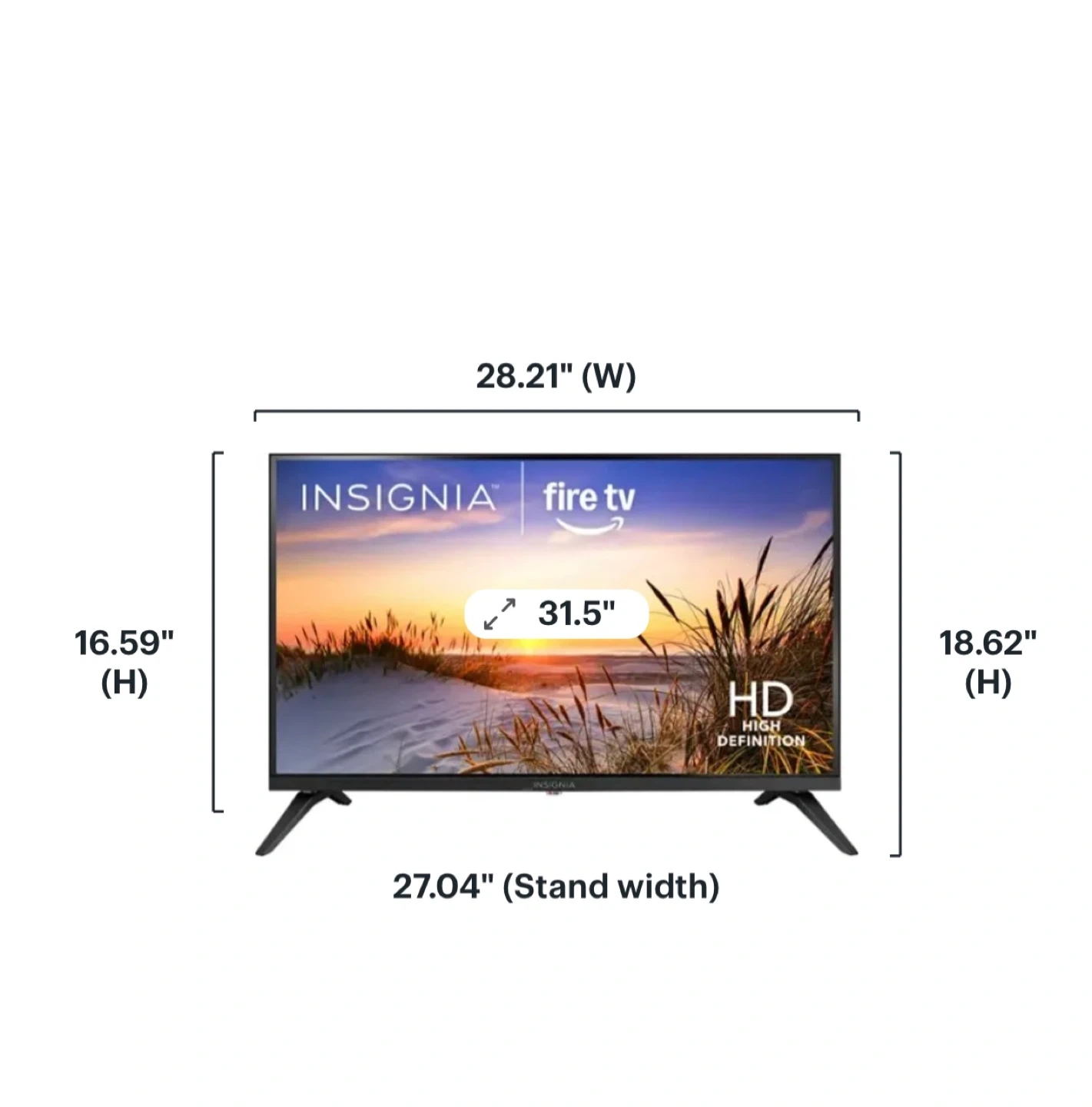 This Insignia smart TV is a 31.5-inch HD model with Fire TV built-in. It features multiple HDMI ports, including one with ARC support, a USB 2.0 port, and a 3.5mm audio jack. It also includes a remote with dedicated streaming app buttons. The TV has a width of 28.21 inches and a height of 18.62 inches.