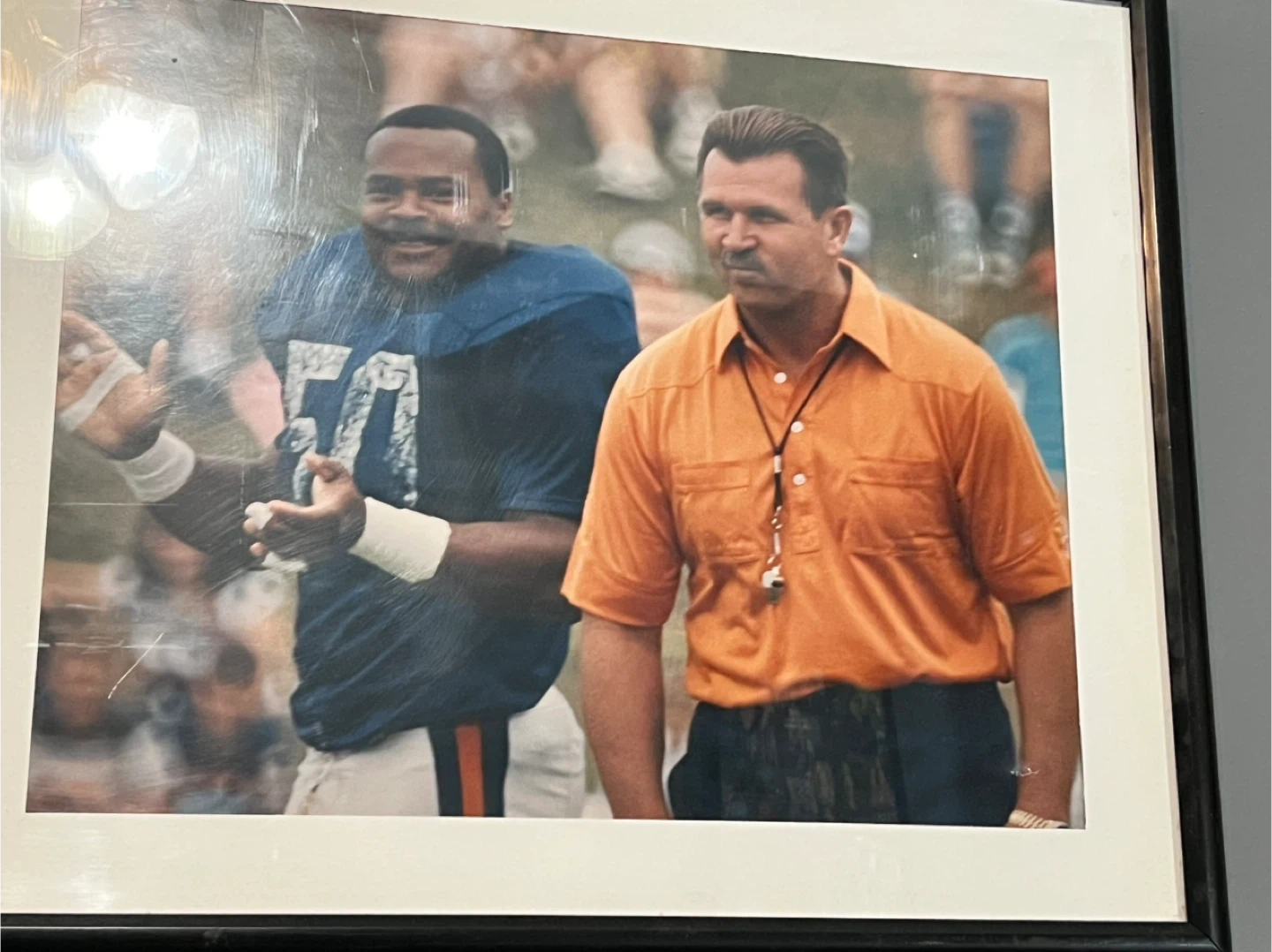 Vintage framed photo print featuring a football player in a blue jersey and a coach in an orange shirt. The player is wearing jersey number 70. It's a candid moment from a game or practice. The print is framed and ready to hang.