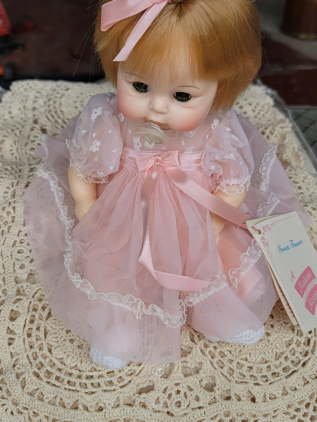 This Madame Alexander Sweet Tears doll is dressed in a pink lace and tulle dress. It has a pacifier and blonde hair with a pink bow. Perfect for collectors!