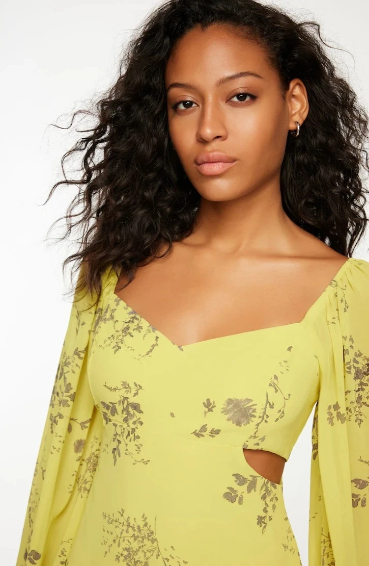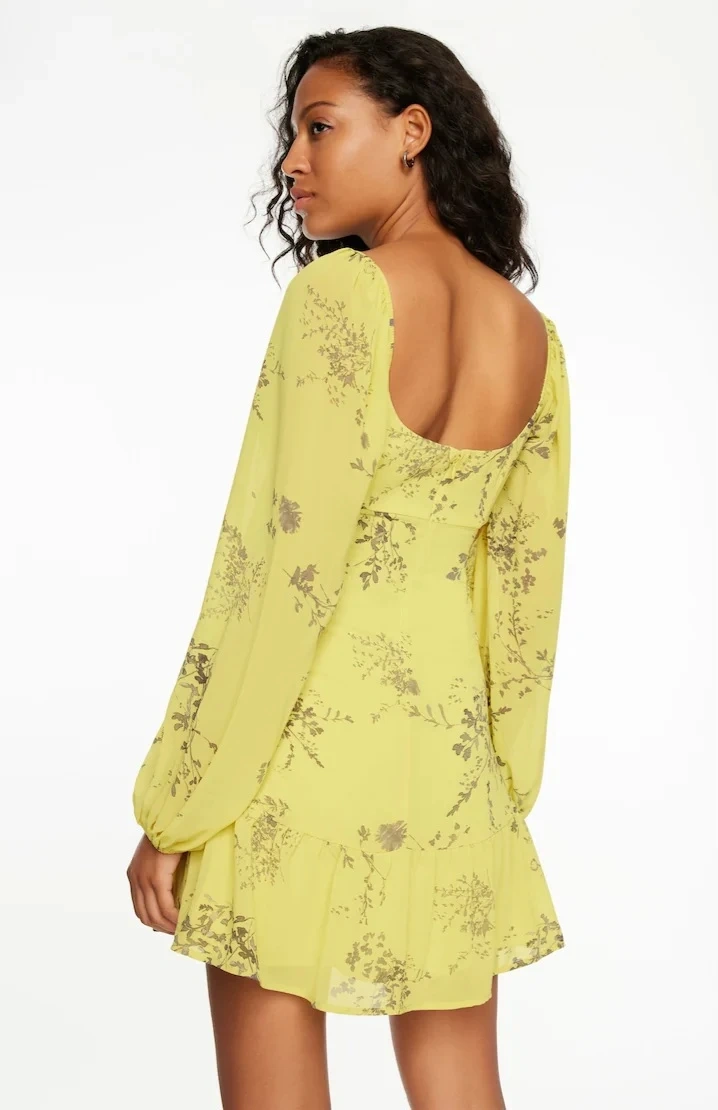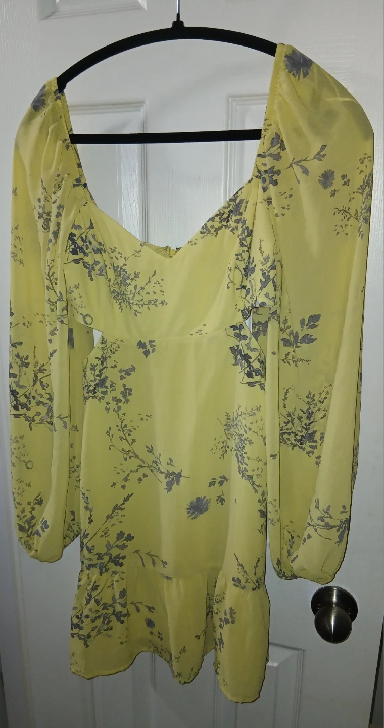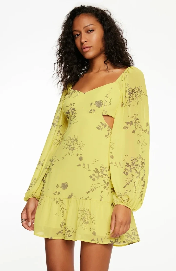This stylish mini dress is bright yellow with a delicate floral print. It features chic side cutouts and full-length puff sleeves. It's made from a lightweight chiffon material for a flowing fit. *NWT