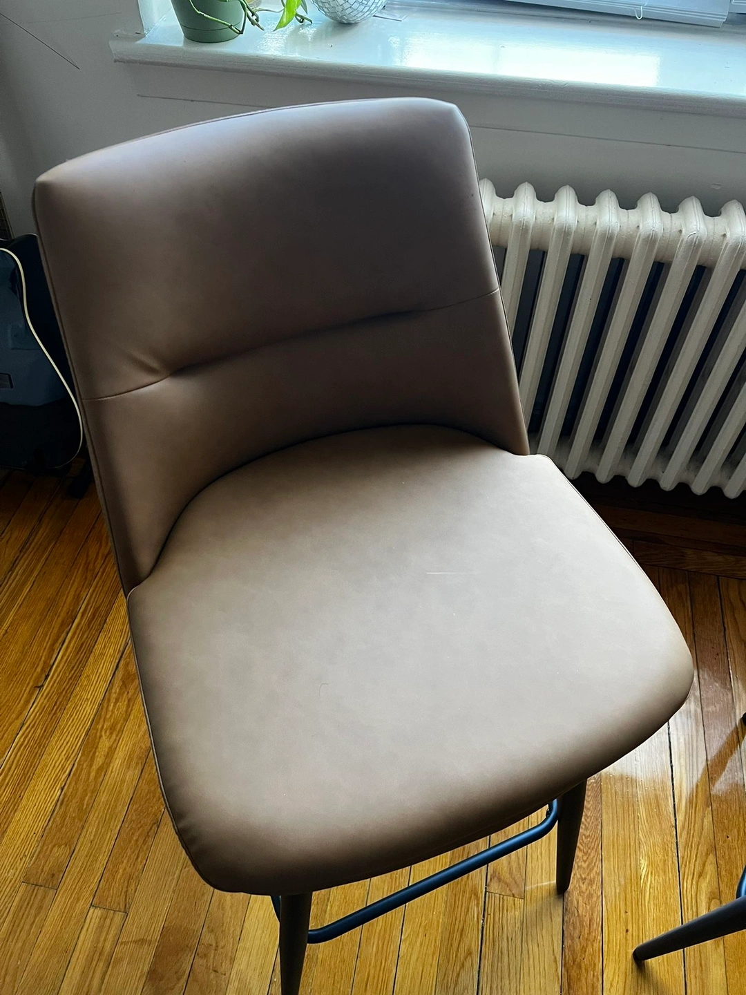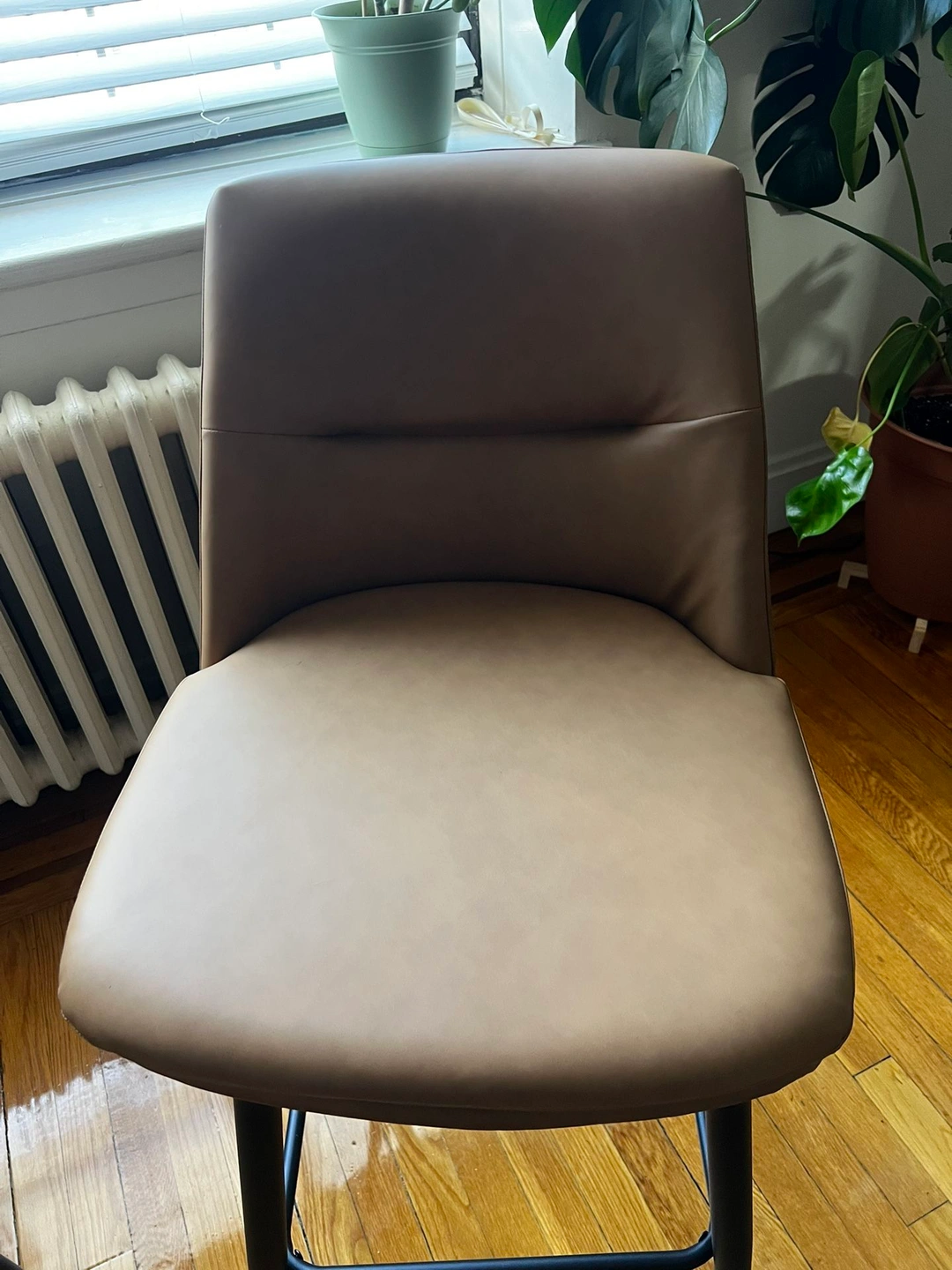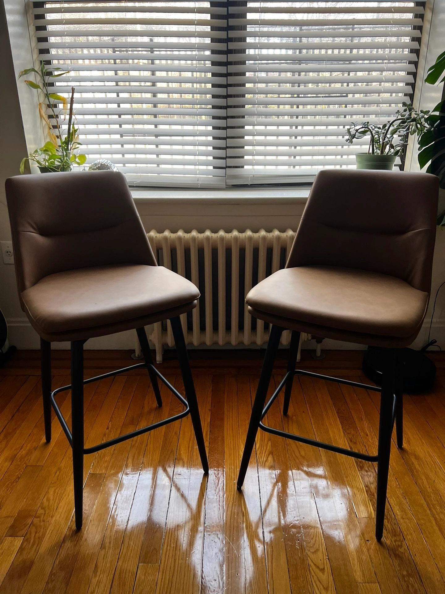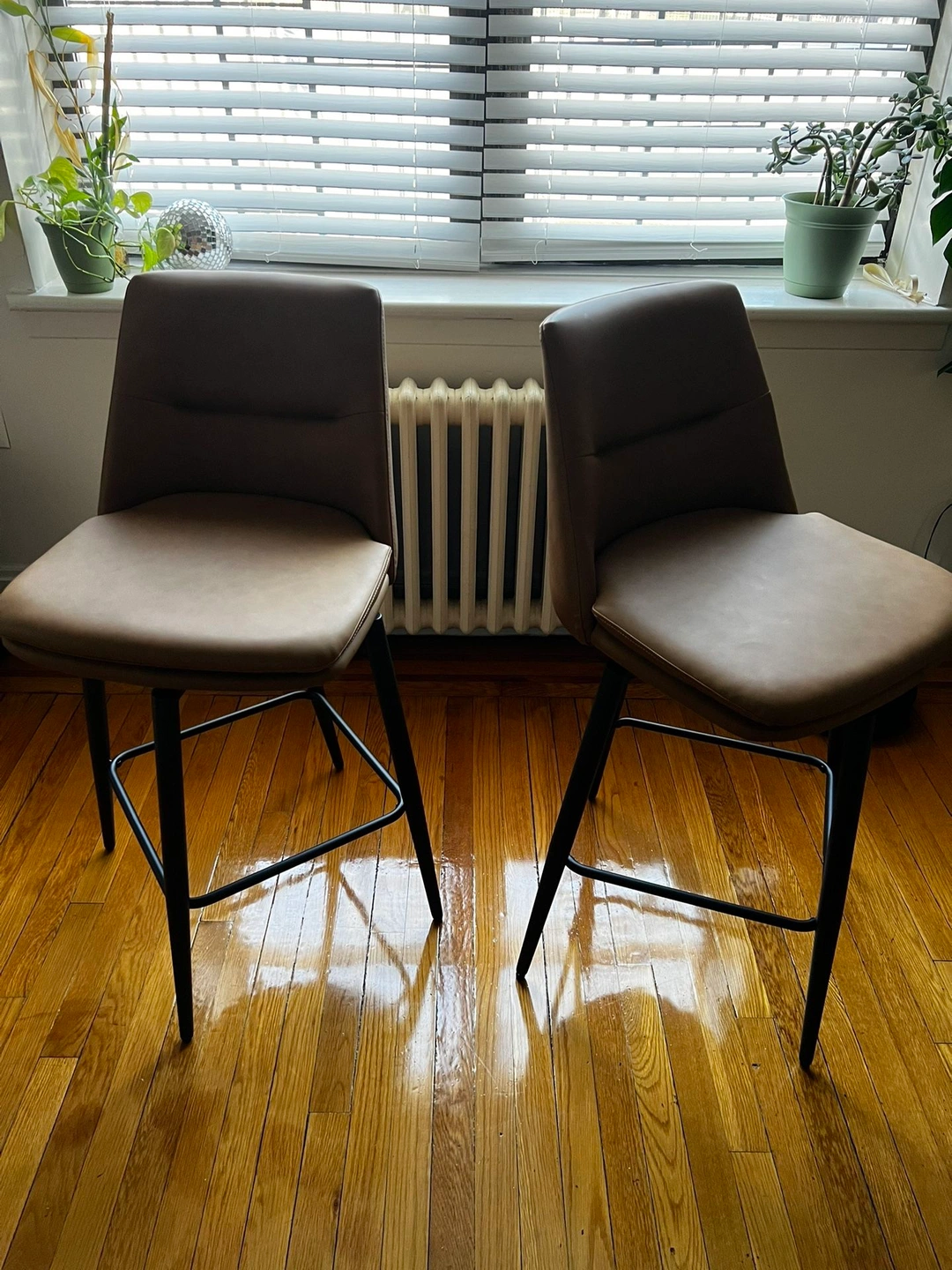 Set of 2 brown counter height bar stools. Features a 26-inch seat height with backs, 360° swivel, and upholstered faux leather seats with metal legs. Product Dimensions: 17.3"D x 19"W x 37.8"H.