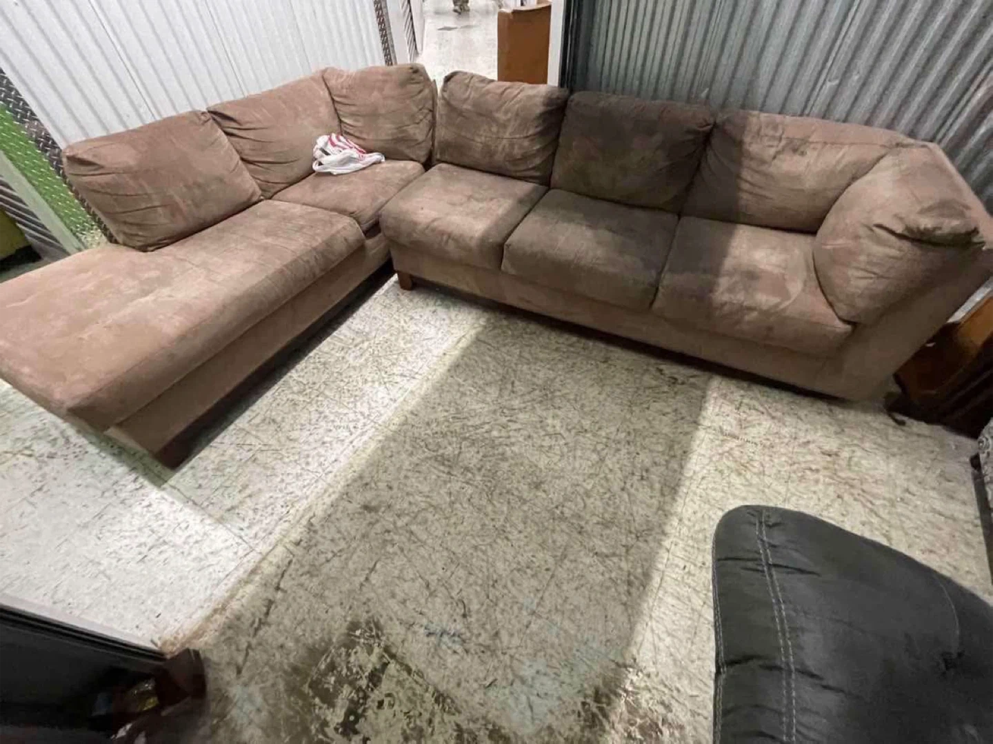 This is a brown fabric sectional sofa with a chaise lounge. It's a comfortable and spacious seating option for your living room. The material is soft to the touch and the color is a neutral brown.