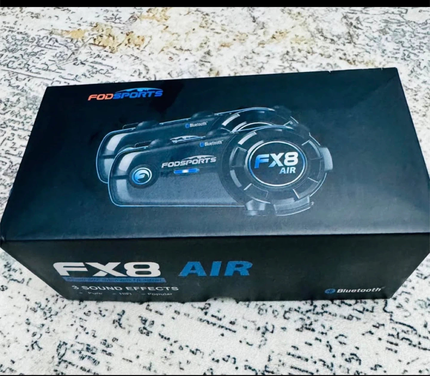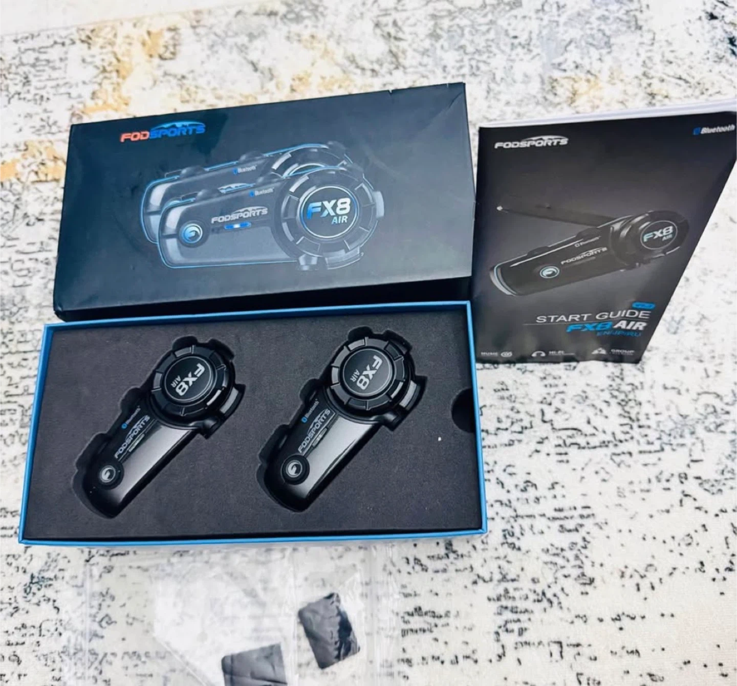 This is a set of two Fodsports FX8 AIR Bluetooth headsets for motorcycles. They connect via Bluetooth and are designed for helmets. Includes start guide and original packaging.