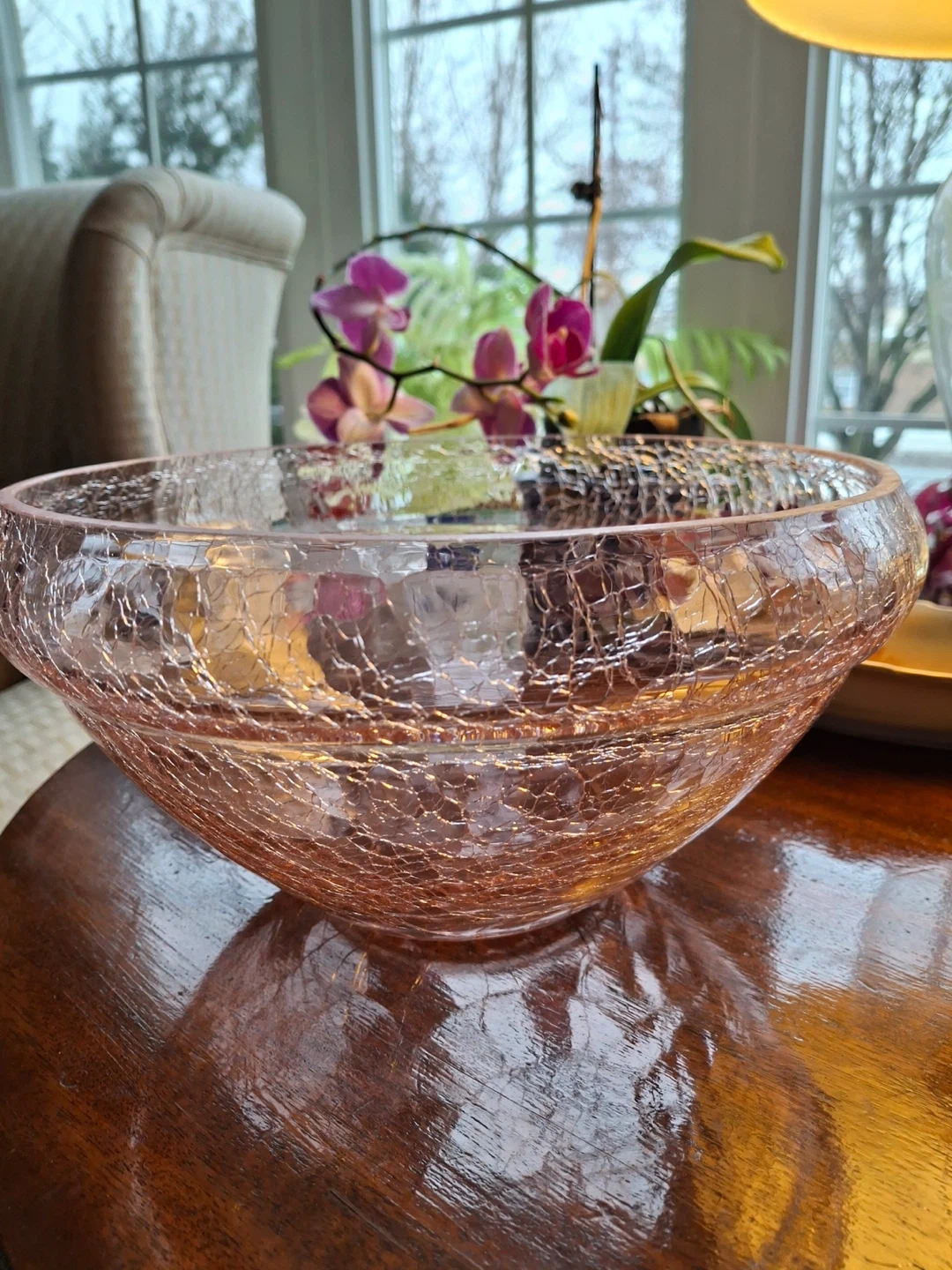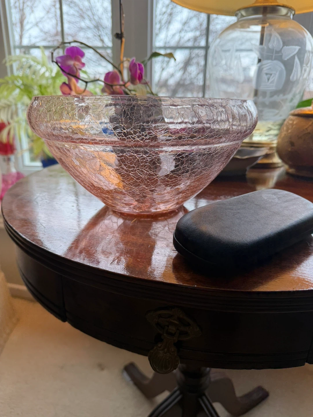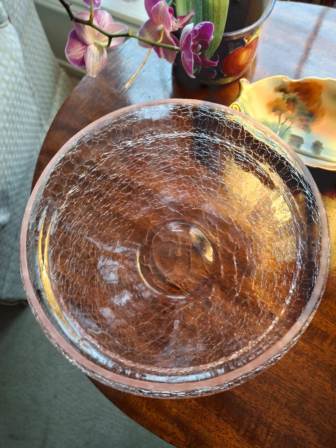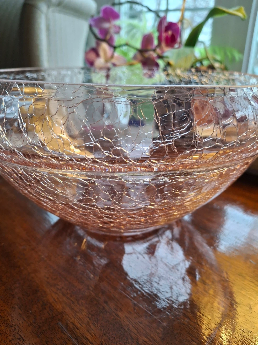 Pink crackle glass decorative bowl. Unique curved rim. 9.5” wide and 5.5” tall. Excellent condition. (Glasses case for scale in the last photo)