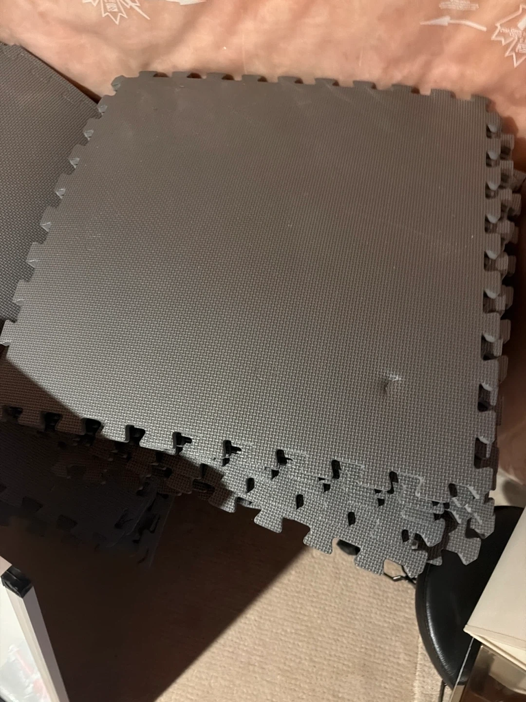 Set of grey interlocking foam floor mats. They offer a cushioned surface. Great for gyms or play areas! There is about 100 of them.