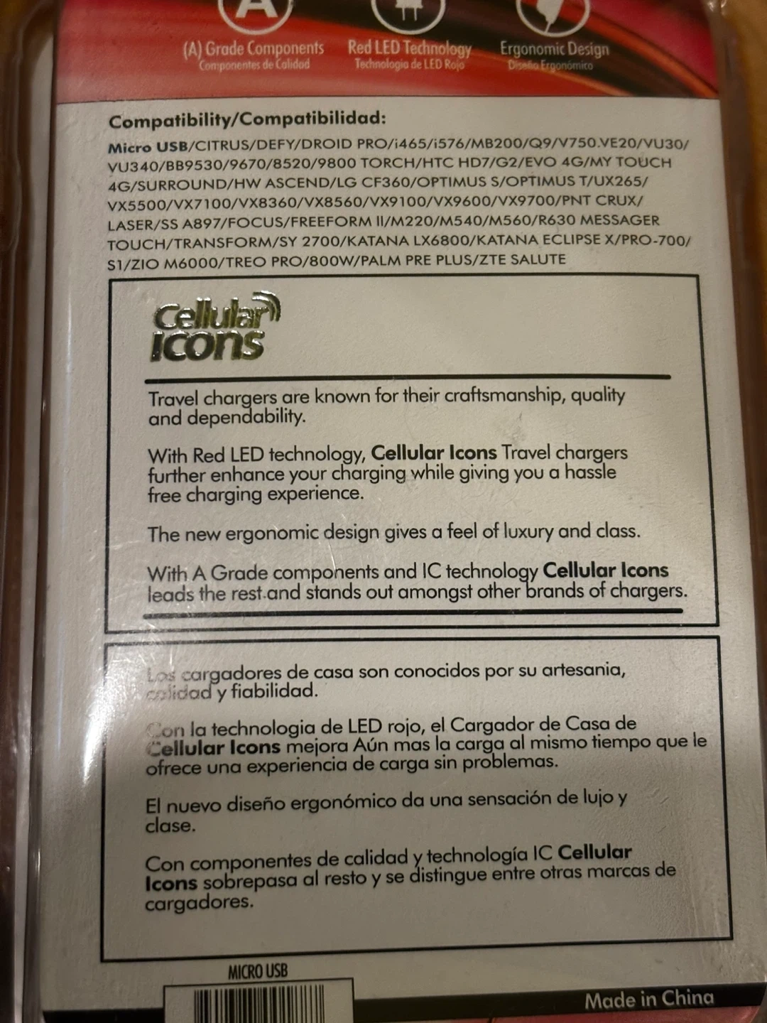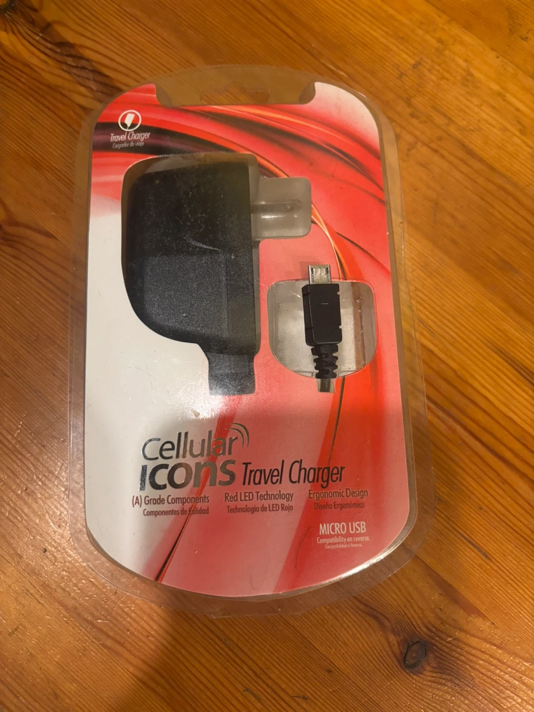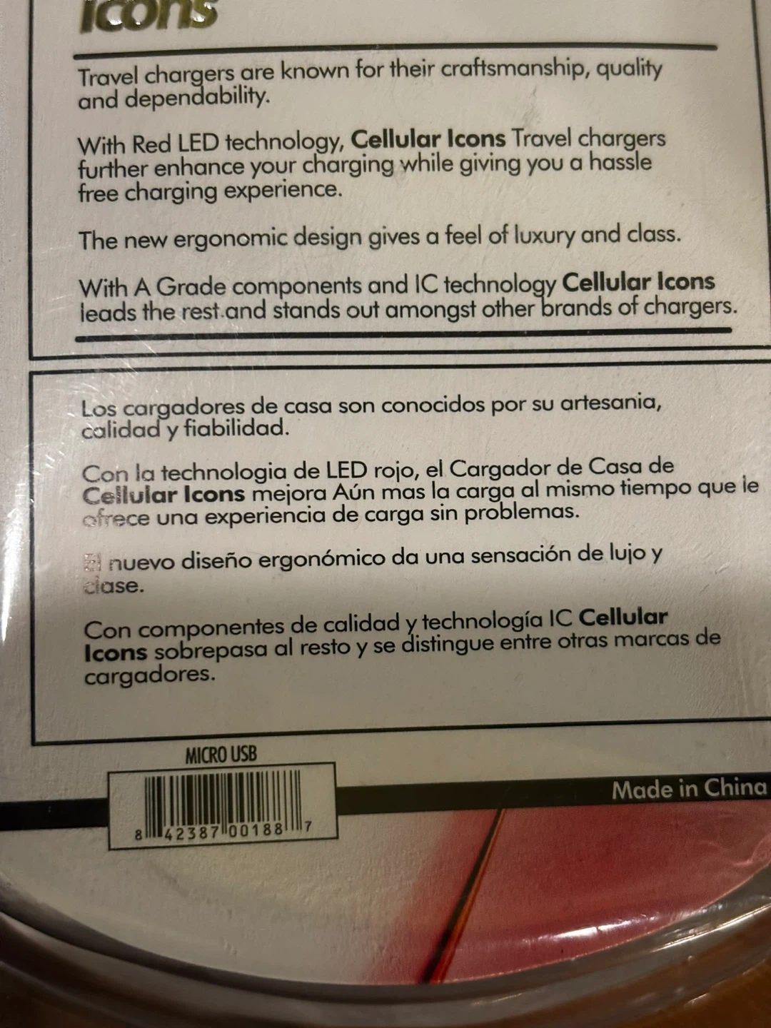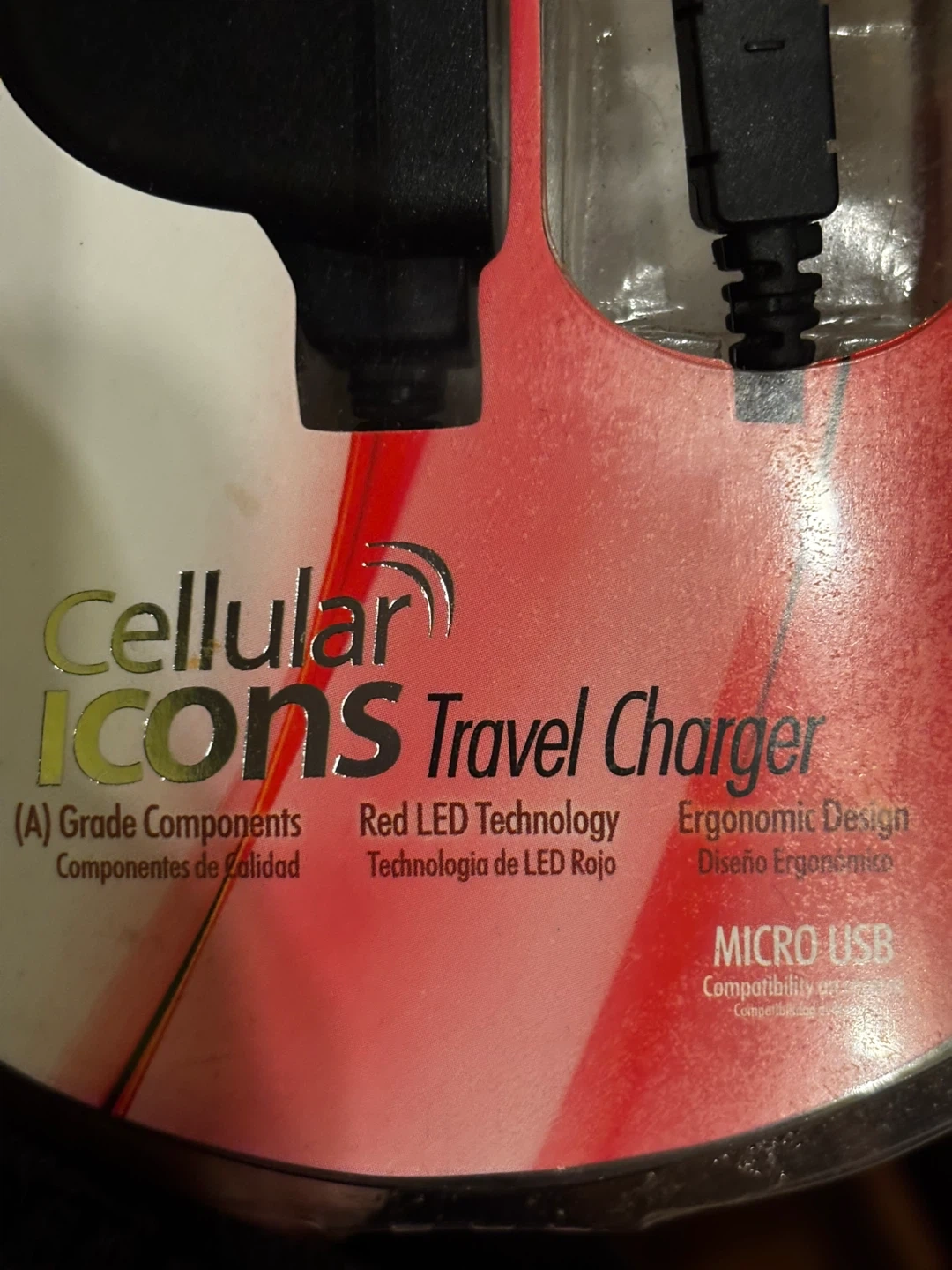 This is a Cellular Icons travel charger with a Micro USB cable. It features Red LED Technology and an ergonomic design. The charger is compatible with a wide range of devices.