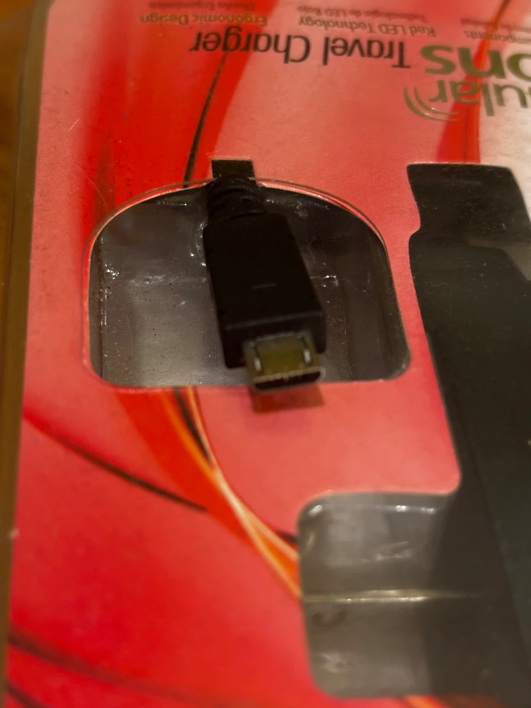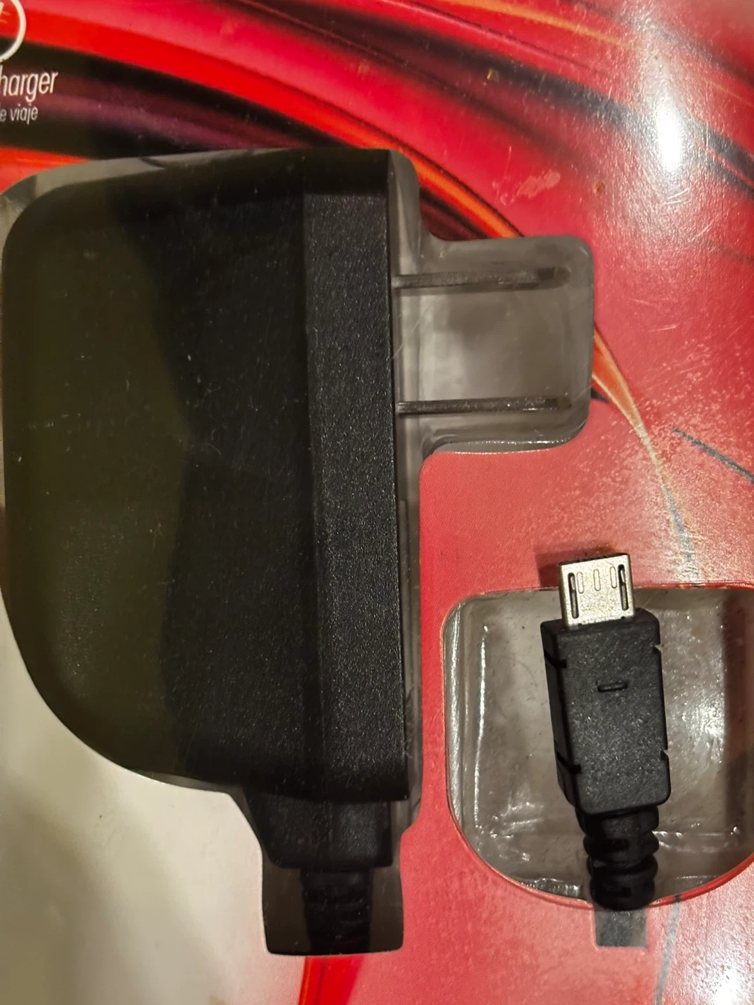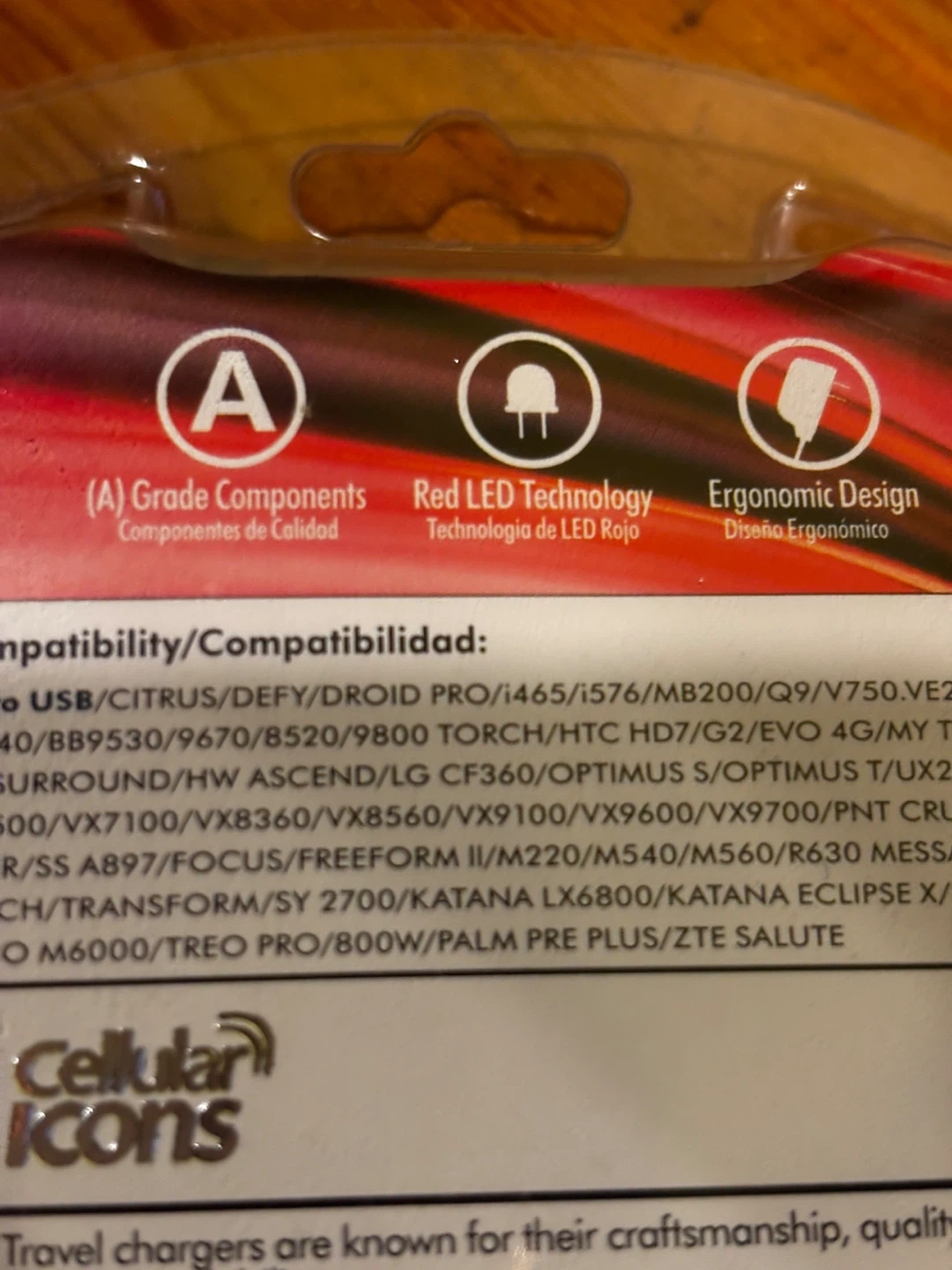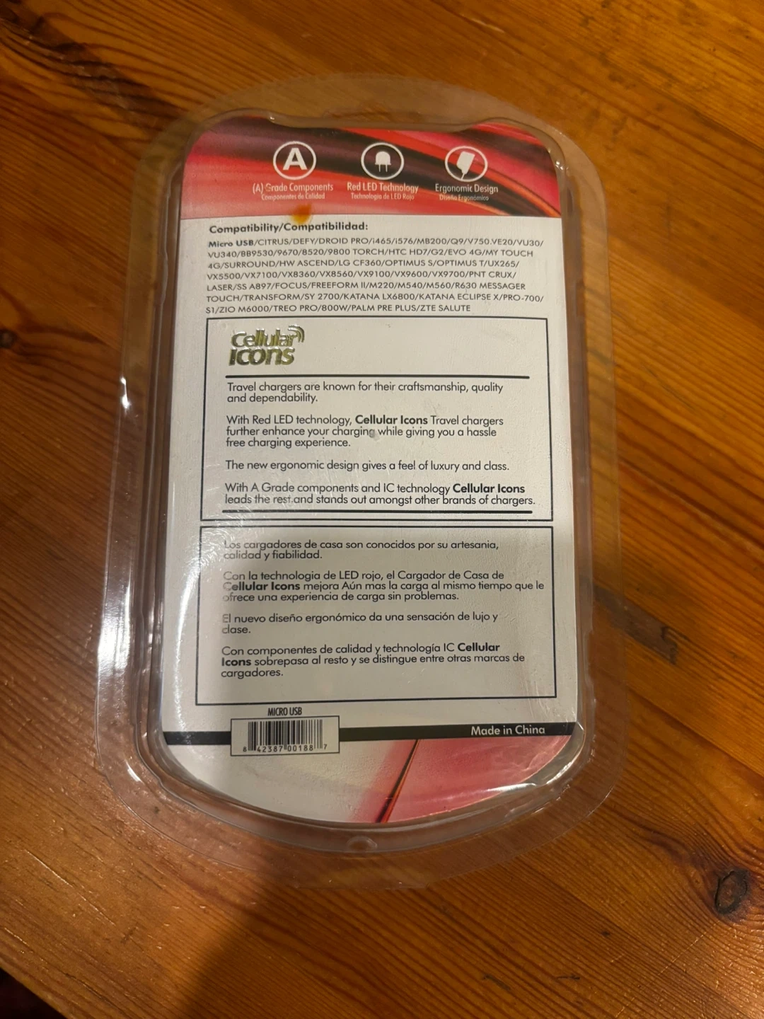 This is a Cellular Icons travel charger with a Micro USB cable. It features Red LED Technology and an ergonomic design. The charger is compatible with a wide range of devices.