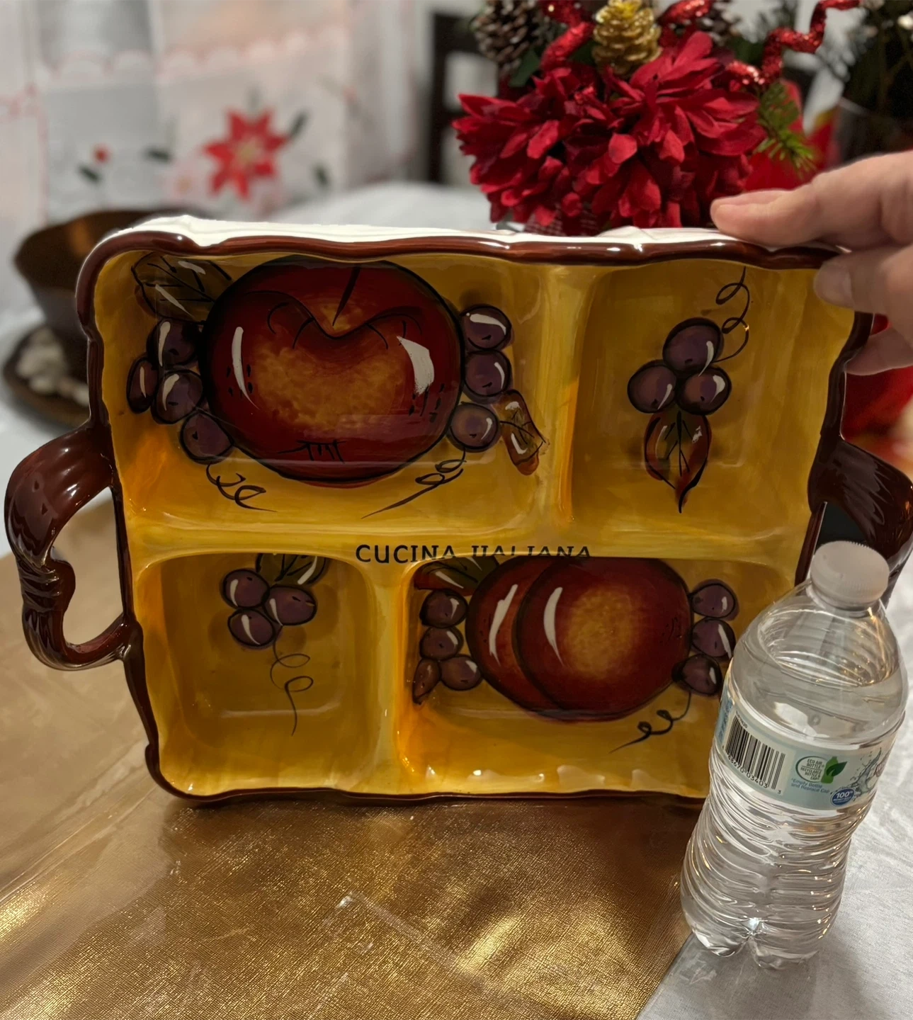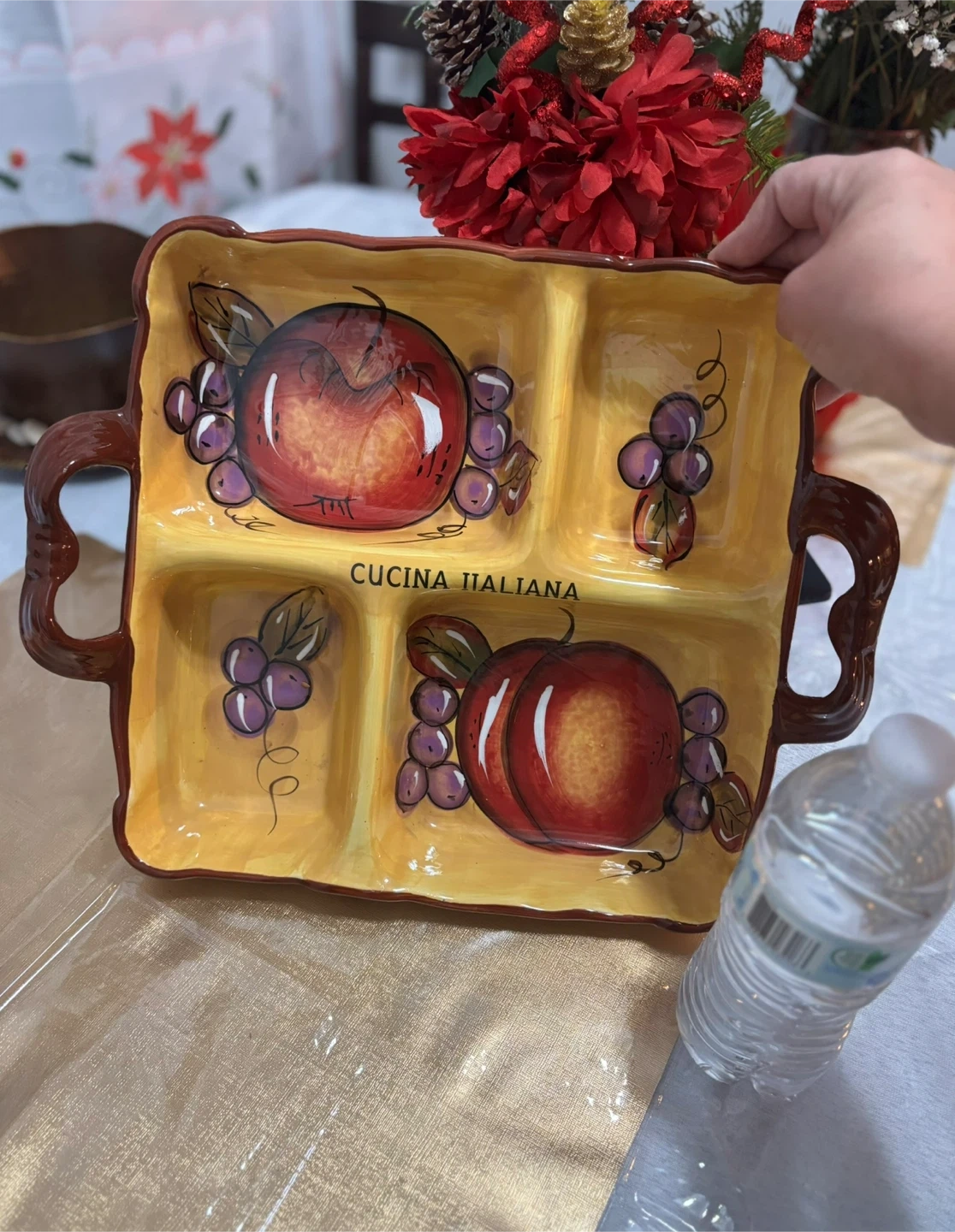 Offering a lovely Cucina Italiana divided serving dish. It features a charming design with apples and grapes on a yellow background. Perfect for serving snacks or appetizers at your next gathering!