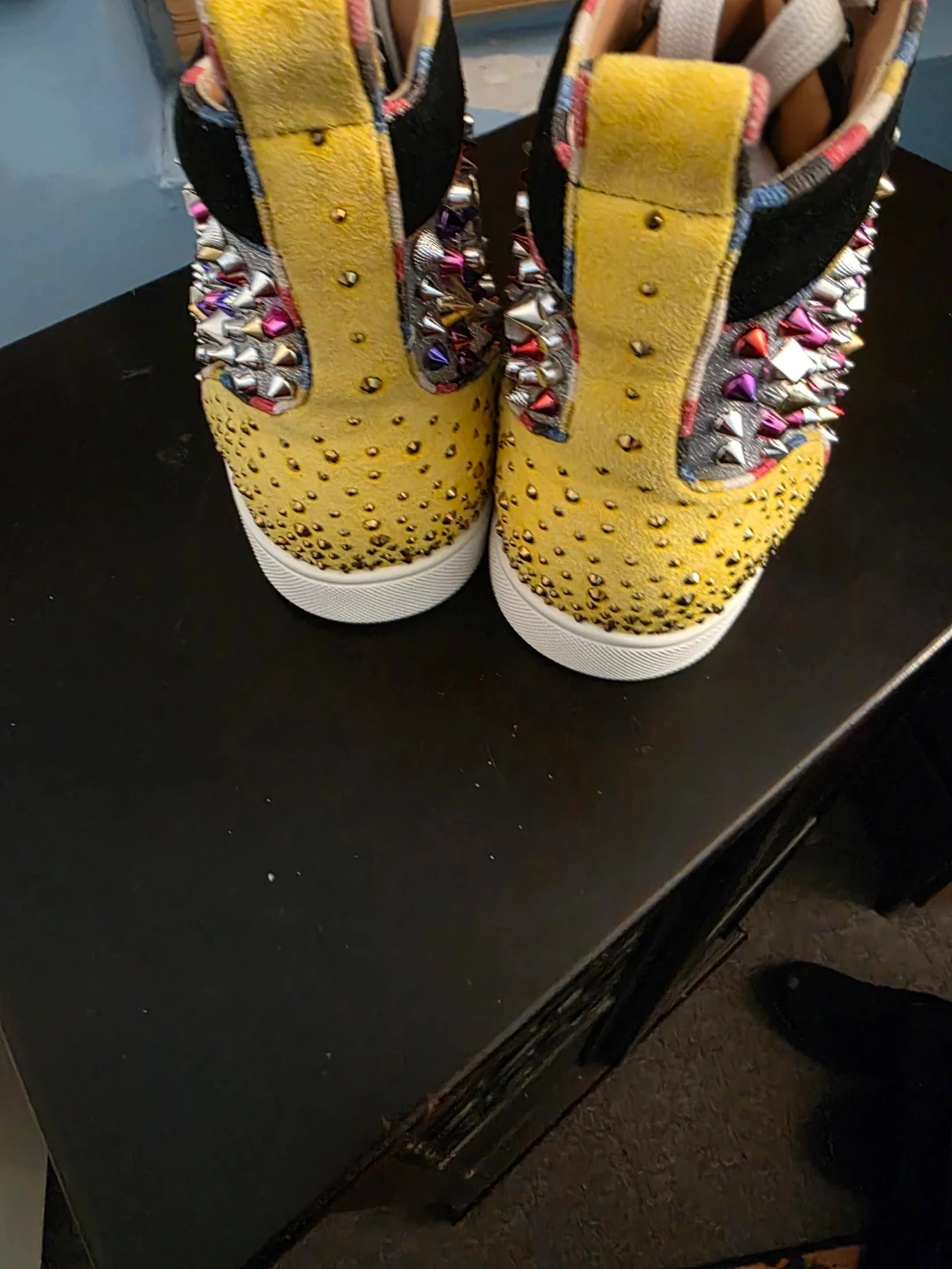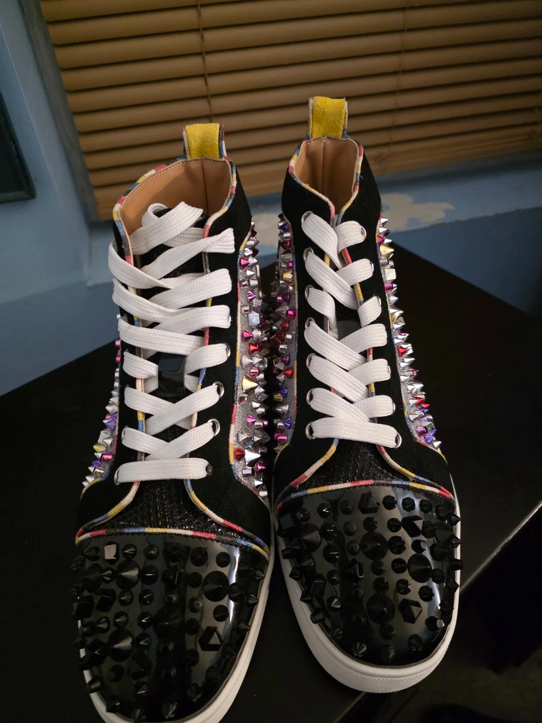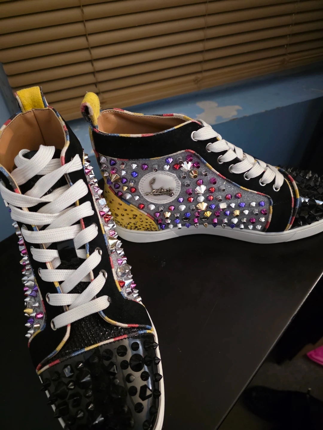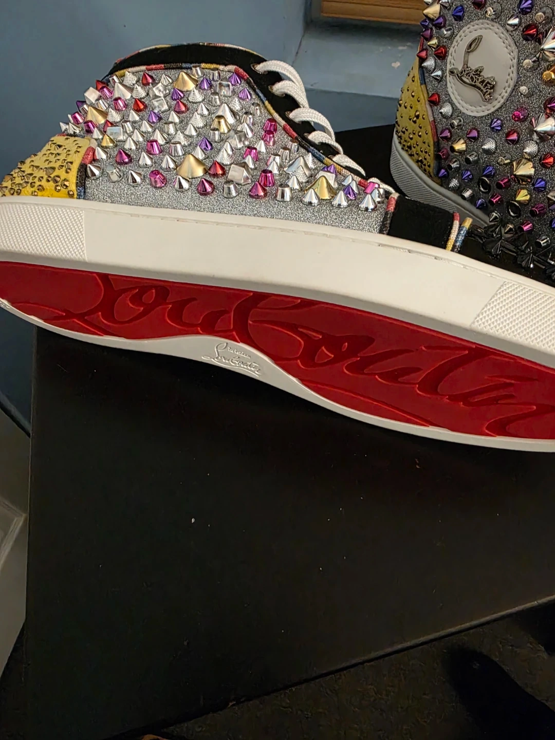 These Christian Louboutin sneakers feature a black suede and glitter canvas. They're adorned with multi-colored spikes and silver stud details. Includes the signature red sole.