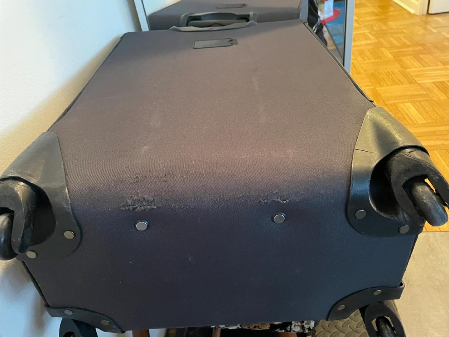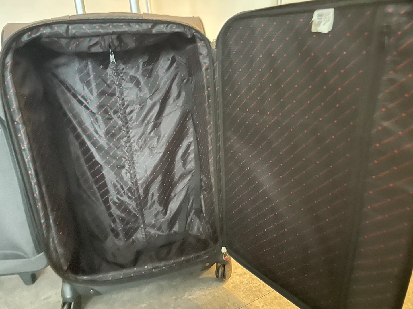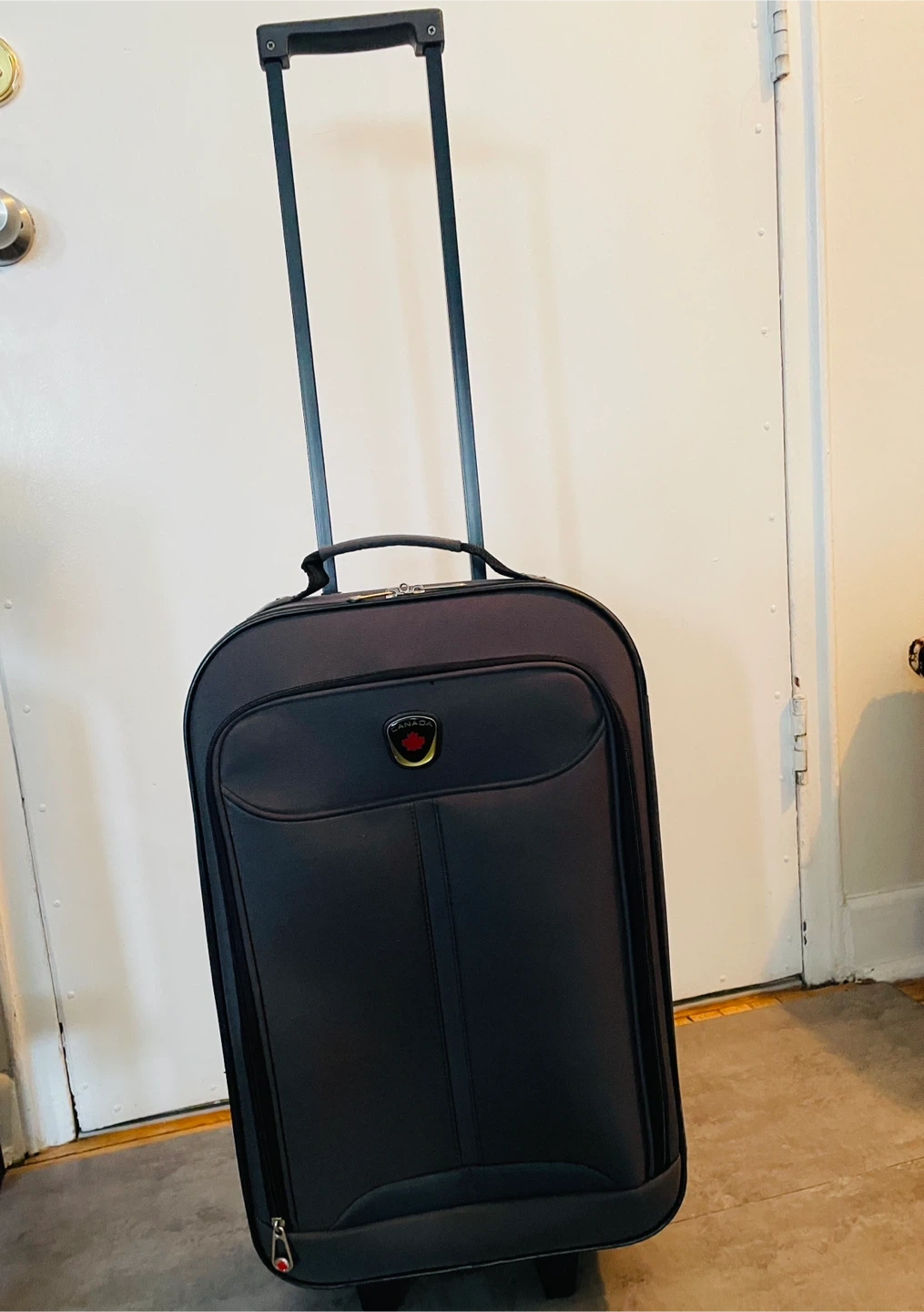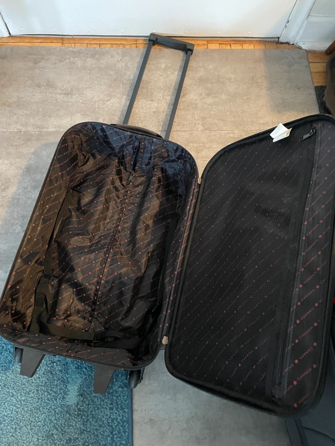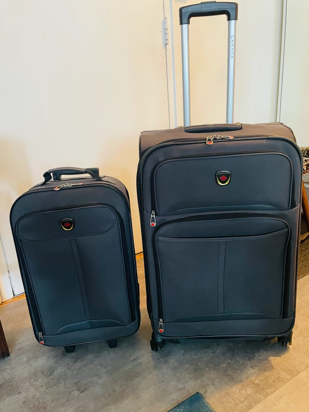 Two-piece suitcase set by Canada Luggage. One larger rolling 4-wheel suitcase and one smaller carry-on size. The larger suitcase shows some wear on the bottom, but both are fully functional and ready for your next trip.