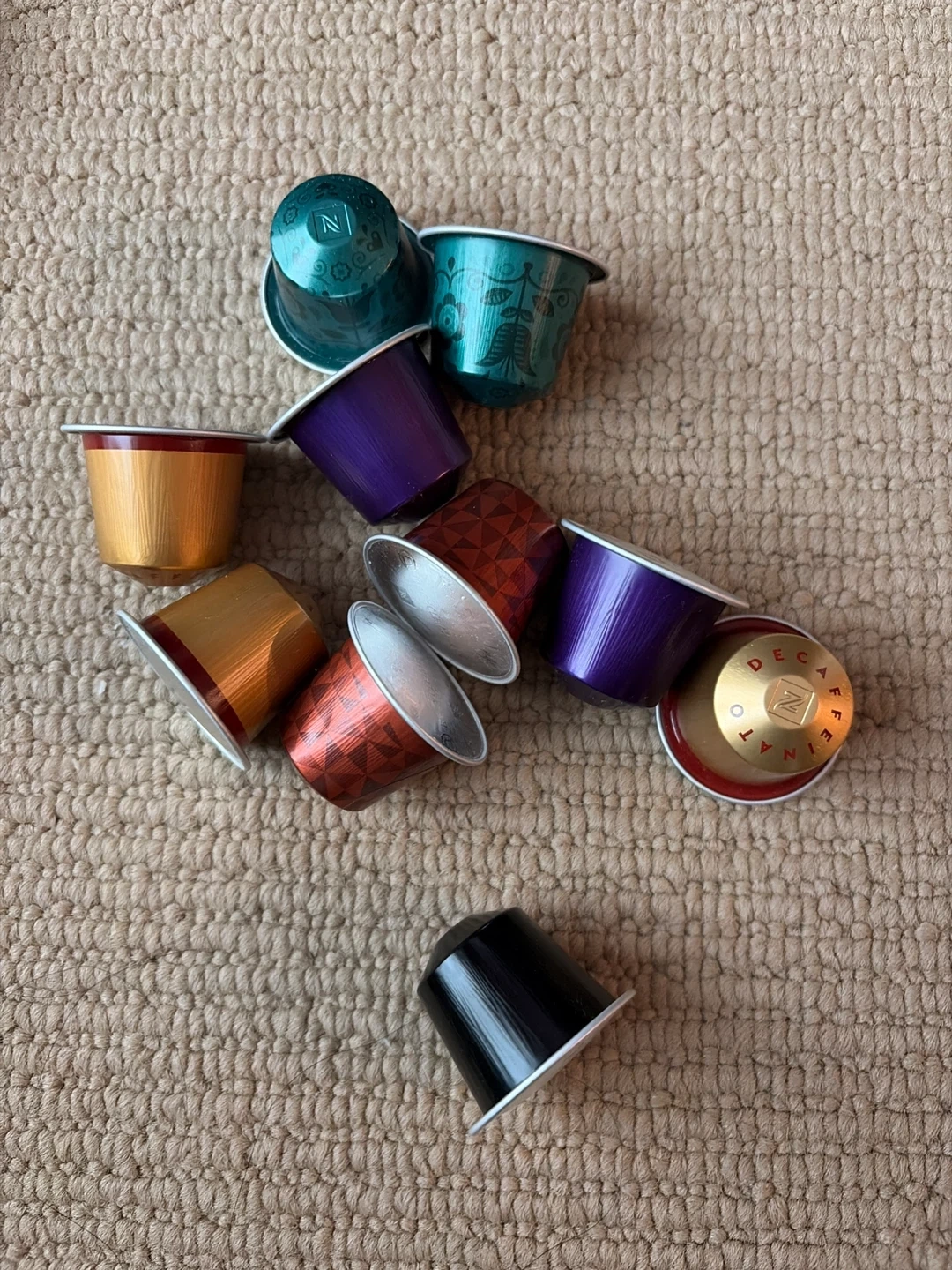 Assortment of Nespresso coffee pods. Includes various colours and decaf options. These capsules are designed for Nespresso machines.