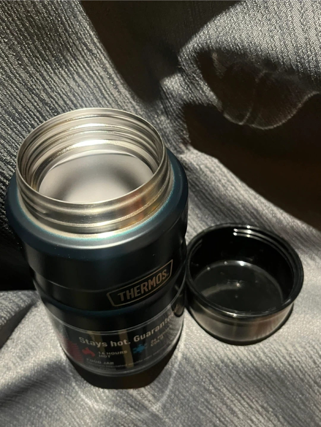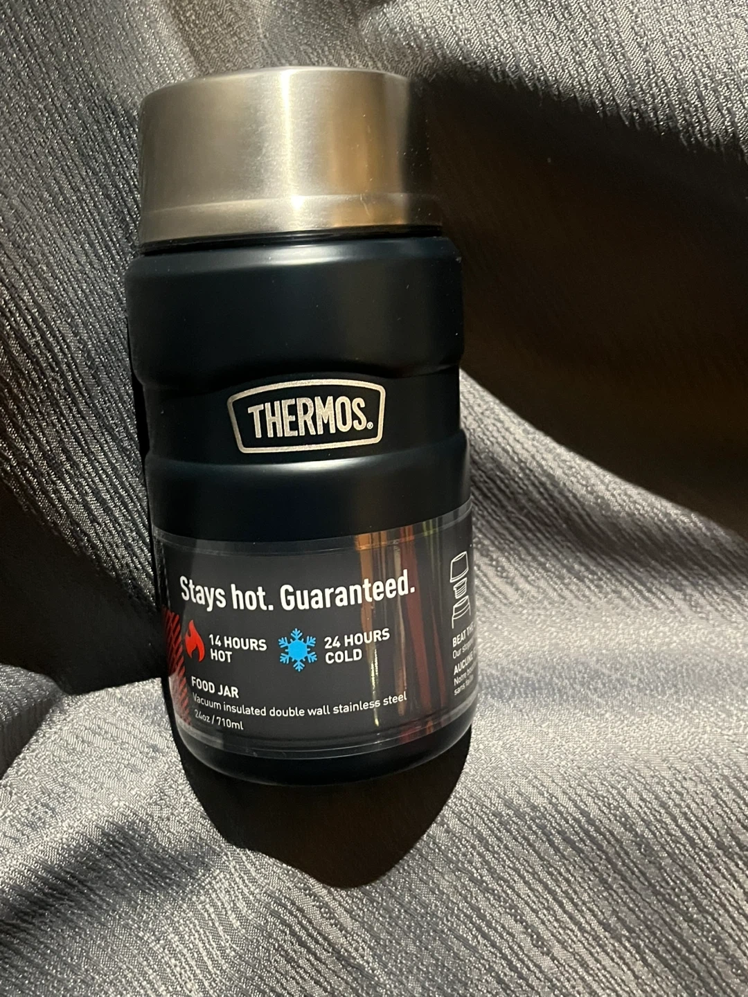 Thermos vacuum-insulated food jar keeps food hot for 14 hours or cold for 24 hours. Double-wall stainless steel construction. 24oz (810ml) capacity. It's perfect for taking hot meals to work or cold snacks on an adventure!