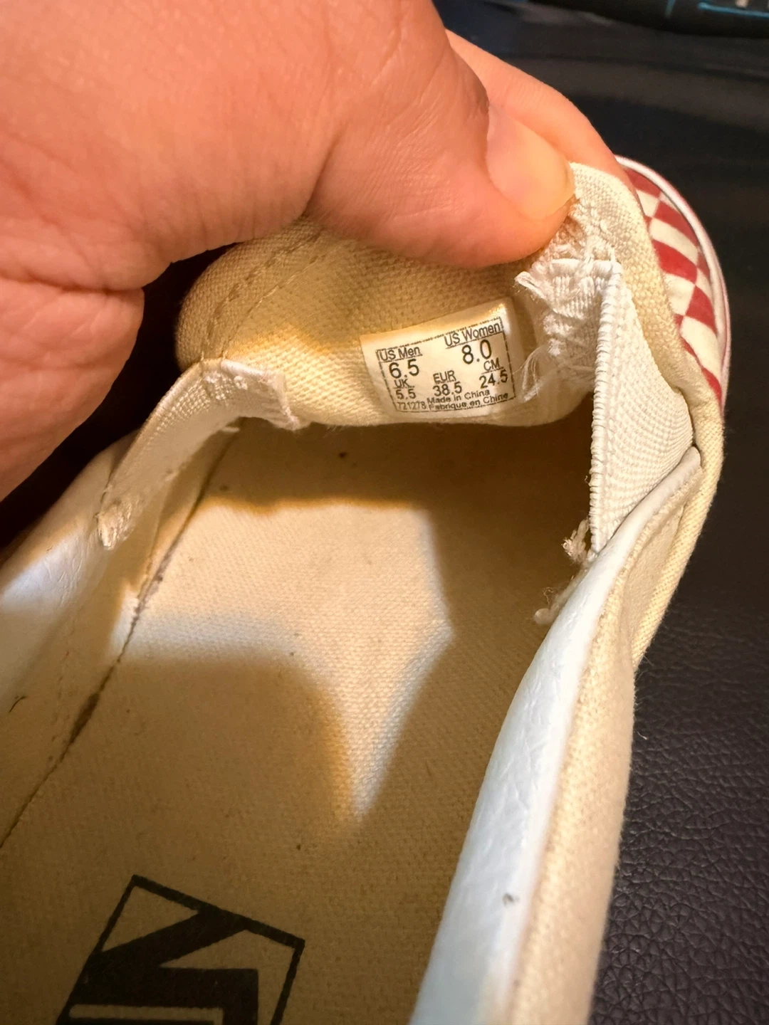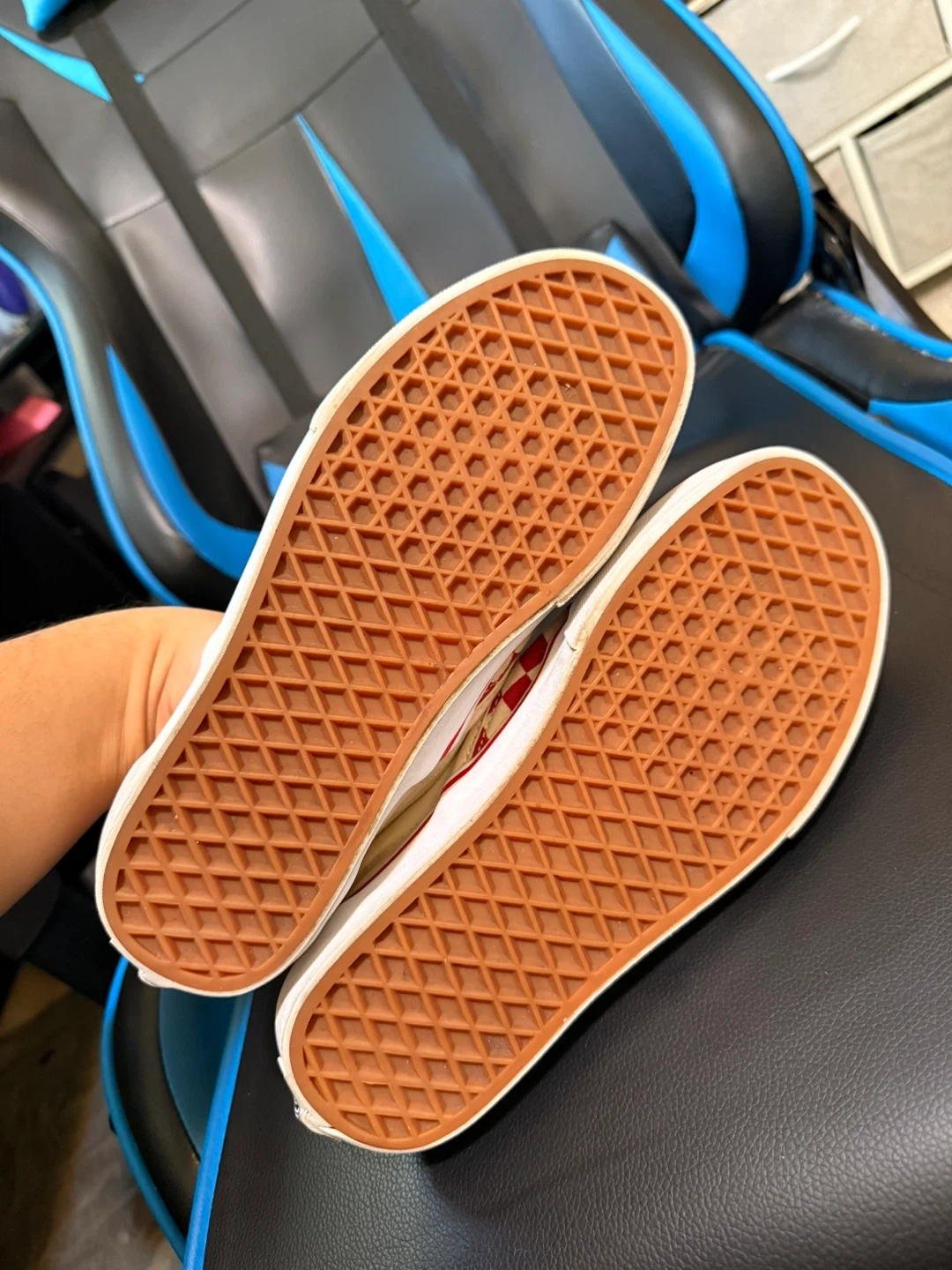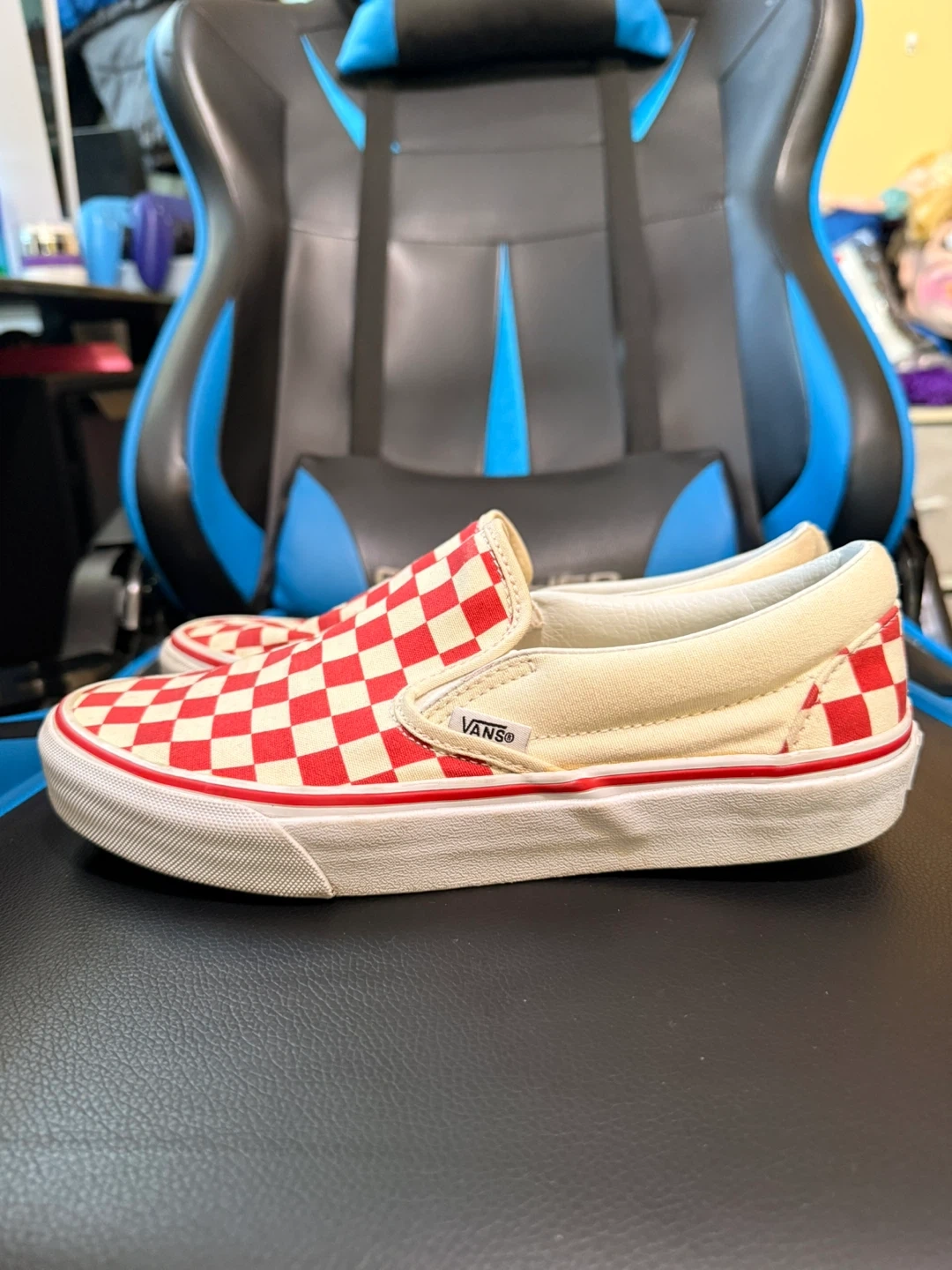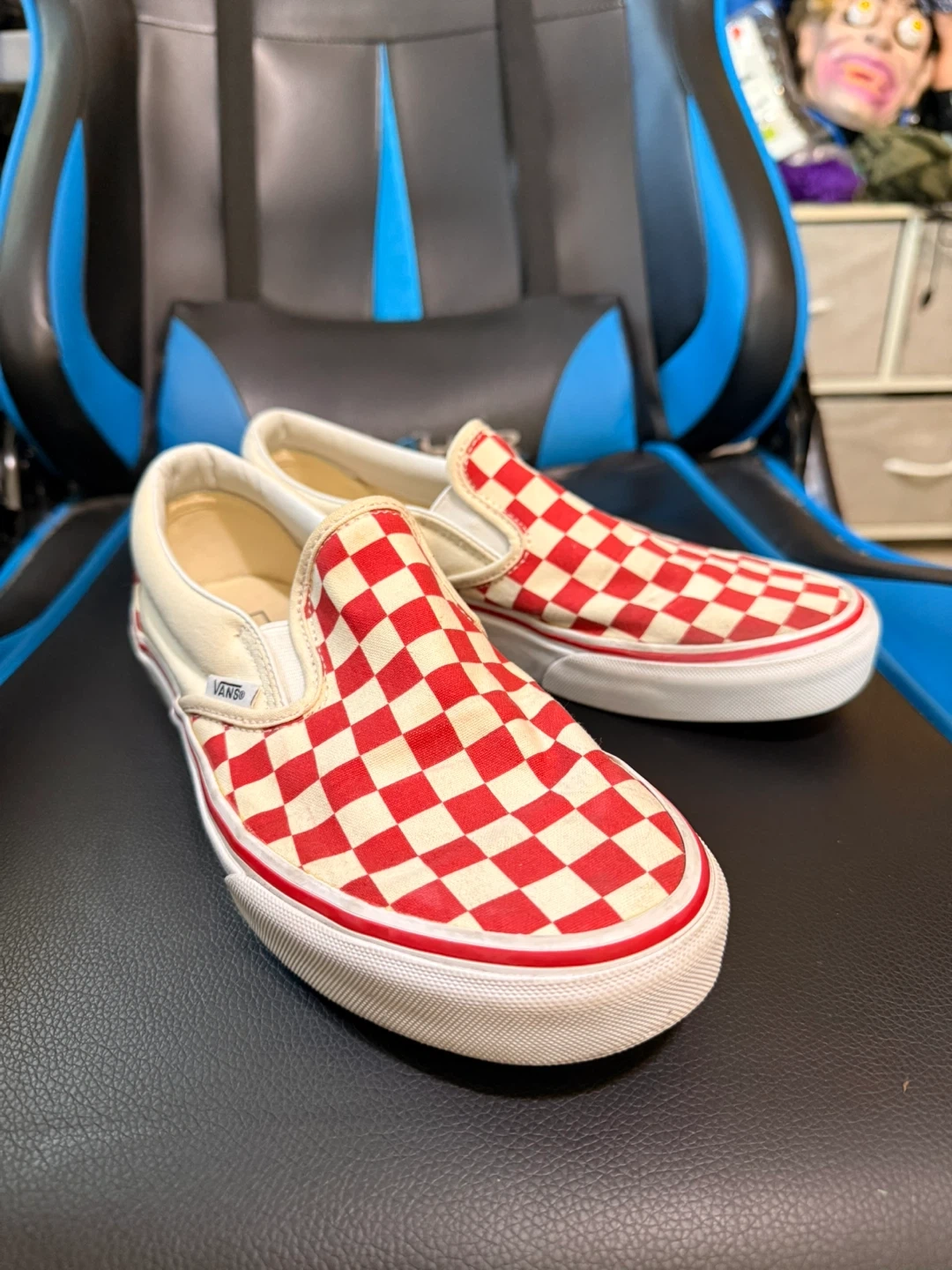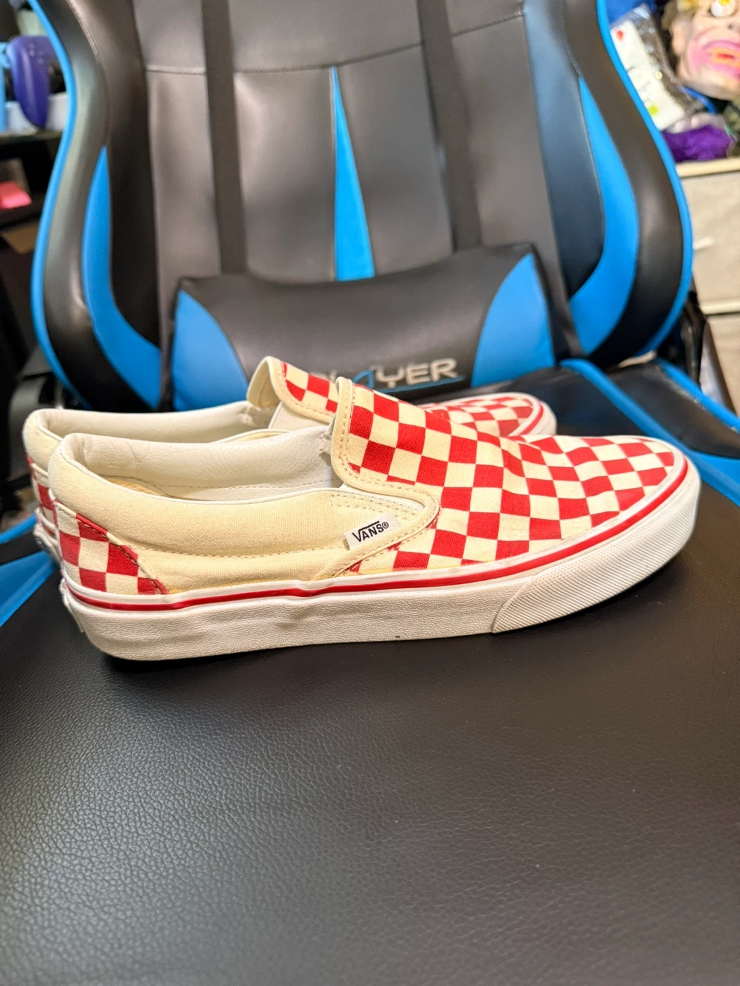 Classic red and white checkerboard Vans slip-on shoes. These are canvas sneakers with a rubber sole. Easy to wear and a timeless style!