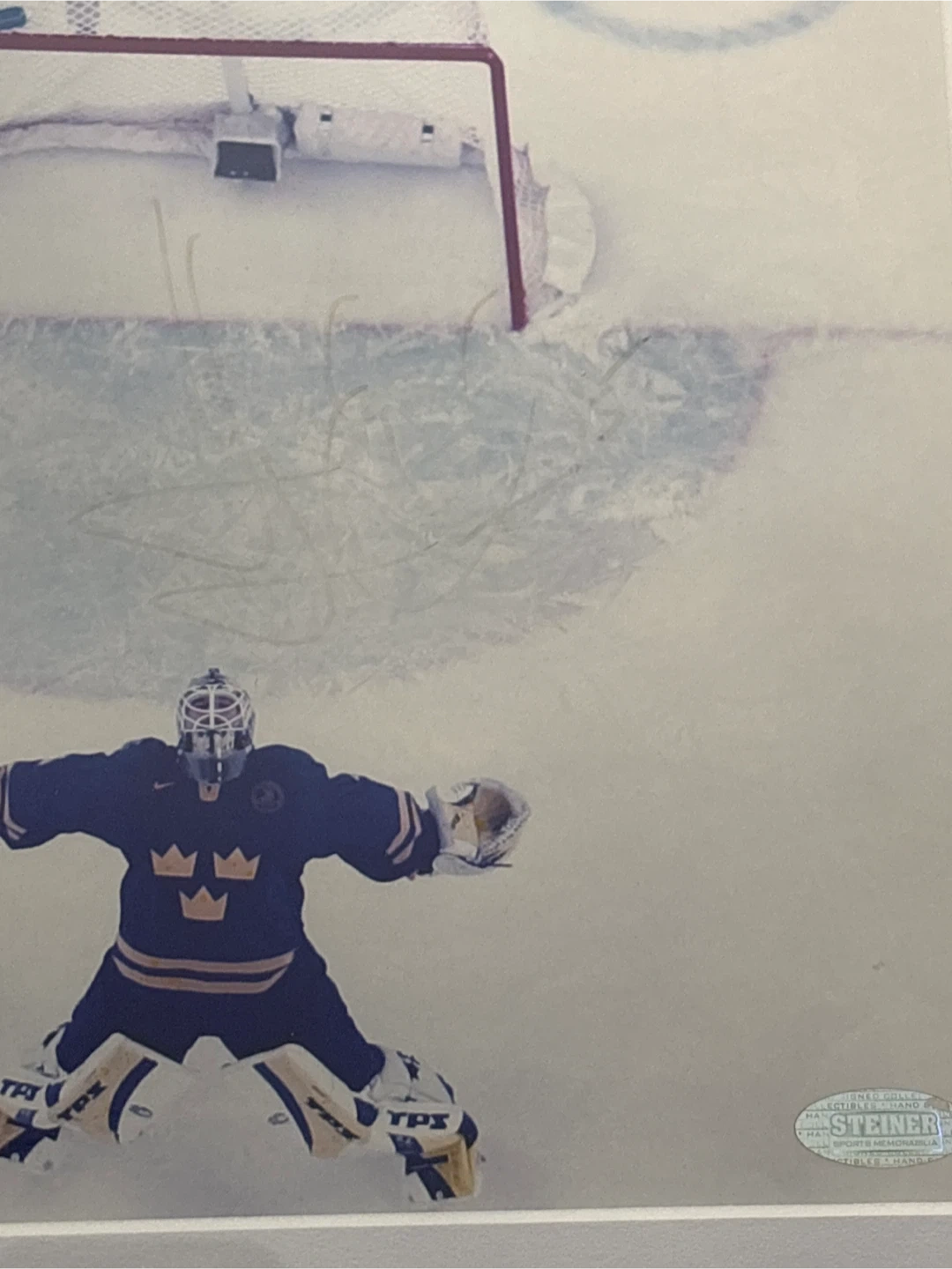 Framed photo from the Torino 2006 Olympics featuring a Swedish hockey goalie, autographed by Henrik Lundqvist #5. (Signature fade due to light exposure) Includes Steiner Sports Memorabilia authentication. Ready to hang. 13x15 inches