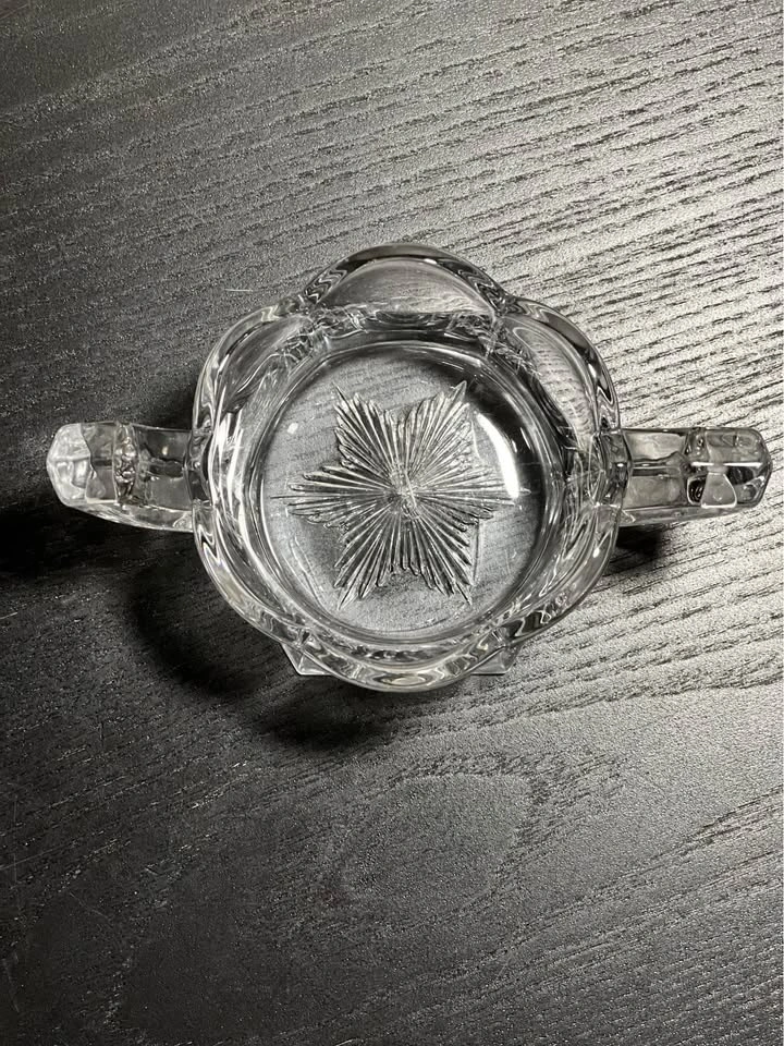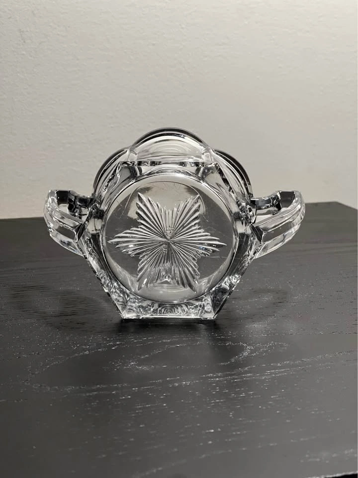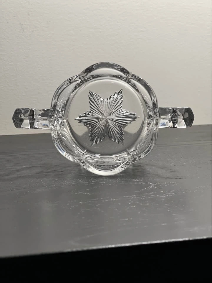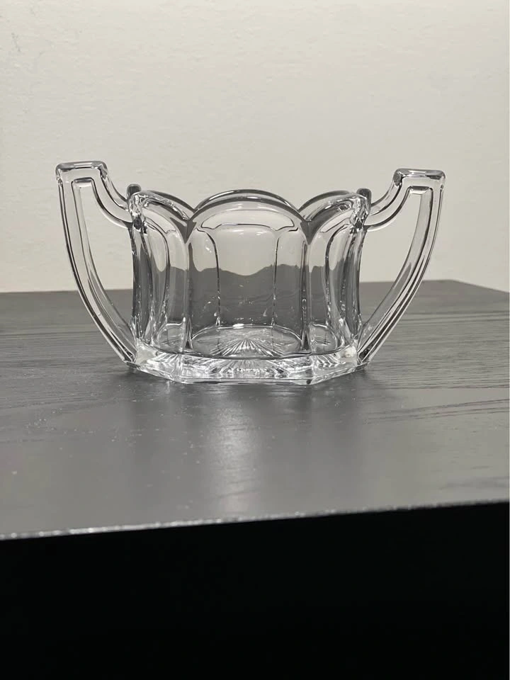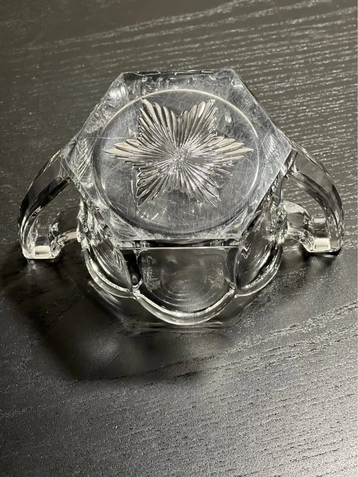 131The item is a Krys-Tol open sugar bowl, also known as a handled nappy or trophy vase, made by the U.S. Glass Company or Jefferson Glass Company in the early 1900s. This piece belongs to the "Chippendale" or "Hexagonal Chippendale" pattern, which is a heavy pressed glass design. The glass was known for its brilliance, achieved through a specific finishing and polishing method. Measurements: 5.5” handle to handle and approximately 3” high at the handle Pickup is 58th and 7th Ave midtown Manhattan