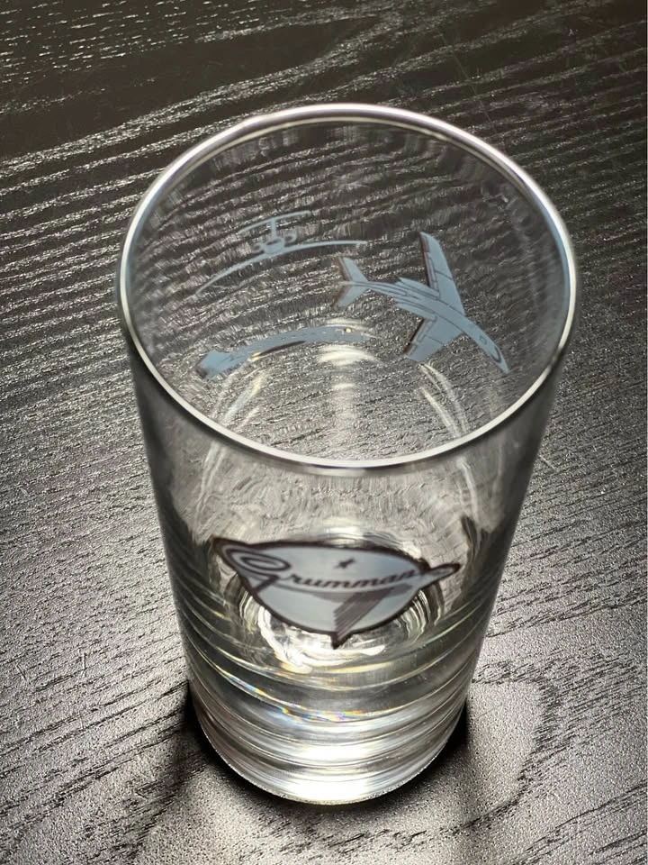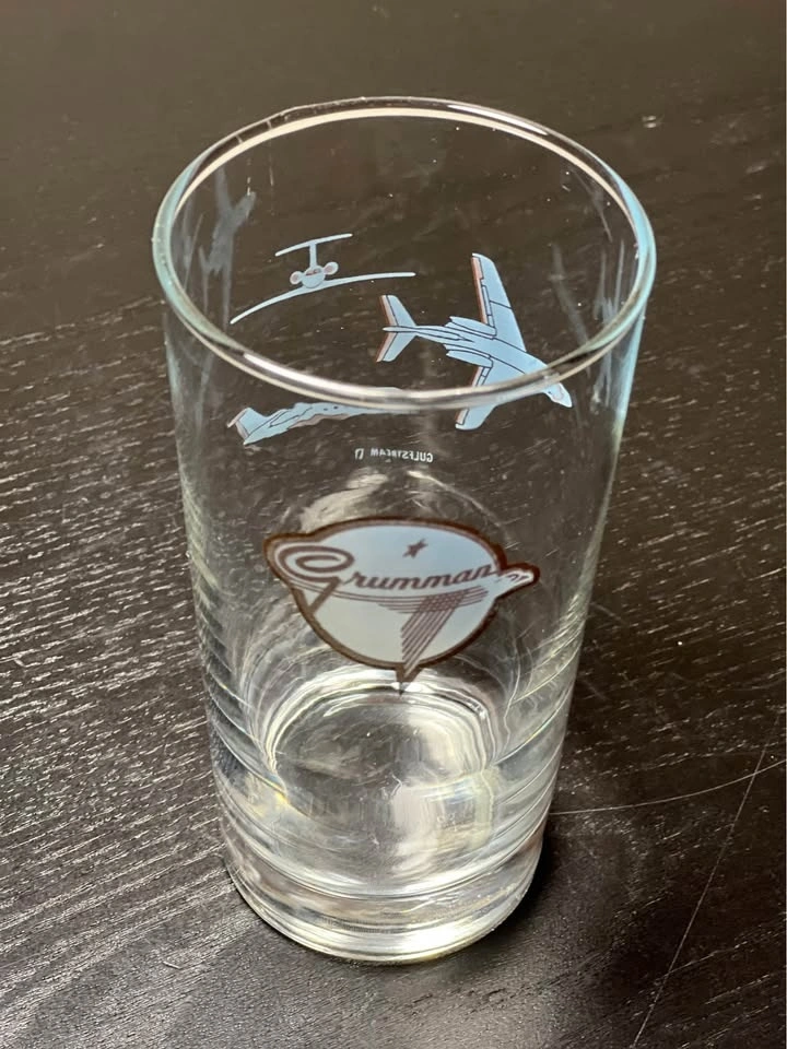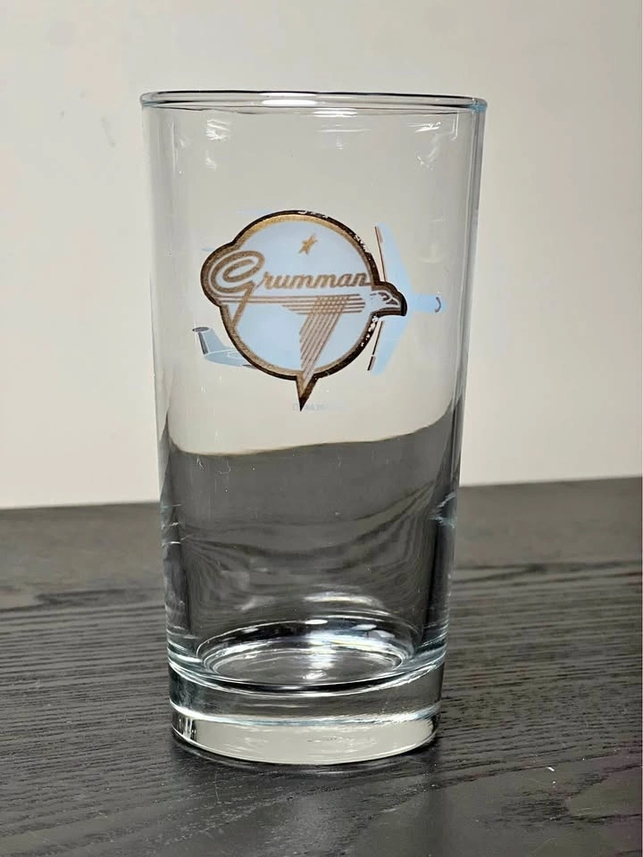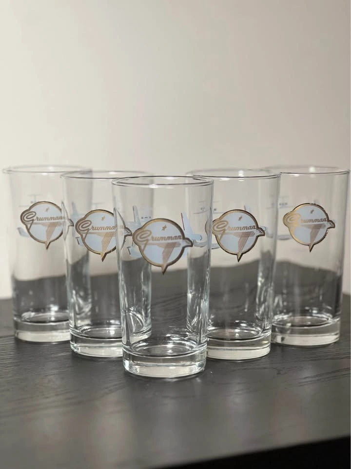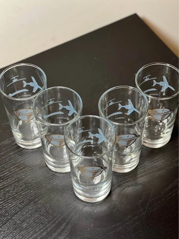 These are vintage Grumman Aircraft commemorative barware glasses. They feature a gold and blue Grumman logo on the front and three smaller aircraft designs, specifically the Gulfstream II jet, on the back. They stand approximately 5.25 inches high with a 2.75-inch rim diameter. These glasses were produced to commemorate the Gulfstream II, a business jet manufactured by Grumman between 1967 and 1979. Some sets were also reportedly used as props in the television series Mad Men. Pickup is 58th and 7th Ave in Midtown Manhattan.