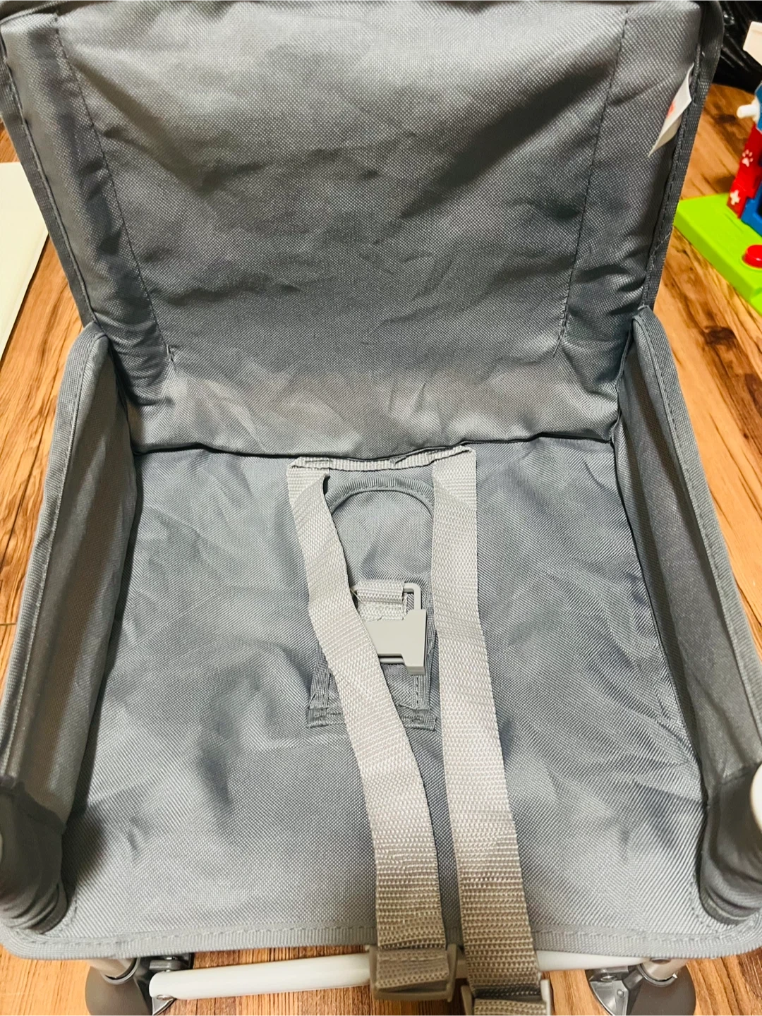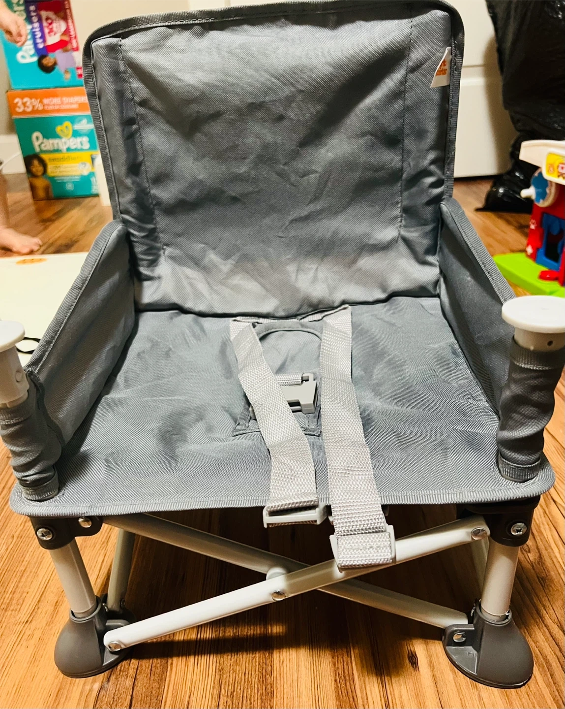- Safety features include 3 point harness and straps for attaching to adult chair