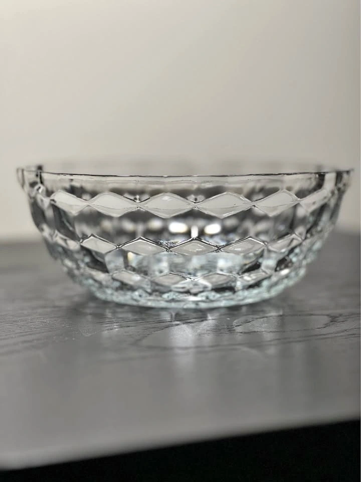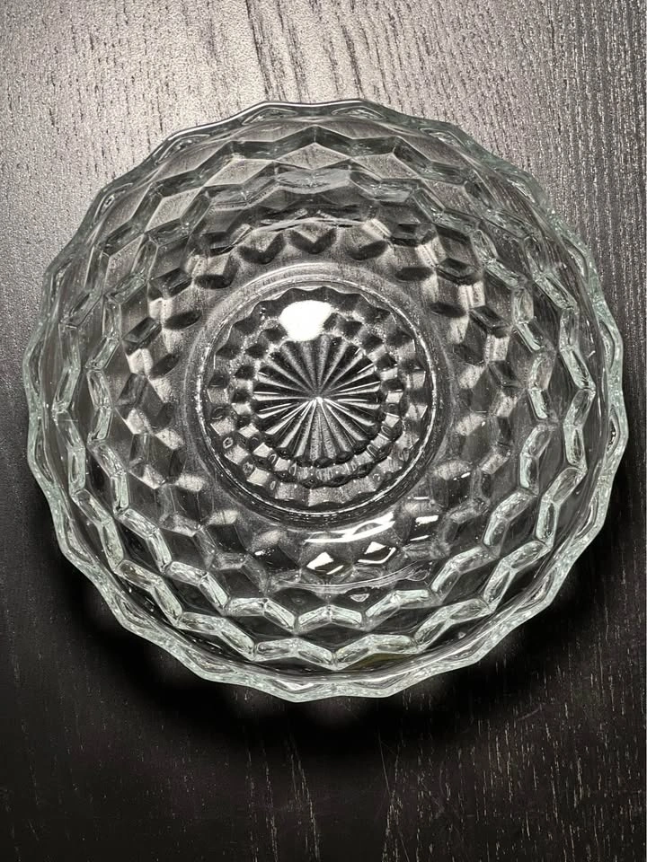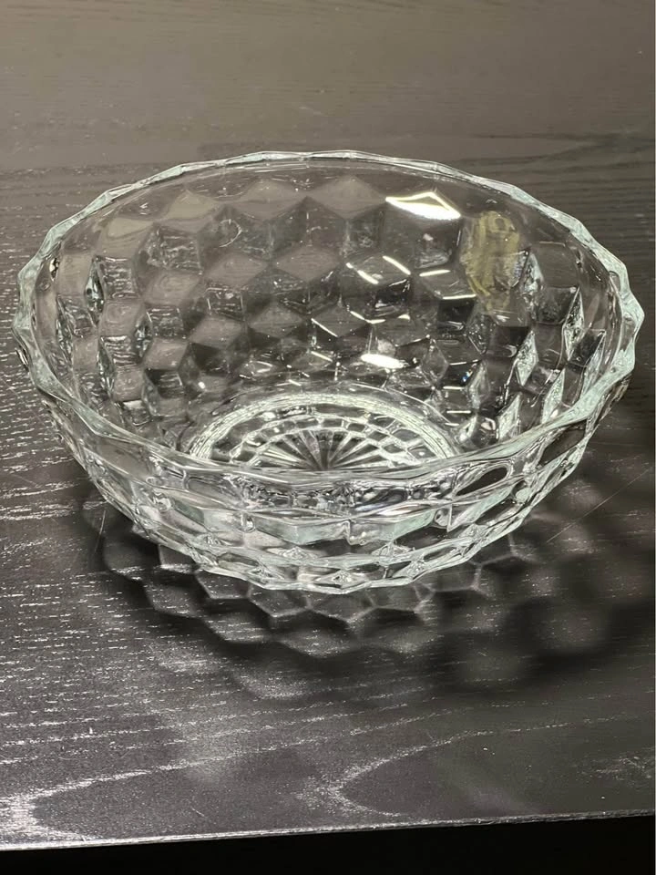 This is a beautiful clear glass bowl from Fostoria American glassware, featuring their distinctive three-dimensional cubist or diamond geometric design. This pattern, often called "American," "Cubist," or "Cube" (Stem #2056), was first produced by Fostoria Glass Company around 1915 and was made for many years. This 6.5-inch diameter piece is commonly used as a candy or nut dish. It's made of pressed clear crystal, which has a nice weight to it and catches the light wonderfully with its angular facets. Pre-owned. Pickup is at 58th and 7th Ave in Midtown Manhattan.