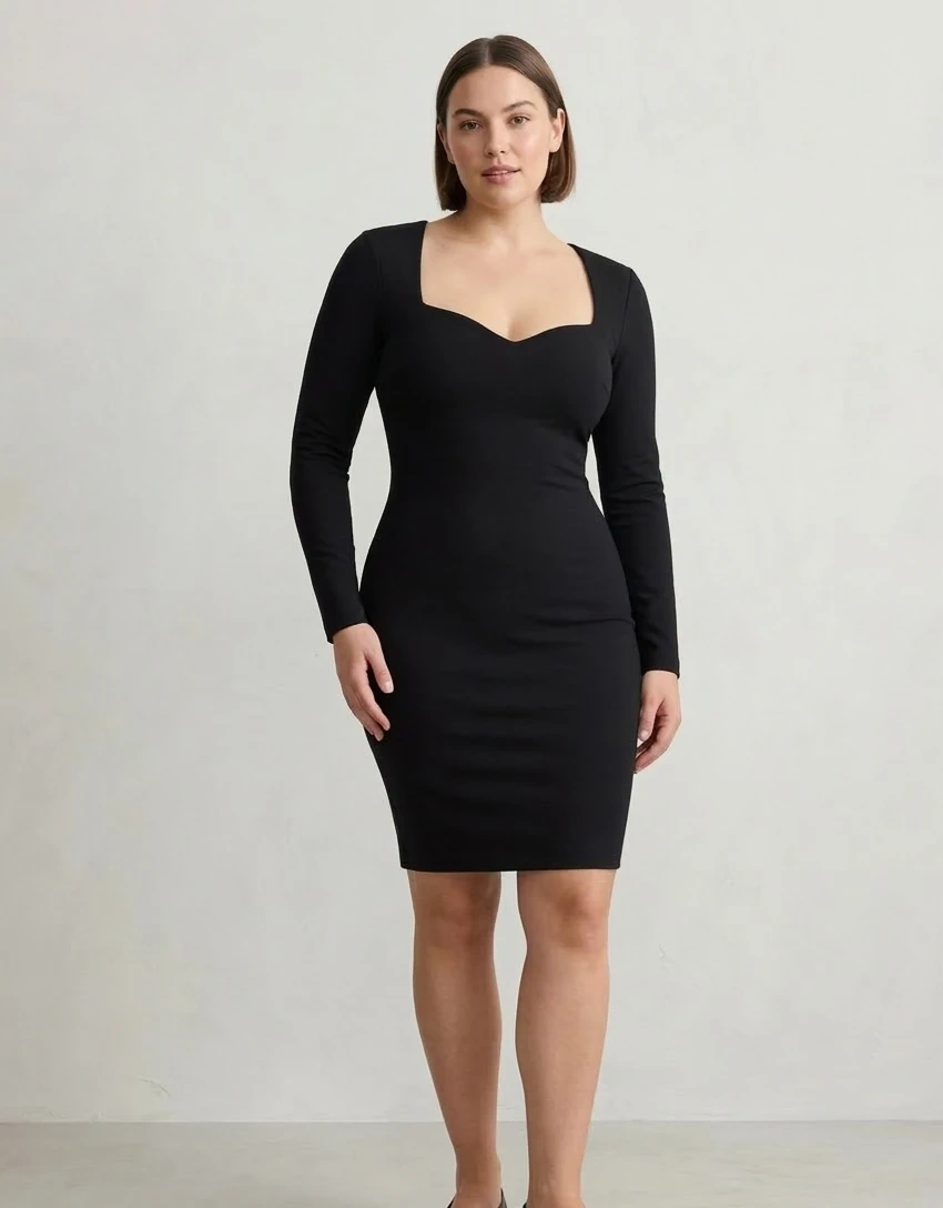 This black coffee dress features a flattering sweetheart neckline and long sleeves. It's designed in a classic black colour. This dress is perfect for an evening out or a special occasion!