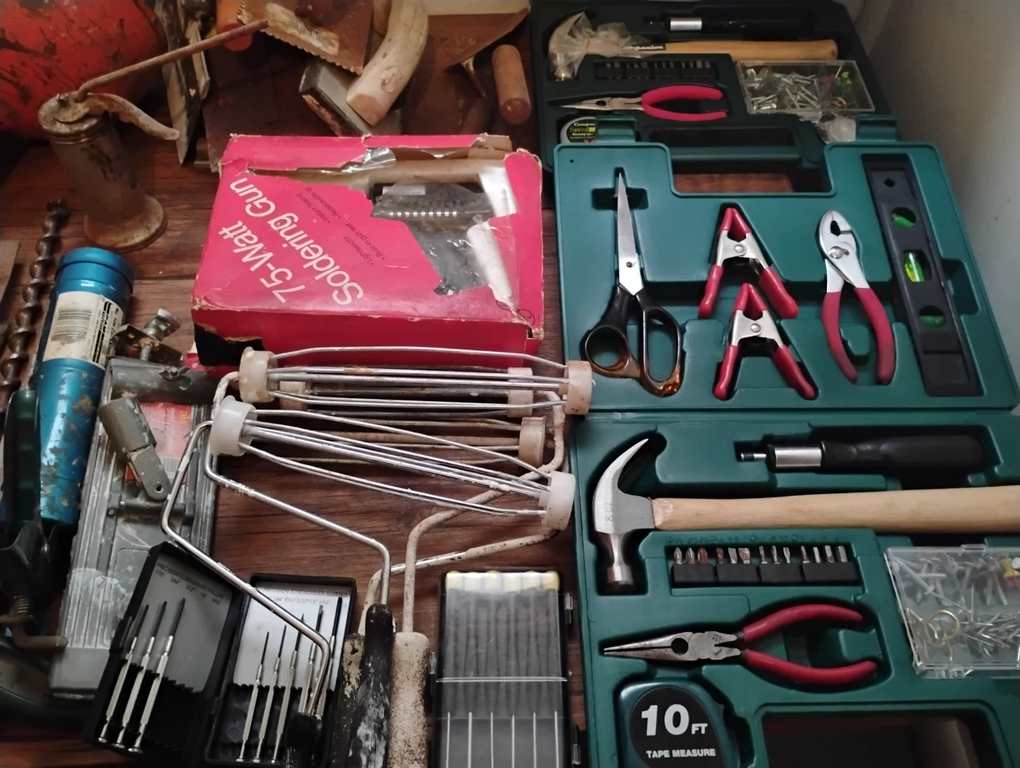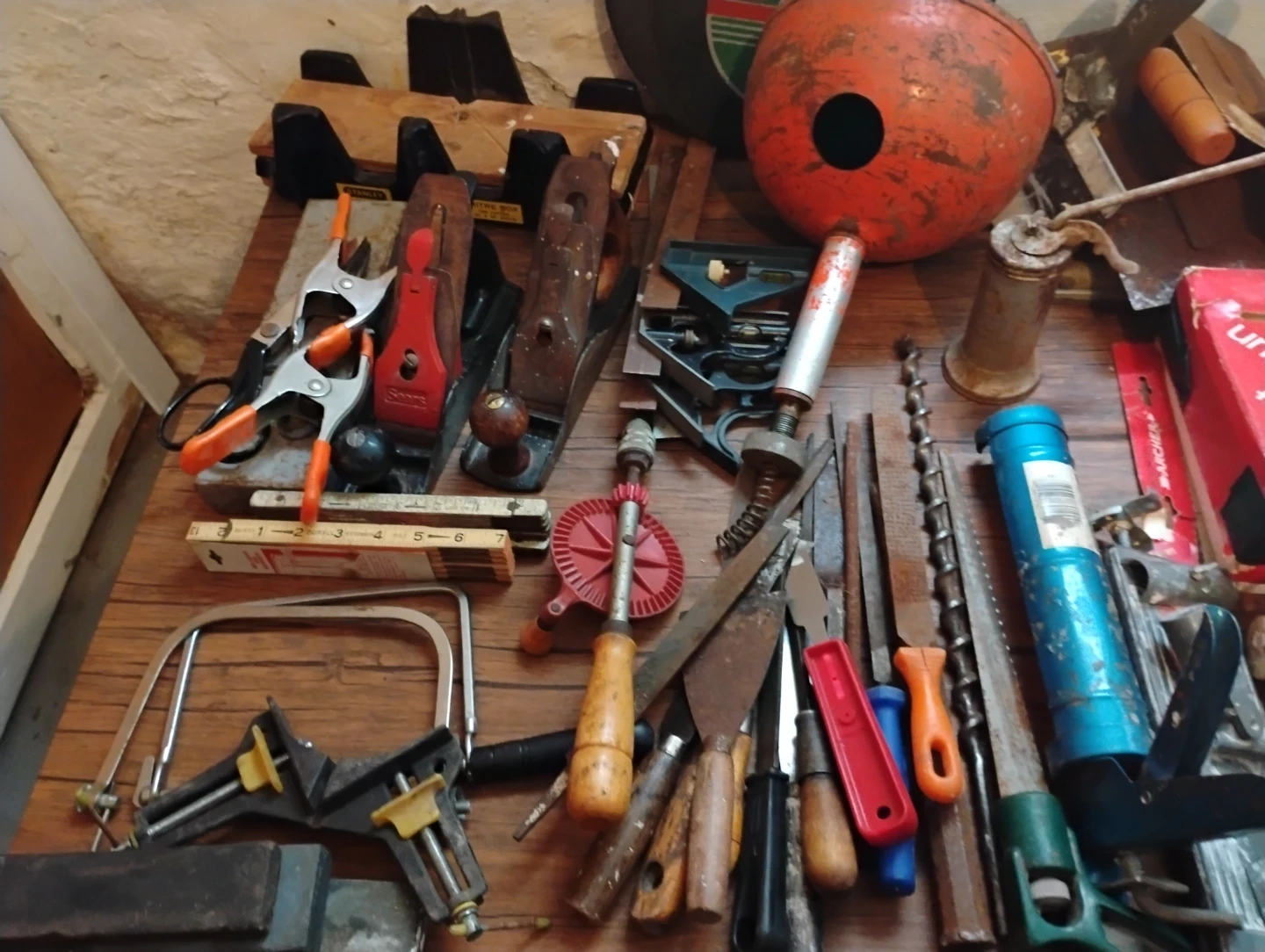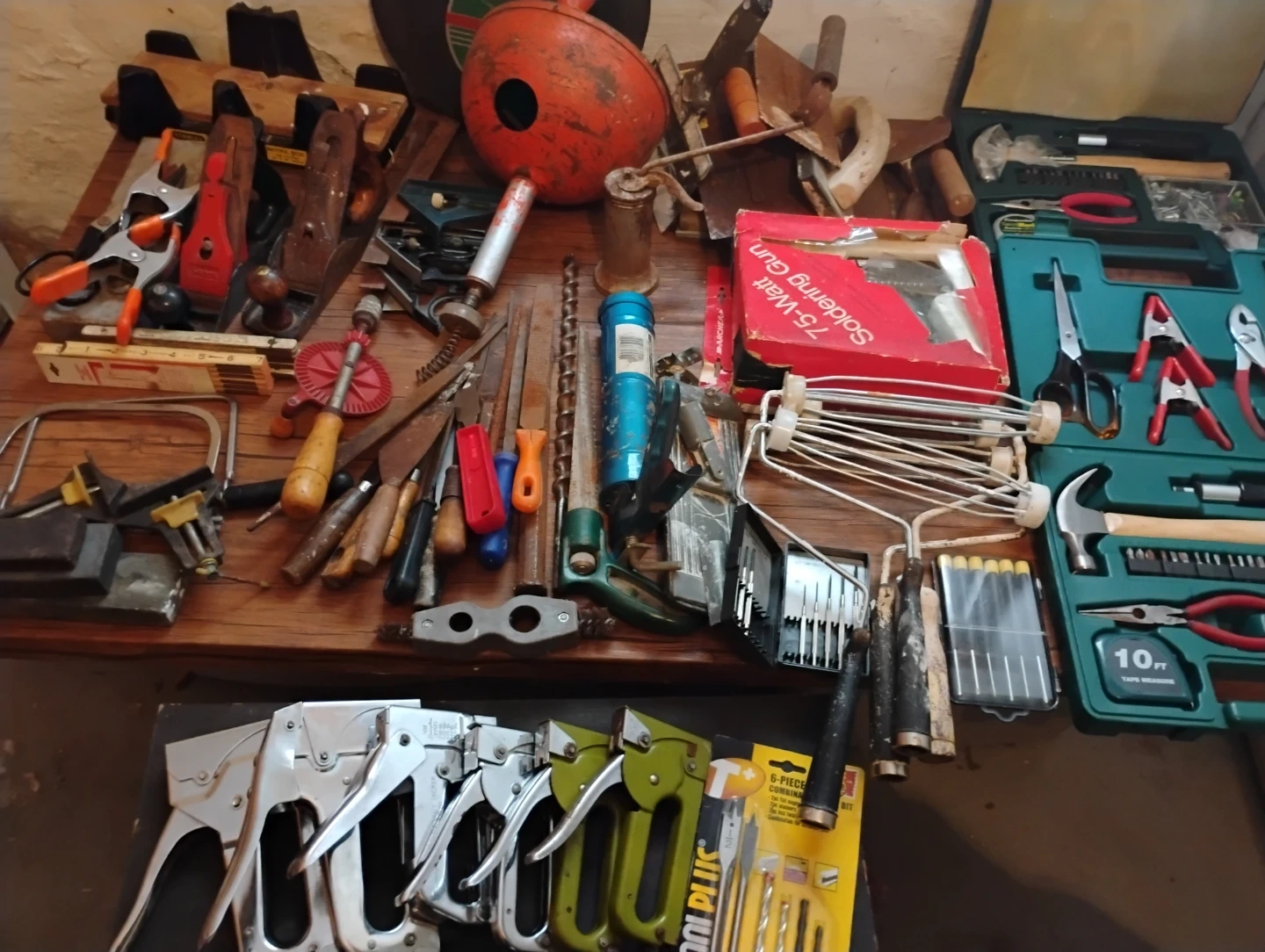 Collection of various hand tools including planes, clamps, saws, drills, and a soldering gun. Also includes measuring tools and other hardware..Text for prices or asking 100.$ for all.make offer.