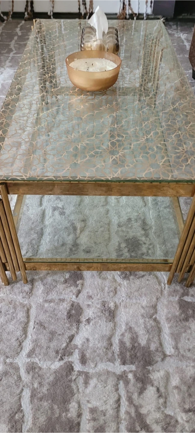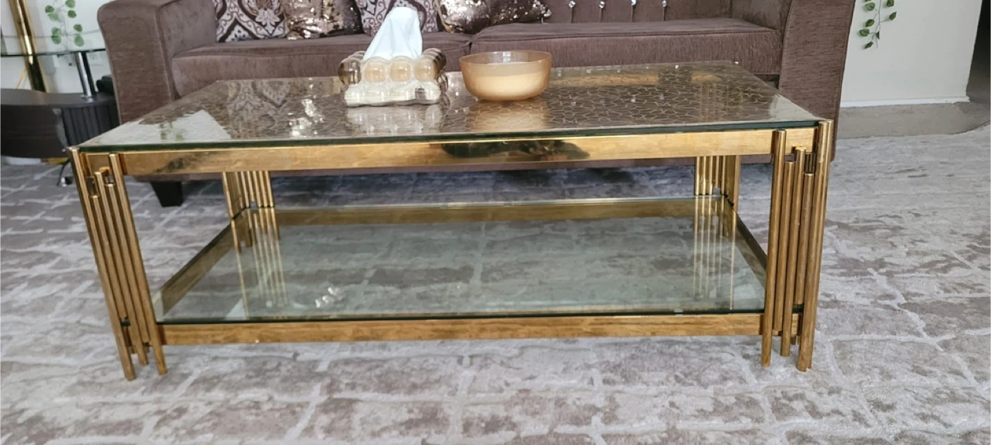 Selling a coffee table with a gold finish and glass top and shelf. It's in great condition and would look lovely in any living room!