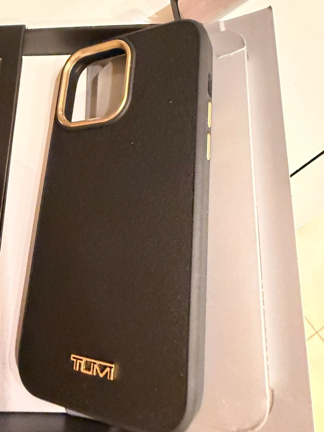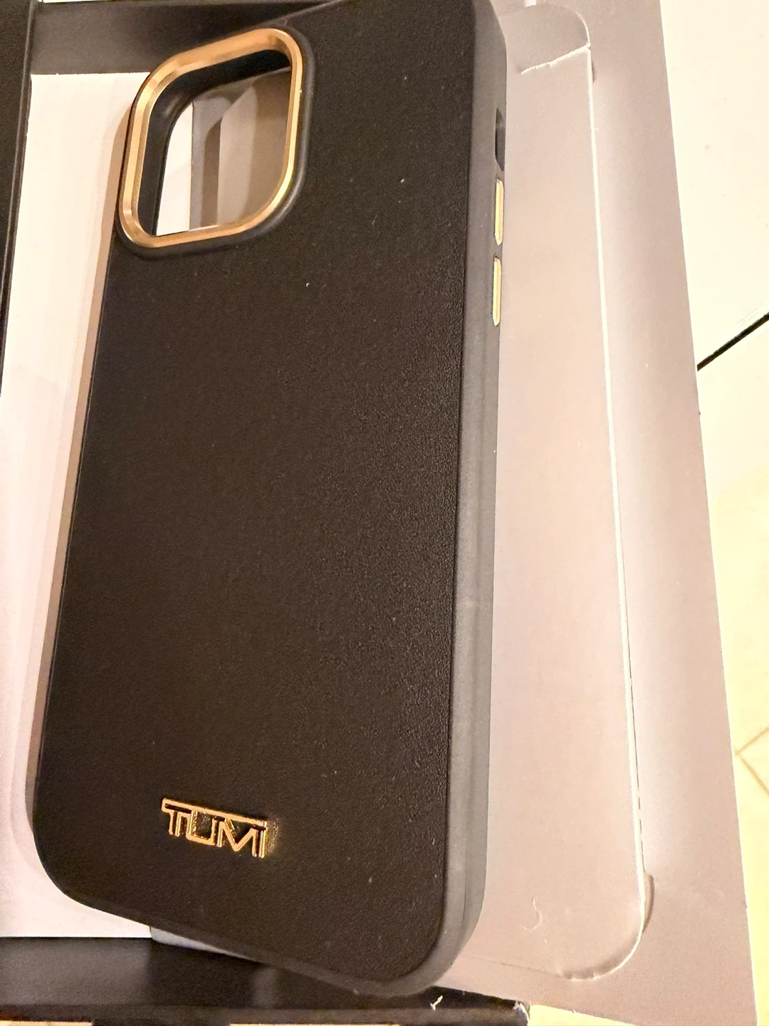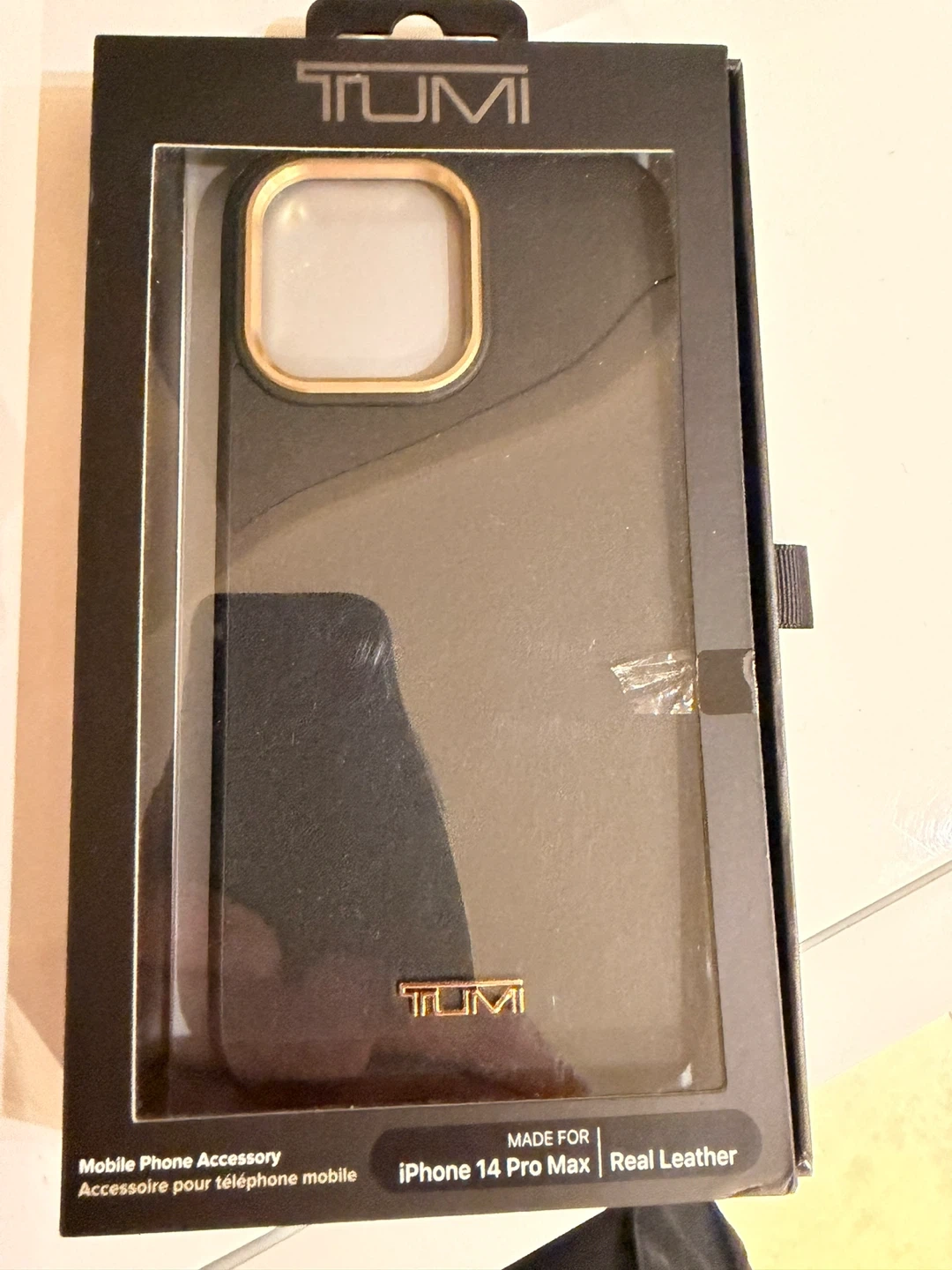 Selling a brand new TUMI iPhone 14 Pro Max case! It's black with gold accents and made of real leather. The box says it has a raised edge for extra screen protection and a slim, sleek design. Easy snap-on too! Never been used.