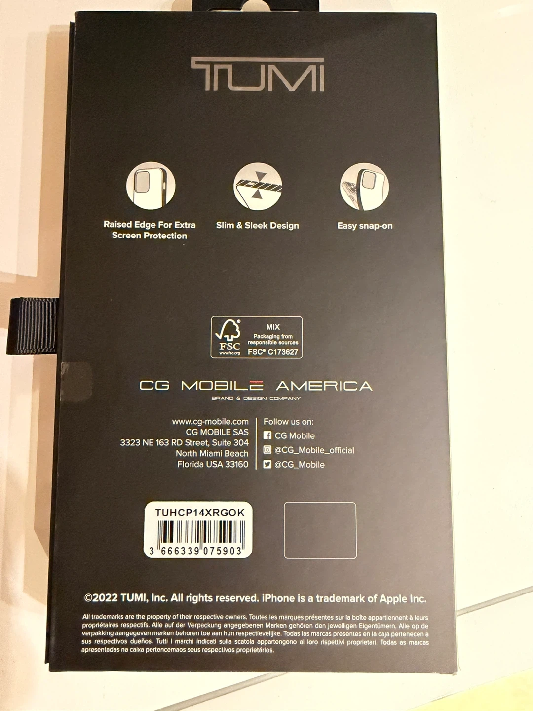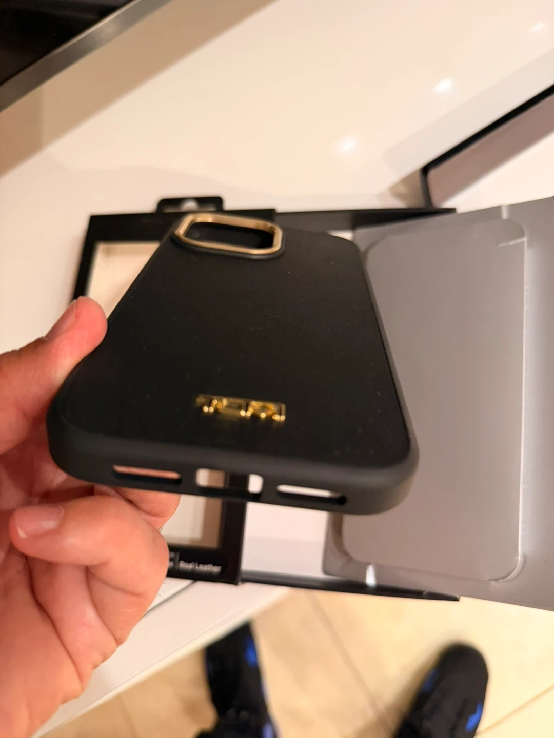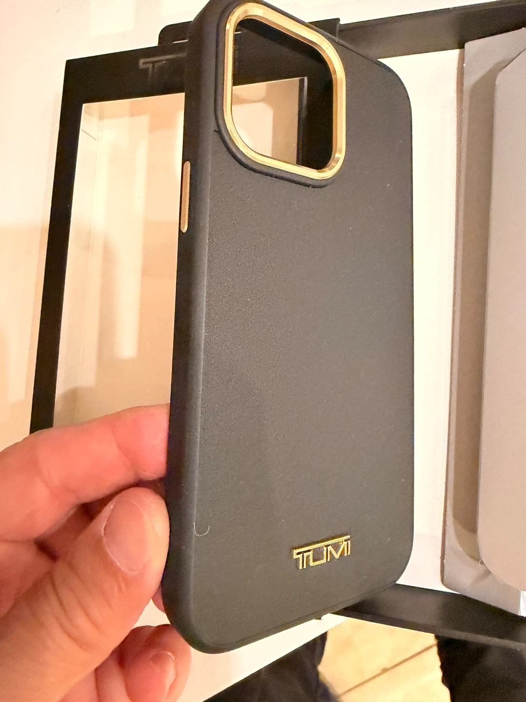 Selling a brand new TUMI iPhone 14 Pro Max case! It's black with gold accents and made of real leather. The box says it has a raised edge for extra screen protection and a slim, sleek design. Easy snap-on too! Never been used.