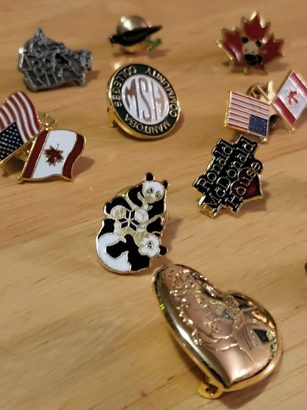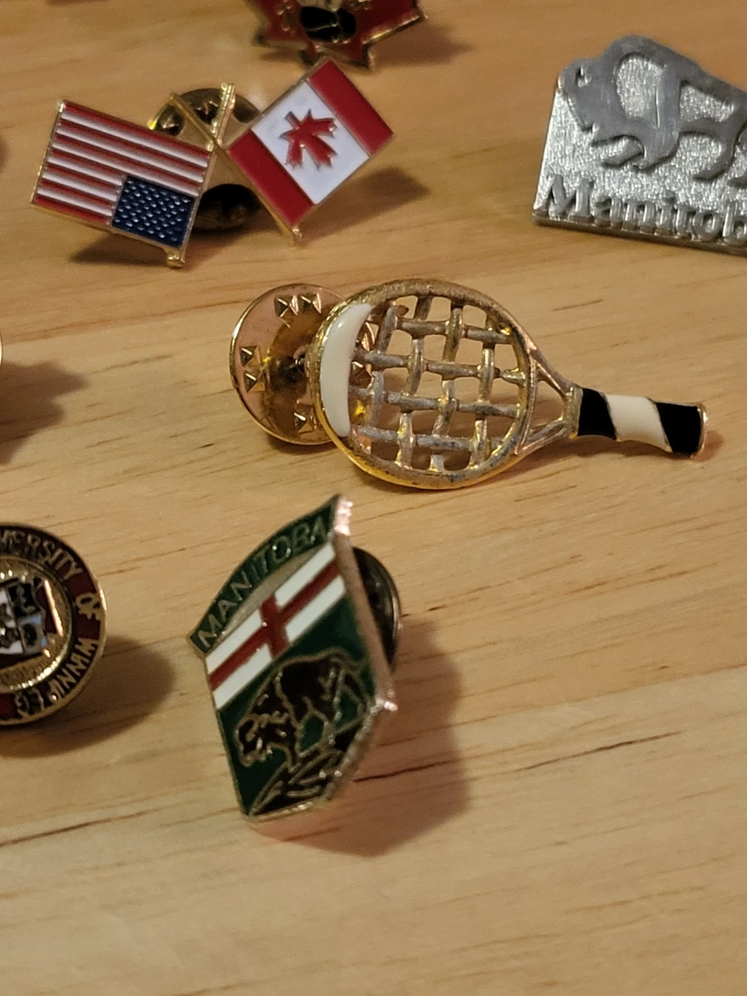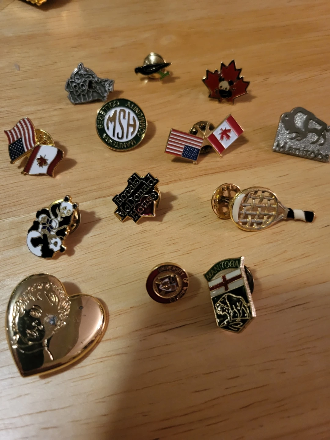Bundle of 13 various collectible enamel pins. Includes designs featuring Canadian and American flags, Manitoba provincial symbols, a tennis racket, a panda bear, a heart, and university/organizational logos like Ronald McDonald House.