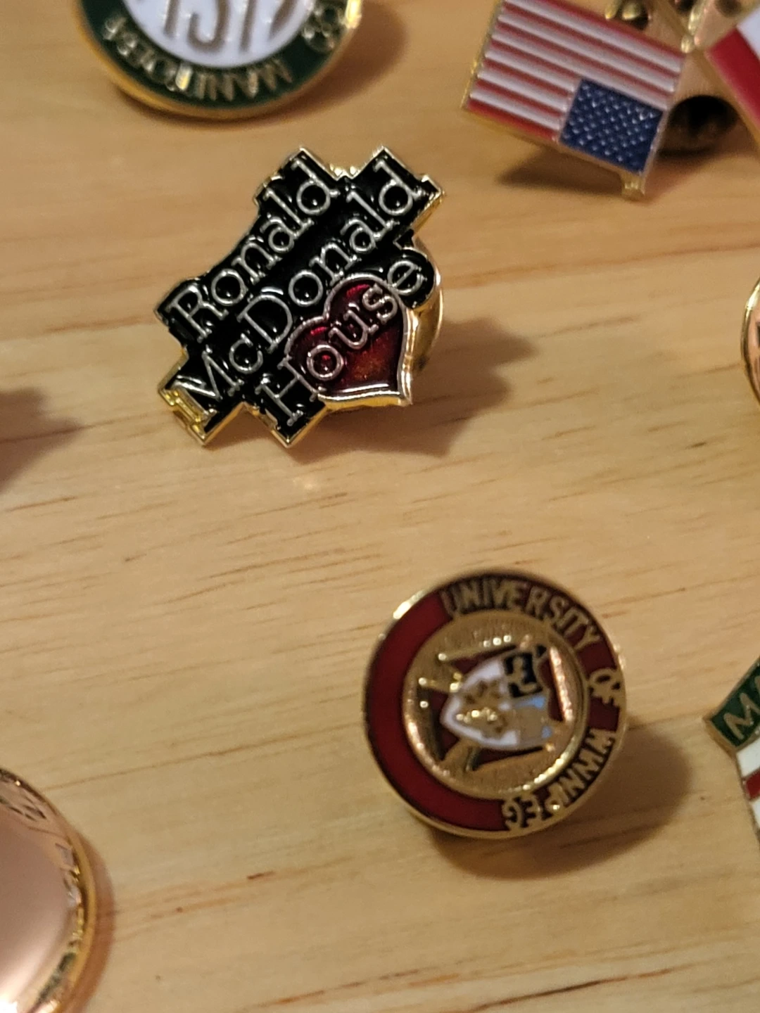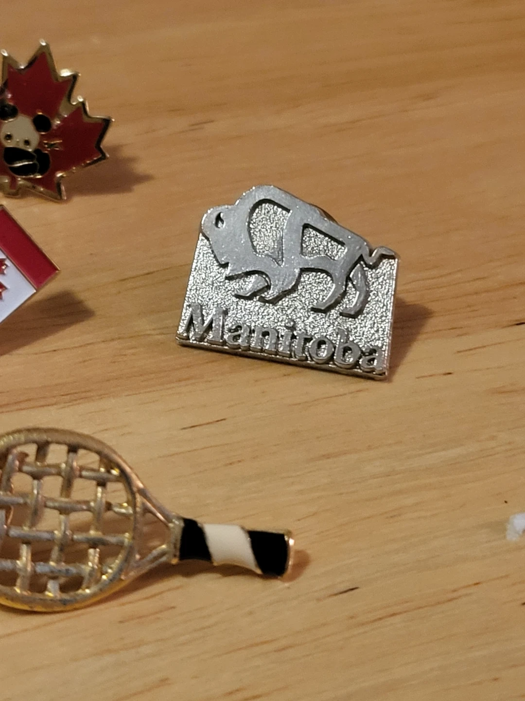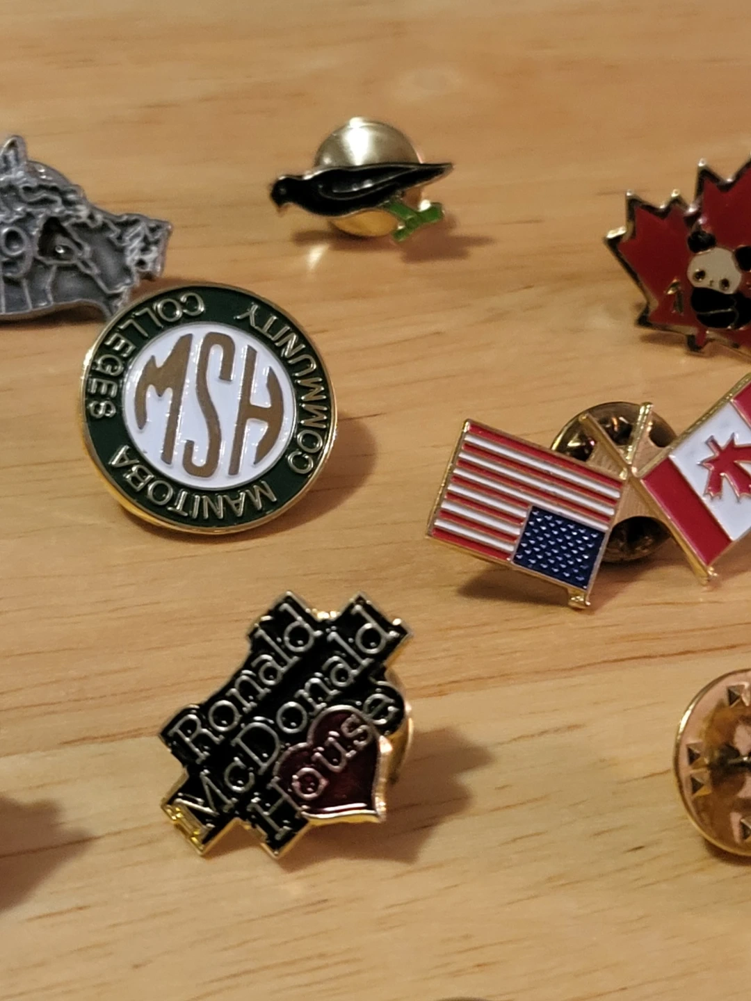 Bundle of 13 various collectible enamel pins. Includes designs featuring Canadian and American flags, Manitoba provincial symbols, a tennis racket, a panda bear, a heart, and university/organizational logos like Ronald McDonald House.