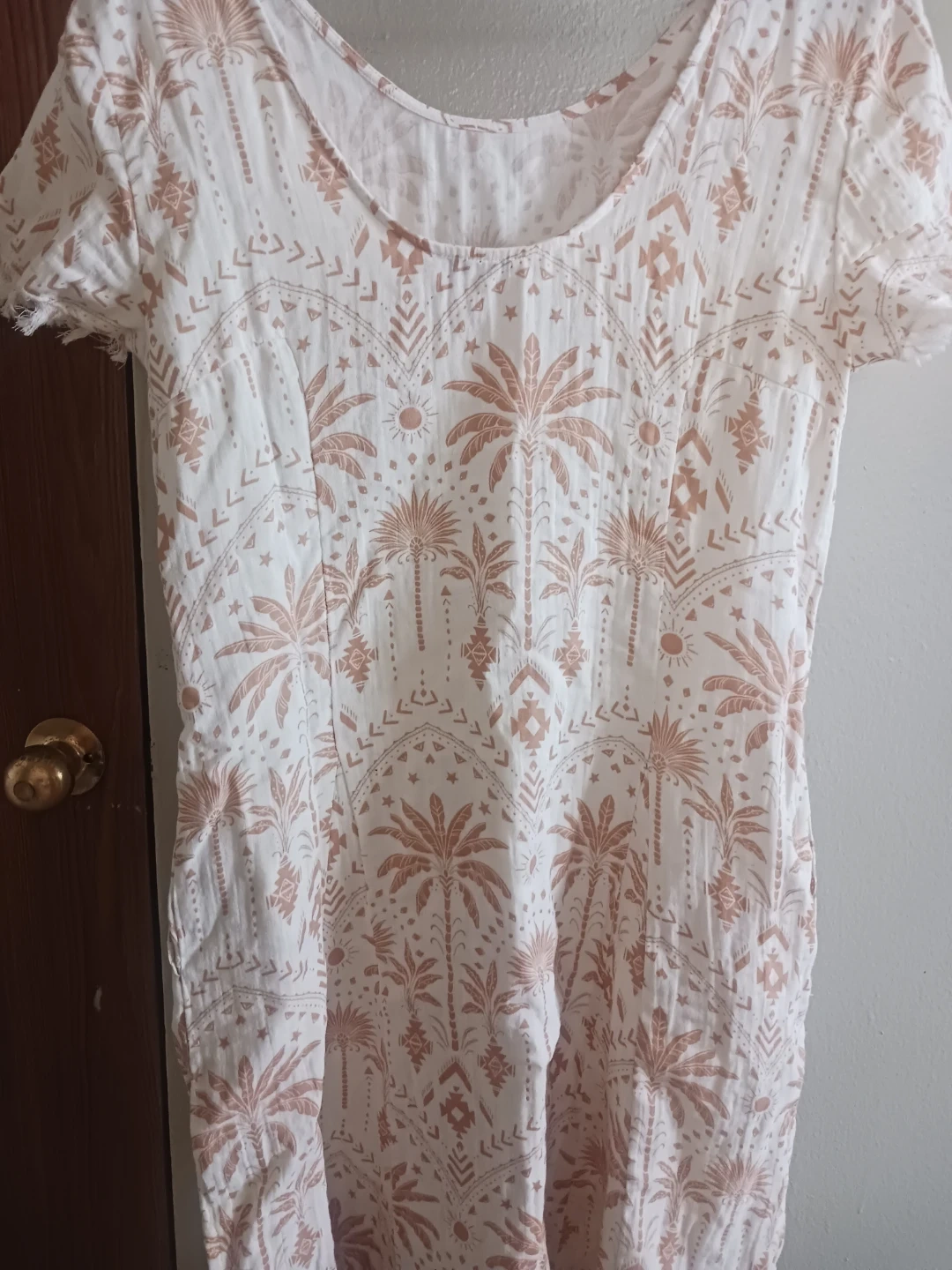 White cotton dress with a rose gold palm tree print. Short sleeves with frayed trim. Knee-length.