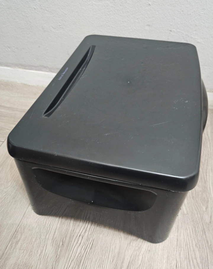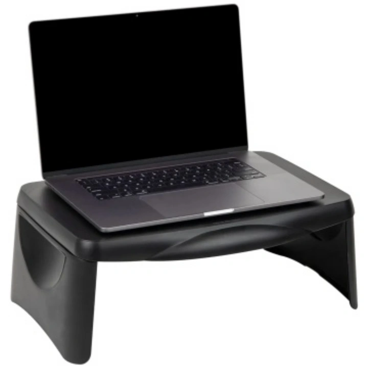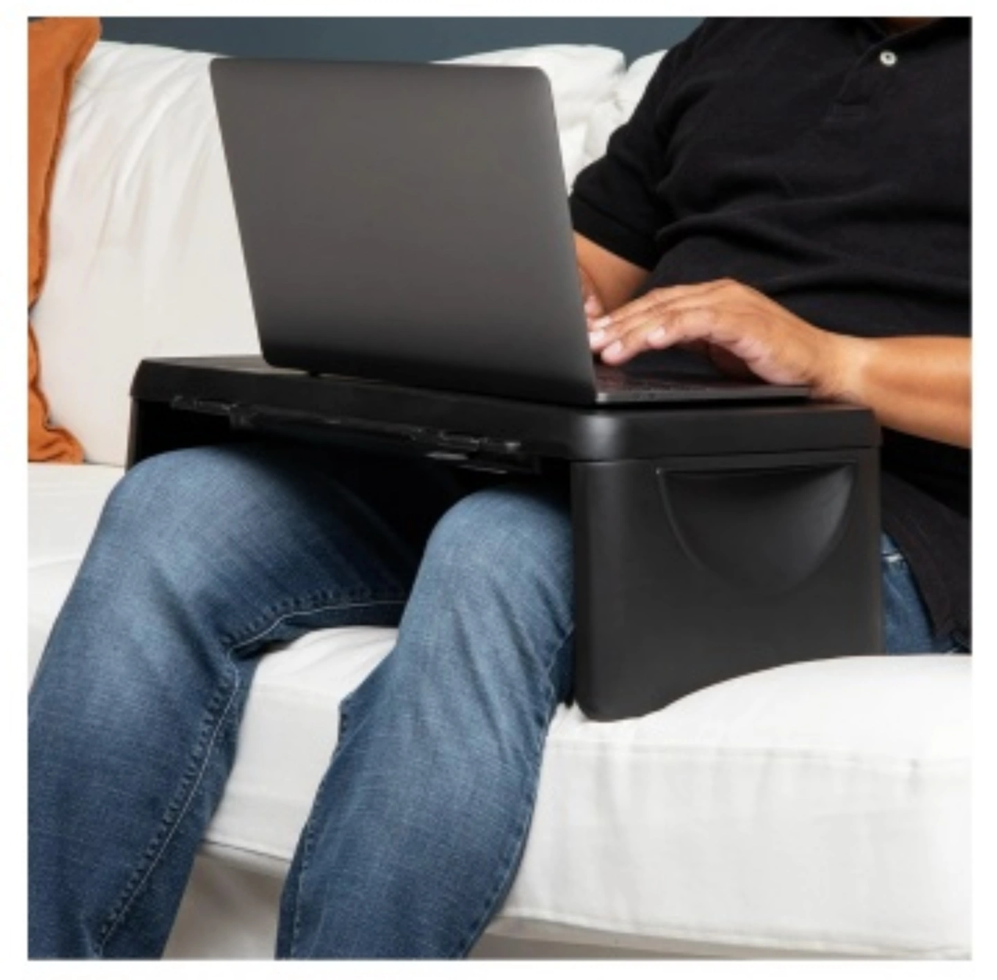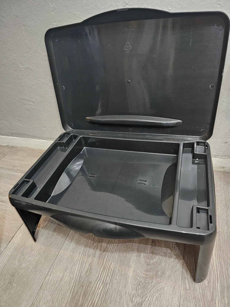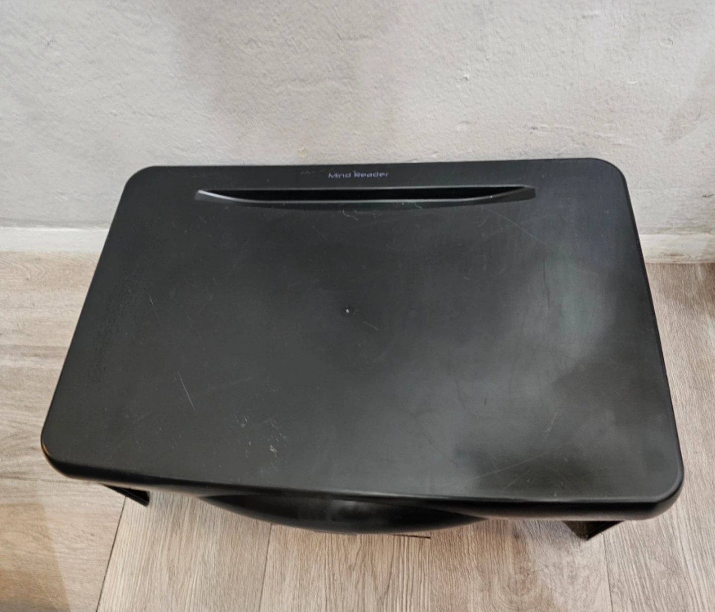 Black plastic mind reader. Good for reading in bed or on the couch. It has a built-in slot to hold a book or tablet. There is storage space for items underneath. The reader folds for compact storage.
