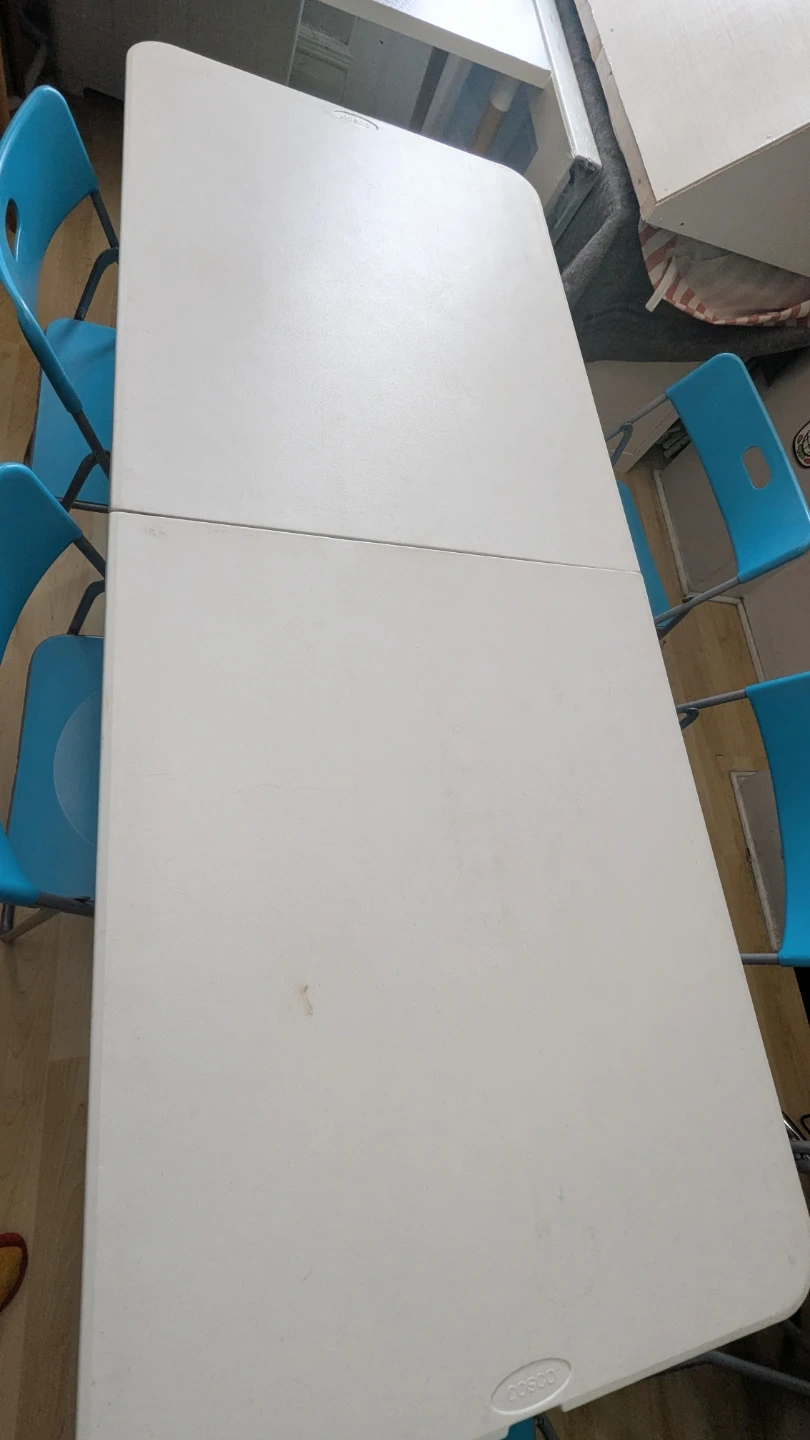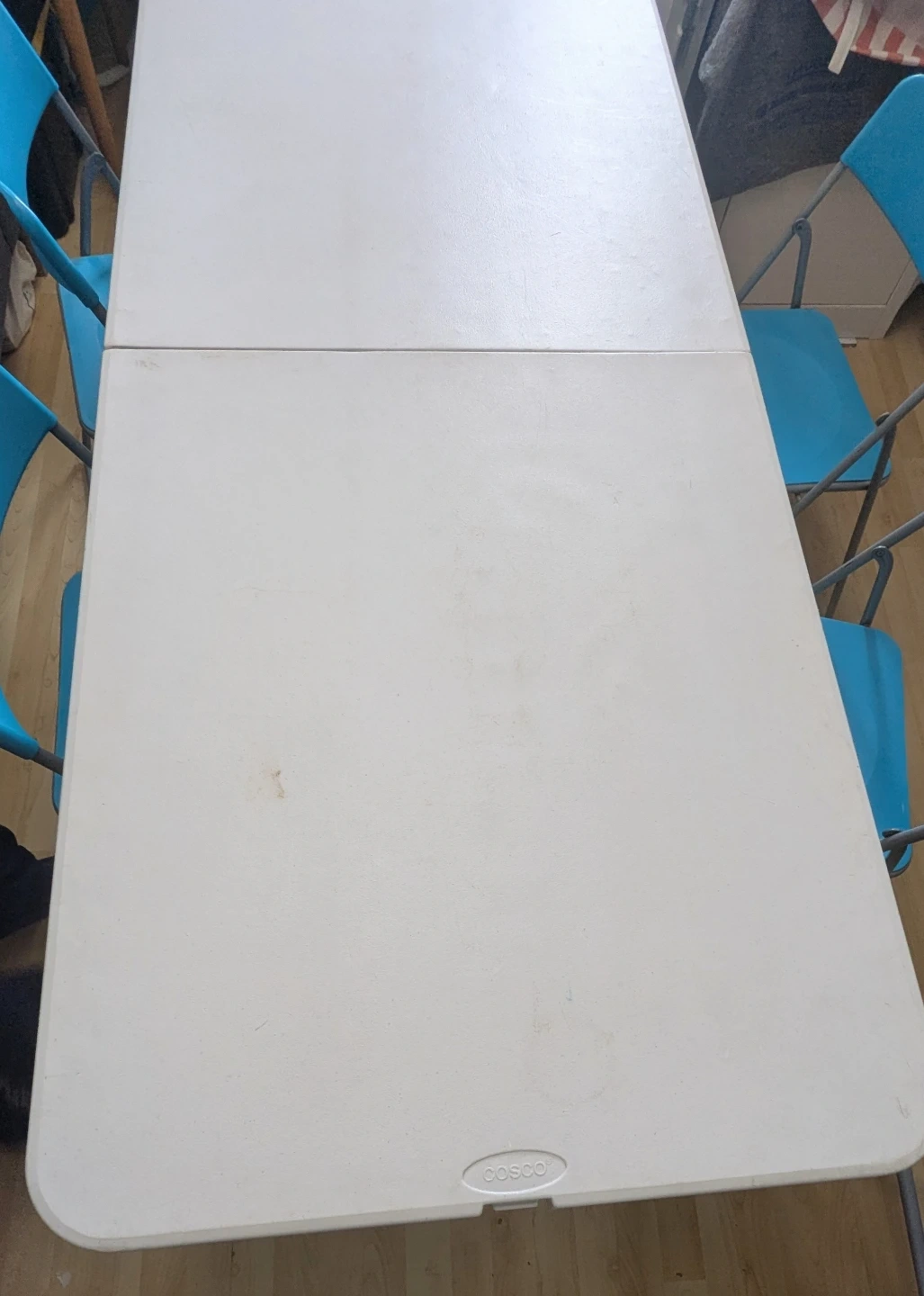 This is a white folding table from Cosco. It's a rectangular table with a split top that folds in half. Plastic material.
