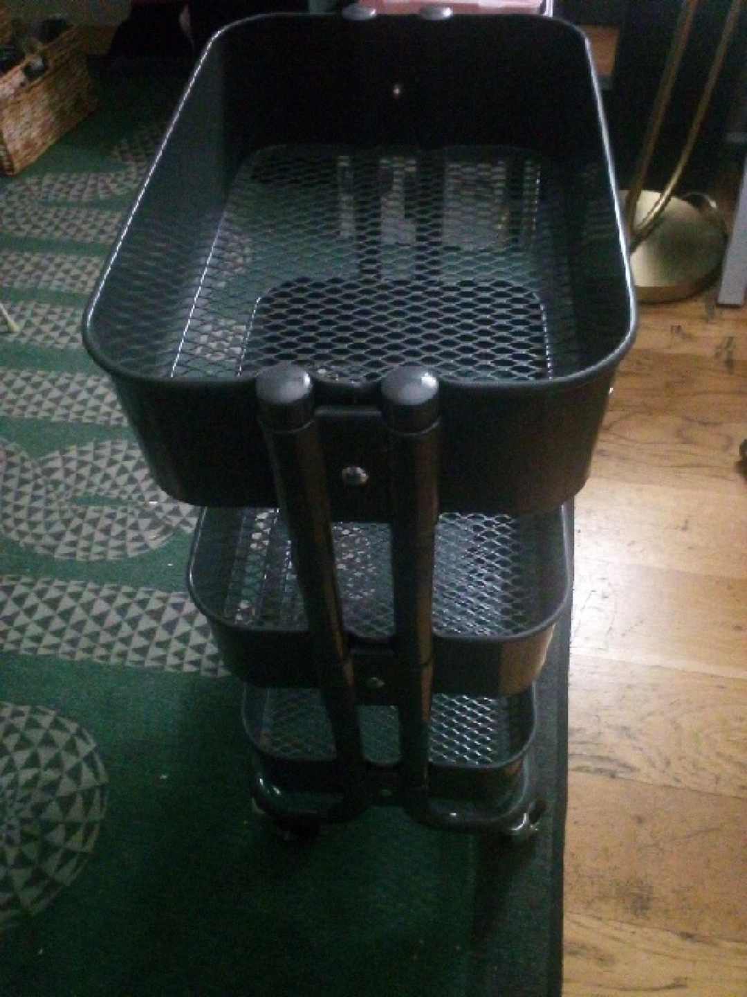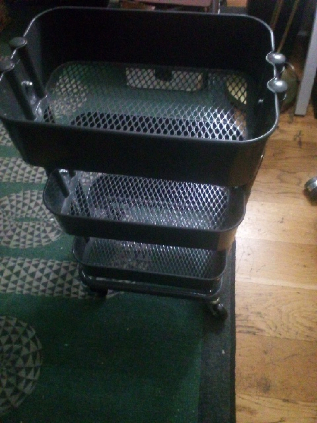 Black metal rolling cart. Three tiers with mesh bottoms. Great for storage and organization. Wheels for easy mobility.