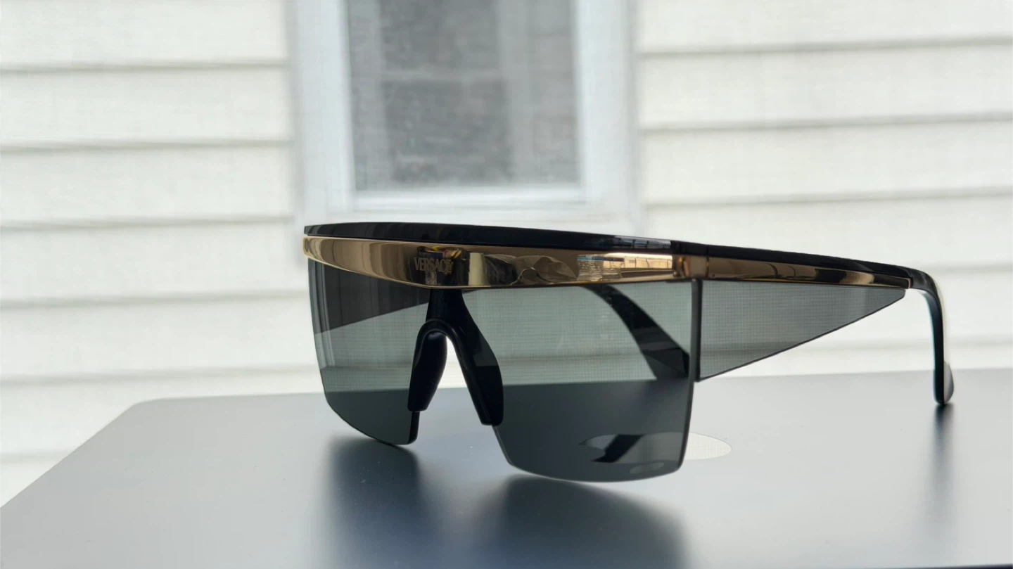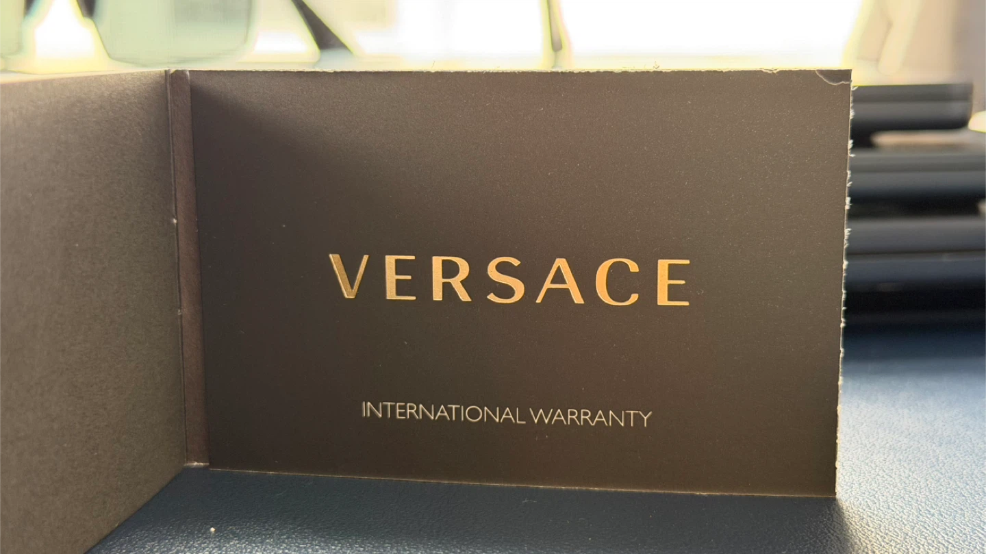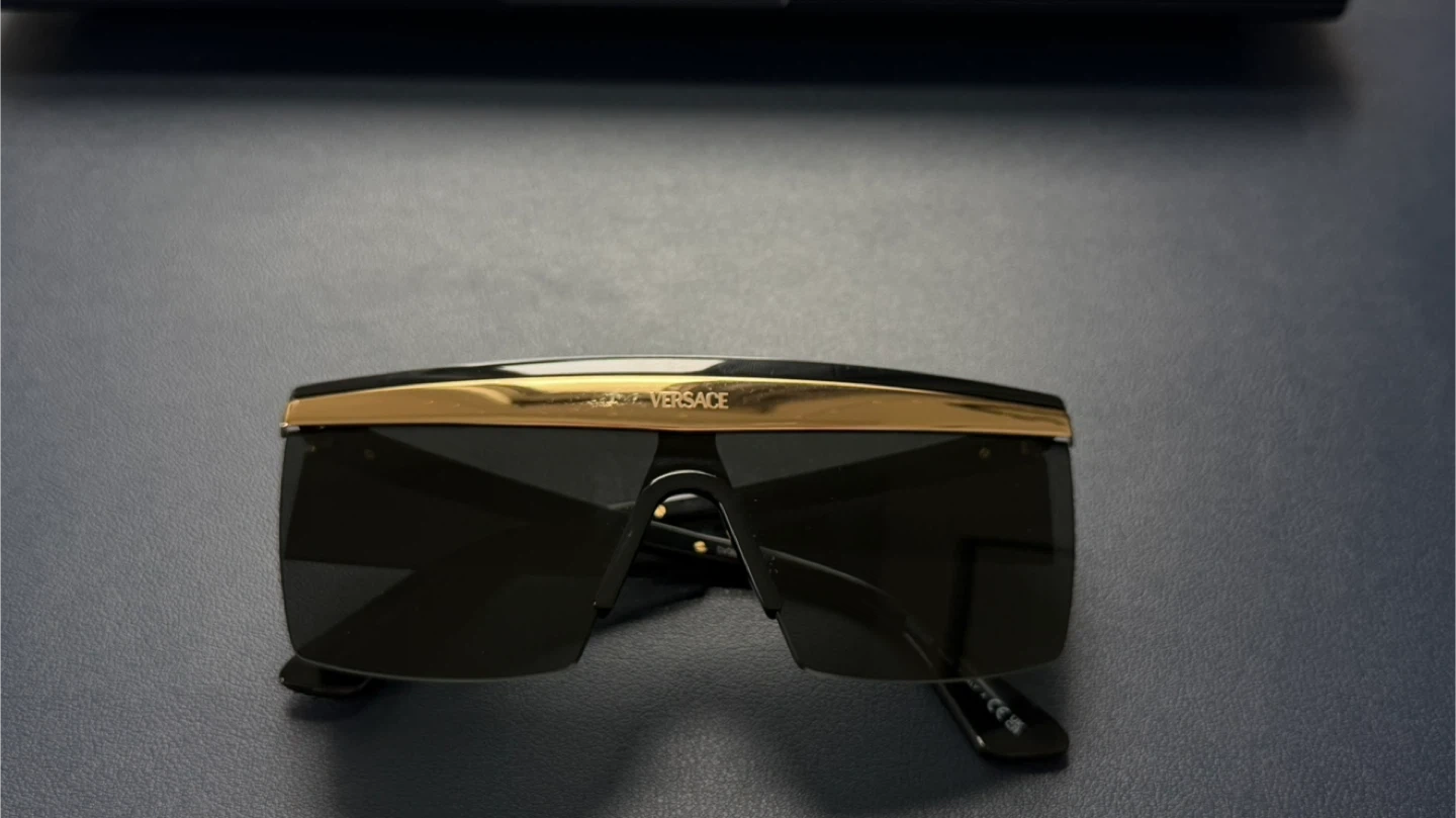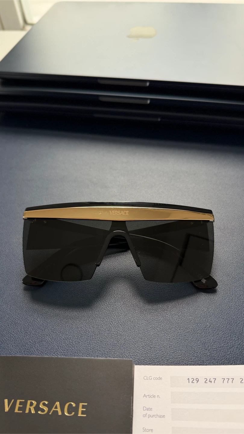 These are Versace sunglasses. They feature a shield-style lens with a gold accent bar. Includes international warranty card. Not used even ones comes with original case and manual.