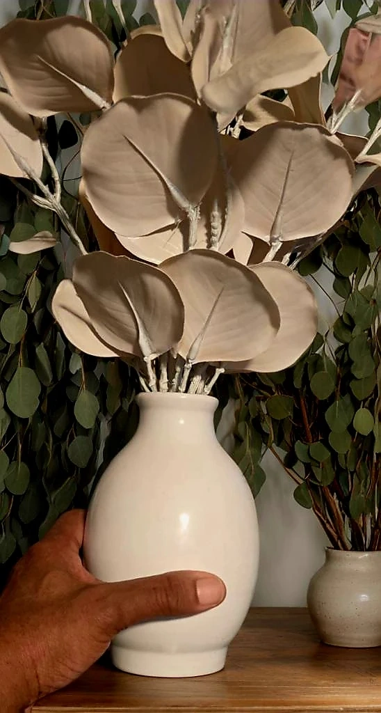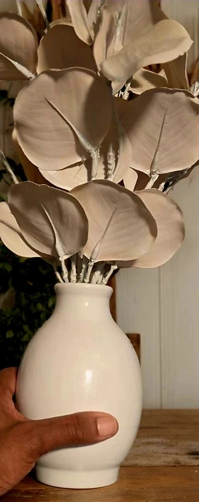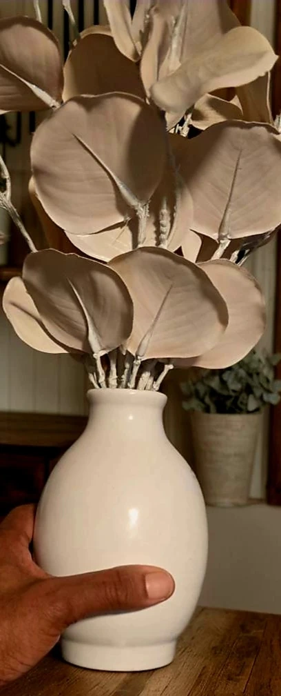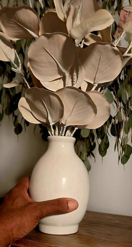 🥕Add a touch of natural beauty to your home decor with this elegant ceramic white vase. It's filled with realistic faux eucalyptus stems for a lasting, low-maintenance display. The vase measures approximately 7 inches tall and 5 inches in diameter at its widest point. This decorative set is perfect for adding charm to any room!