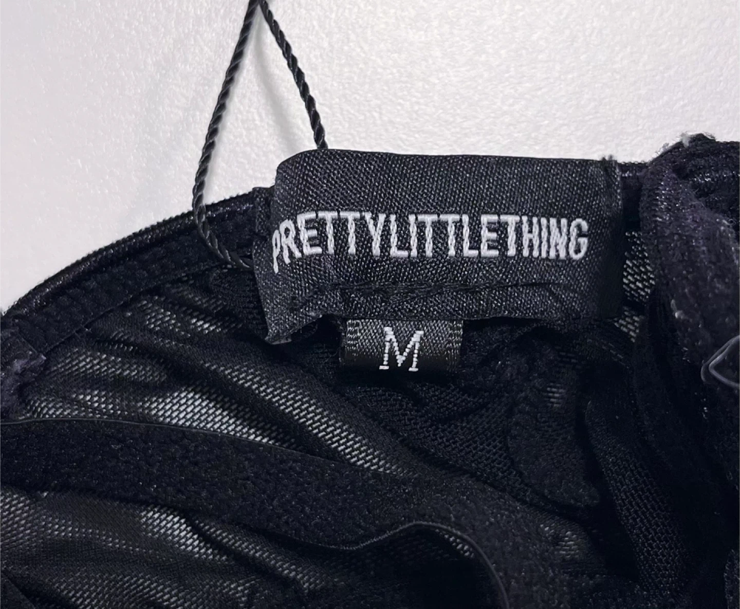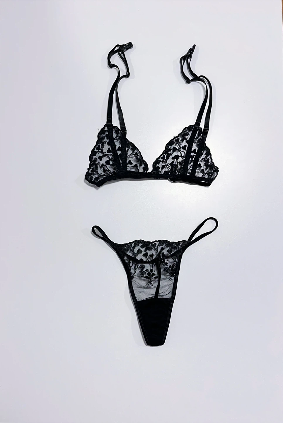 PrettyLittleThing Black Lace Bralette and Thong Set - Size M