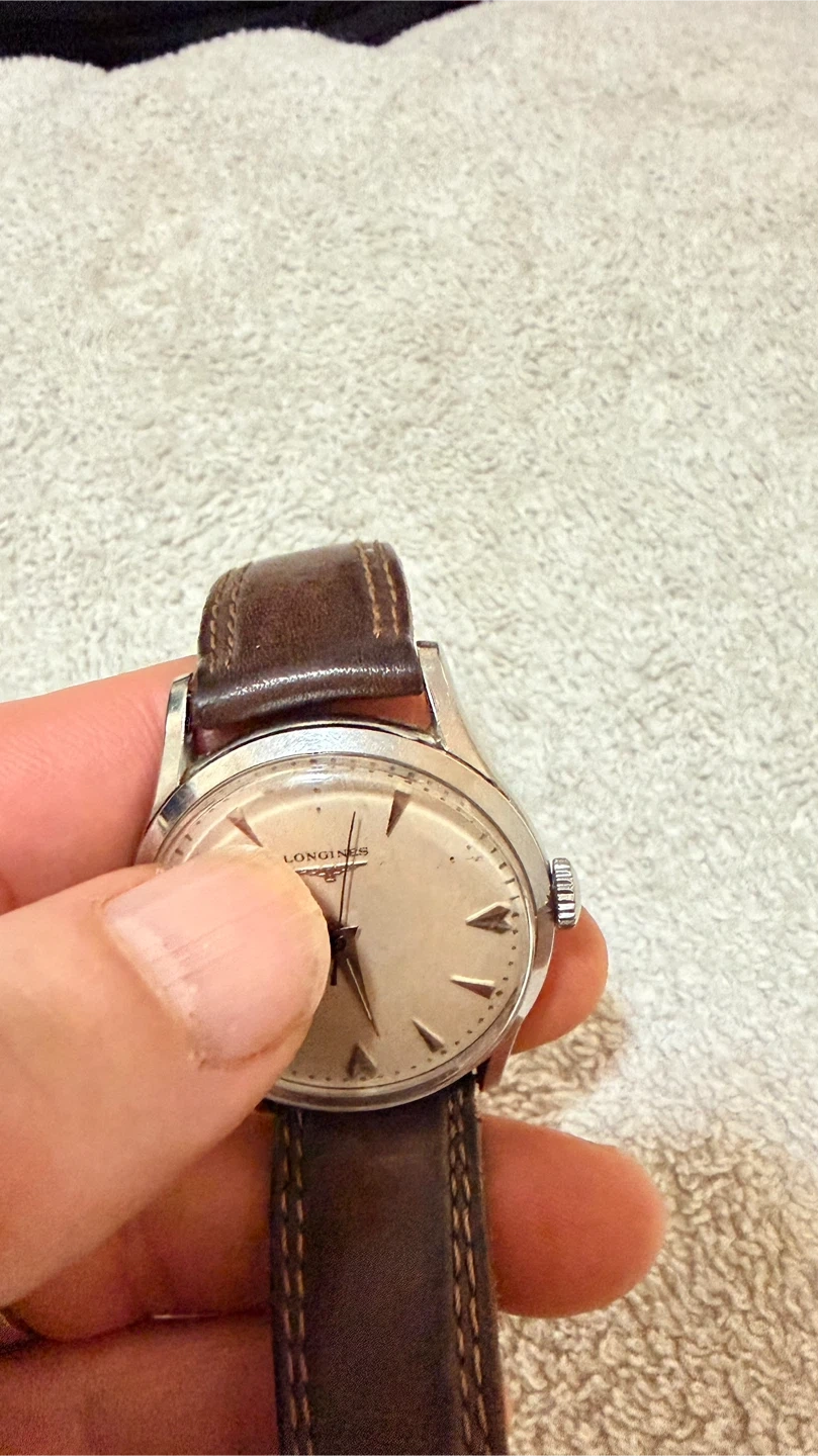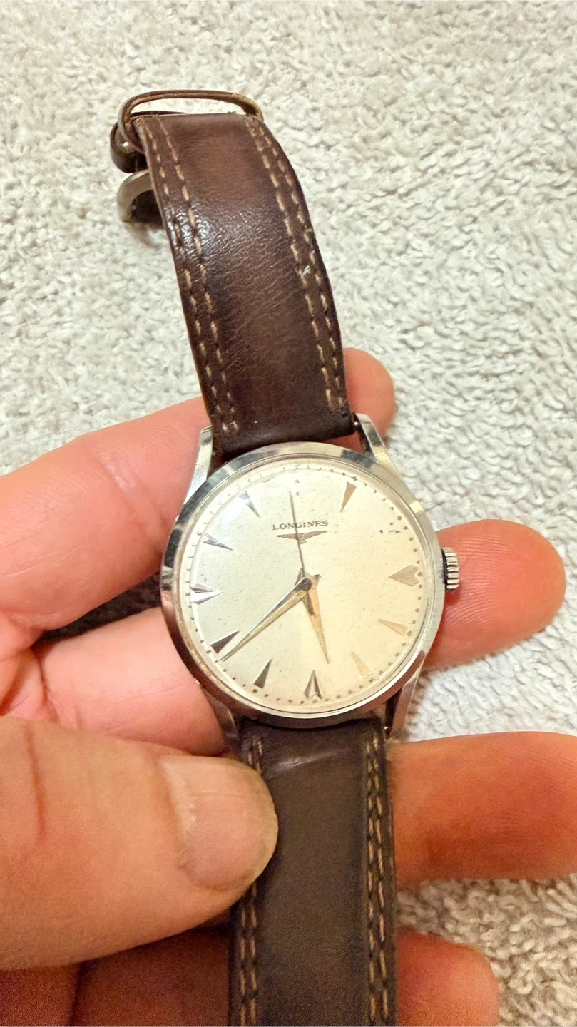 Selling a vintage SELF WINDING Longines watch probably in 1970 ish with a brown leather strap. The watch shows some signs of wear, consistent with its age, but it still looks great! It's a classic timepiece perfect for any watch enthusiast. Still working well. Missing the no:12 and 2 dials . Sale as is. Just paid $50 to cleaned inside of movement.